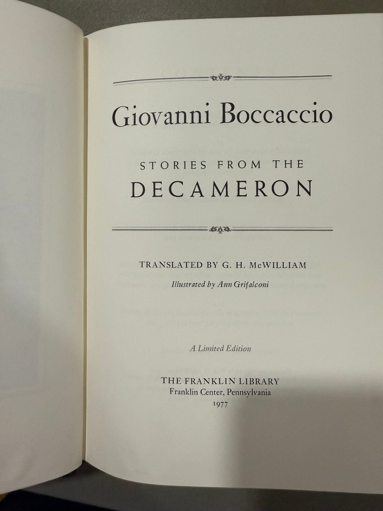 Giovanni Boccaccio Franklin Library Collected Stories of the World's Greatest Writers Series Good Plus Condition ! Water Stains!!! New Books get listed daily !!! 100s of Easton Press and Franklin Library books available!! All books get cleaned with a leather cleaner to remove any dust, odor and restore the beauty of leather!! Combined Shipping Discount: USA buyers - every book $1 off International combined shipping: 1 or 2 books - $45 3 or 4 books - $75 5 + books $17 per book 10+ books $13 per book WE SHIP DAILY!! RETURNS: Hassle-Free 30-days return policy and we pay for a return !! Check our Inventory (Link to eBay Store): http://stores.ebay.com/EastonFranklinBooks