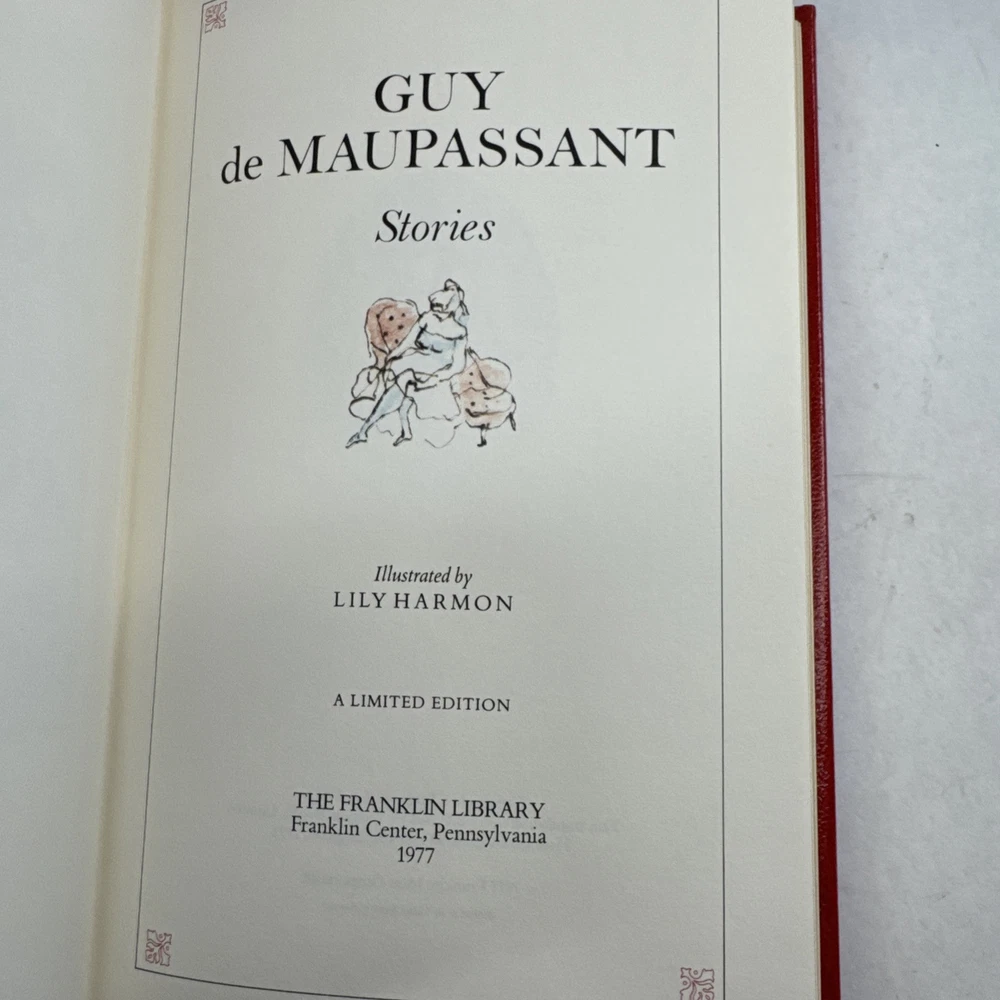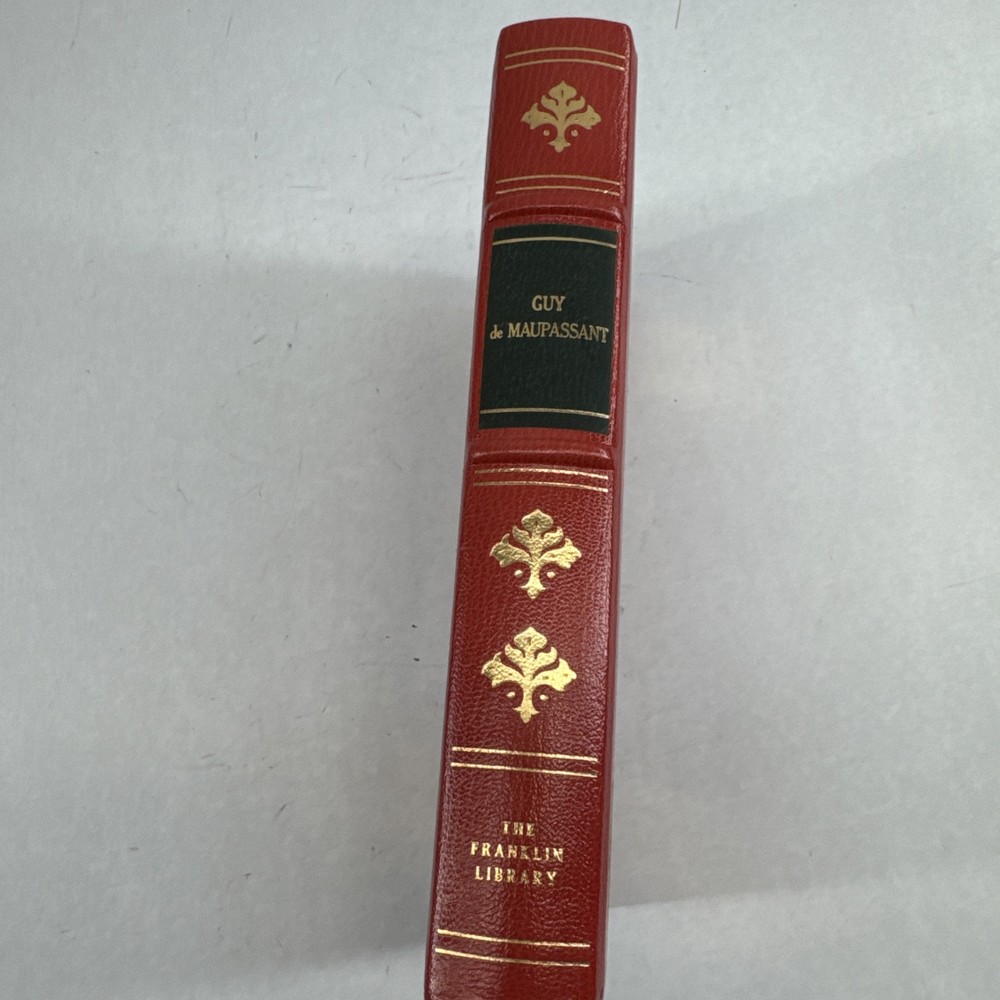 A Franklin Library edition of Guy De Maupassant's Collected Stories, featuring leather binding and written in English. This antique and collectible book was published by the Franklin Library in the United States.