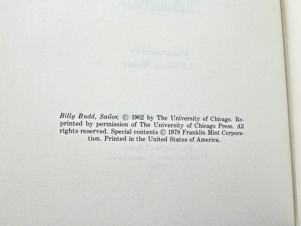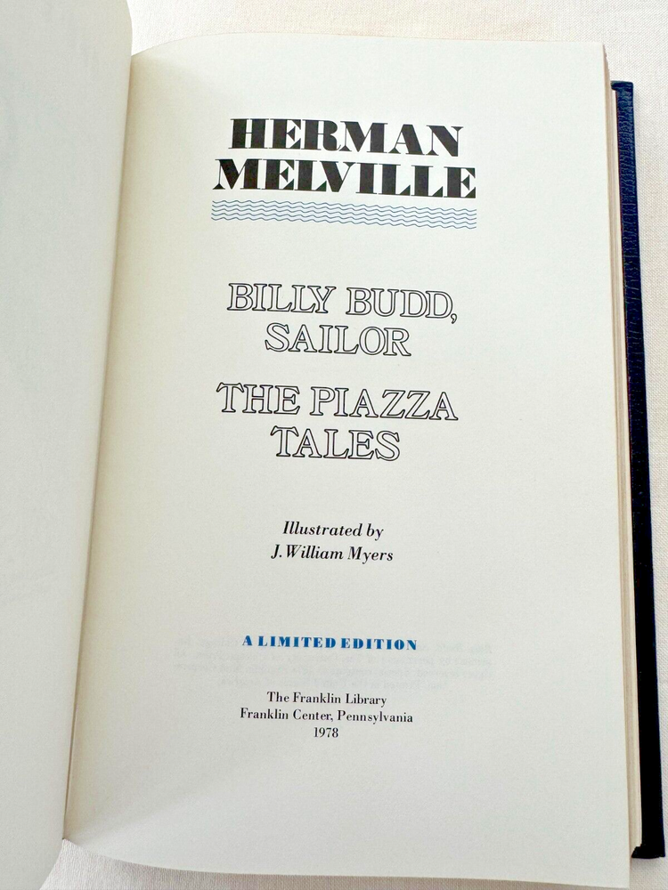 From the Franklin Library World's Greatest Writers Collection... Billy Budd, Sailor The Piazza Tales by Herman Melville Illustrated by J. William Myers Copyright 1978 by The Franklin Library Premium Full Leather Binding This volume contains all of these classic Franklin Library trimmings: Premium Leather Binding Silk Moire Endleaves Distinctive Cover Design Hubbed Spine, Accented in Gold Satin Ribbon Page Marker Gilded Page Edges Long-lasting, High Quality Acid-neutral Paper Beautiful Illustrations A very scarce title in any condition, this 1978 edition is in Absolute Mint and Unread condition. The front and back covers are in Perfect condition and the gilded page edges show hardly any wear at al! There are no markings, bookplates, or other signs of prior ownership in this book. This World's Greatest Writers Edition was published by The Franklin Library and would be a beautiful addition to your Franklin Library book collection. Overall, this copy is a grade collector's book. This book is very elusive in this superior condition, as only a limited number of them were ever published, so now is the time to act. Hopefully you can add this book to your collection and enjoy it in the years to come... Please Email Me With Any Questions You Might Have! Shipping Info: Buyer to Pay Shipping and Handling International Bidders Pay Extra Shipping Good luck and happy bidding!