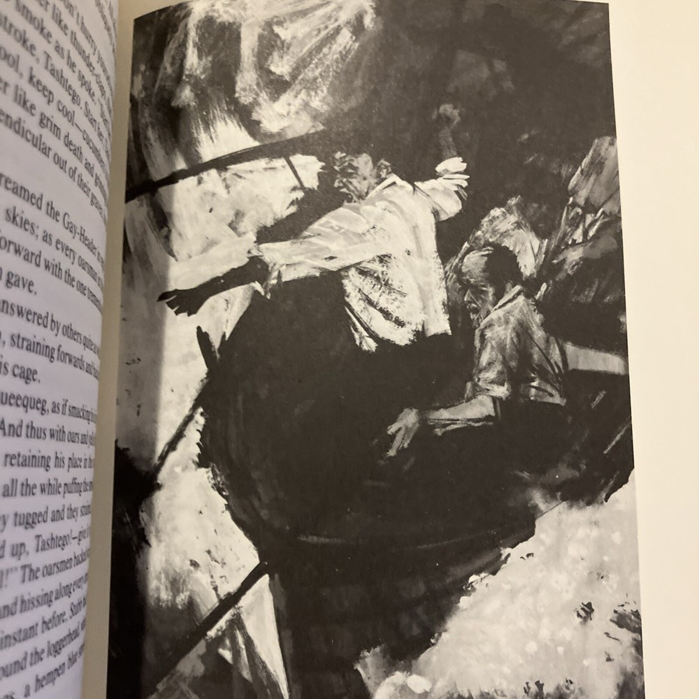 Franklin Library leather edition of Herman Melville's "Moby Dick or the Whale," a Limited edition, published in 1984. Bound in hunter green leather, the book has French moire silk end leaves, acid-free paper, Symth-sewn binding, a satin book marker, hubbed spine, gold gilding on three edges---in near FINE condition---except for 'moderate' fading on edges of moire silk and minor imperfection to gilt on fore edge. Herman Melville, who lived from 1819-1891, was born in New York City, the son of a cultivated gentleman who went bankrupt. Young Herman's schooling ended when he was 15, and after clerking in a NY bank, farming and teaching, he shipped as a cabin-boy to Liverpool in 1839. Later he sailed on the ACUSHNET for the SOUTH SEA, and this 18-month voyage provided a factual basis for "Moby Dick." Having completed his education in what he later termed "the only HARVARD and YALE" that were open to me, he began writing. "Moby Dick" opens with classic line: "Call me Ishmael. . . Whenever I find myself growing grim about the mouth; whenever it is a damp drizzly November in my soul. . .I count it high time to get to sea as soon as I can. This is my substitute for pistol and ball." "What of it, if some old hunks of a sea-captain orders me to get a broom and sweep down the decks? What does that indignity amount to, weighed, I mean, in the scales of the new Testament?" Ishmael goes to NEW BEDFORD where he signs for a voyage on the whaler PEQUOD, drawing as his roommate QUEEQUEP, a Polynesian prince. The two become comrades. After hearing a symbolic sermon by FATHER MAPPLE, they join their ship, which leaves NANTUCKET on Christmas Day. The captain, AHAB, is a monomaniac whose one purpose is to capture the fierce, cunning white whale, MOBY DICK, which had torn away his leg during their last encounter. Others in the crew included: Fedallah, the American Indian harpooner, Tashtego; the African, Daggoo, the Negro cabin boy, Pip. The voyage carries the Pequod nearly around the world. "The ship, like Satan, would not sink to hell till she had dragged a living part of heaven along with her, and helmeted herself with it. . ." Ishmael---like Yossarian in Joseph Heller's "Catch 22"--- survives! The Epilogue quotes Job: "And I only am escaped alone to tell thee." 527 pages. I offer Combined shipping.