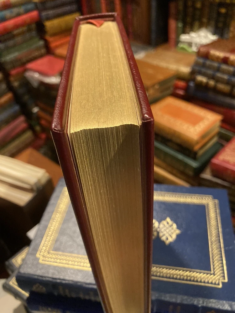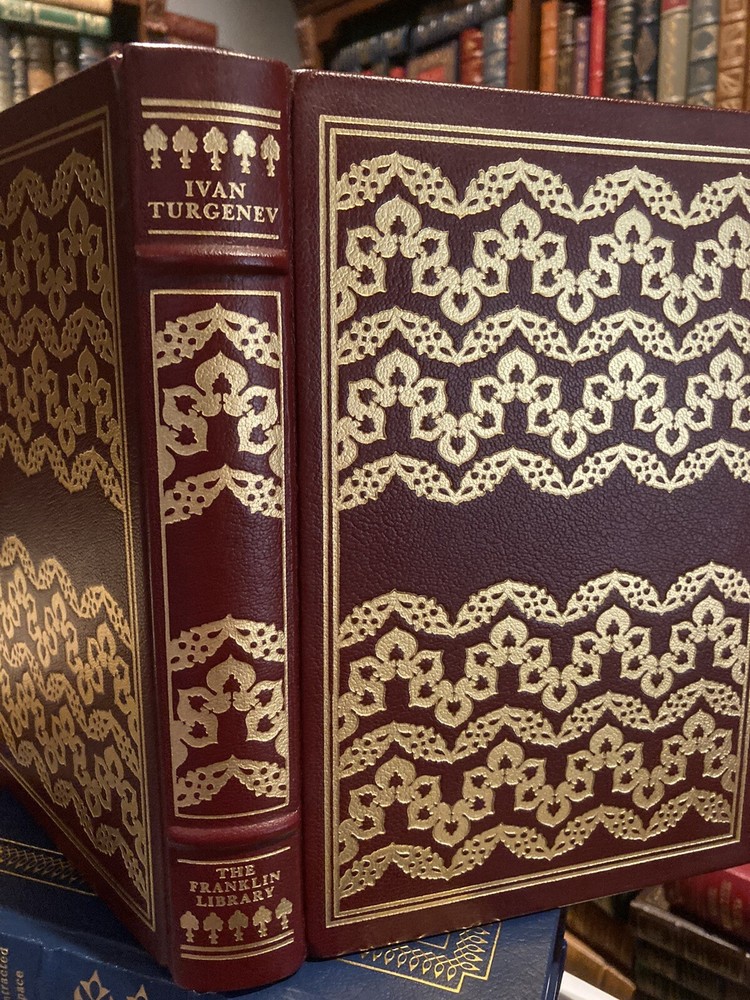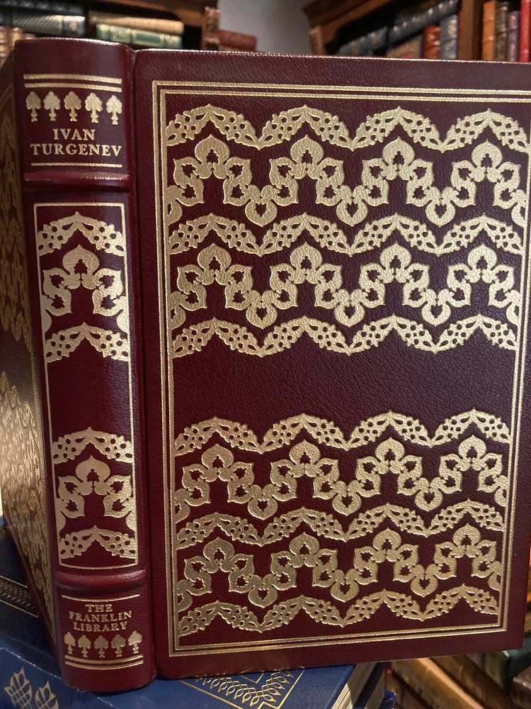 Franklin Library leather edition Ivan Turgenev's "First Loveo and Other Tales," Translated from the Russian by David Magarshack, a Limited edition, Illustrated by Joseph Isom, one of the COLLECTED STORIES OF THE WORLD'S GREATEST WRITERS series, published in 1978. Bound in burgundy leather, the book has matching moire silk end leaves, acid-free paper, Symth-sewn binding, a satin book marker, hubbed spine, gold gilding on three edges---in near FINE condition. Ivan Sergeyevich Turgenev, who lived from 1818---1883, was a Russian novelist, short story writer, and playwright. Stories include: "The Singers," "Bezhin Meadow," "Mumu," "Assya," "First Love," "Knock. . .Knock . . .Knock. . .," "Living Relics," and "Clara Milich." 388 pages. I offer Combined shipping.