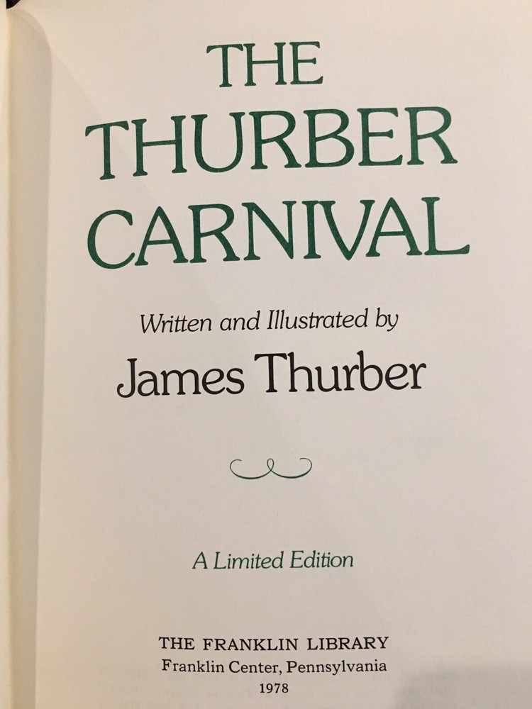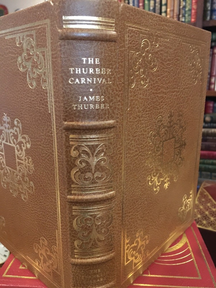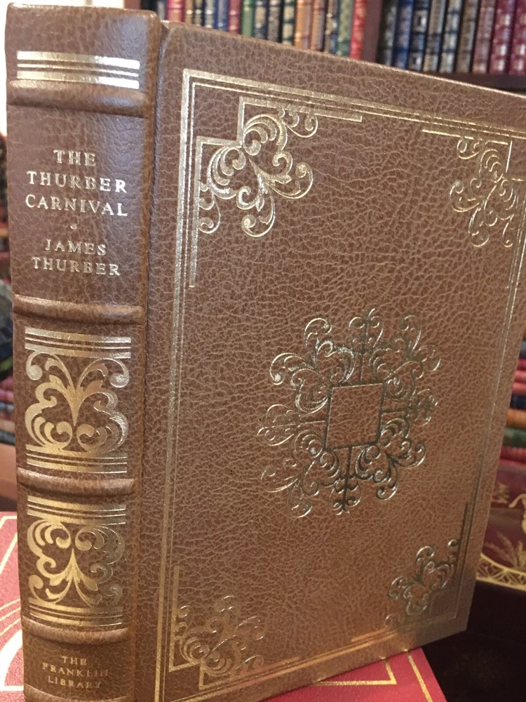 Franklin Library leather edition of James Thurber's "The Thurber Stories," a Limited edition, Illustrated by James Thurber, one of the 100 GREATEST MASTERPIECES OF AMERICAN LITERATURE series, published in 1978. Bound in deep tan leather, the book has camel tan French moire silk end leaves, acid-free paper, a satin book marker, Symth-sewn binding, gold gilding on three edges---in near FINE condition. James Grover Thurber, who lived from 1894-1961, was an American cartoonist, author, humorist, journalist, playwright, and celebrated wit. Thurber was best known for his cartoons and short stories such as "The Catbird Seat," and "The Secret Life of Walter Mitty." His stories were frequently published in the NEW YORKER Magazine. His stories celebrated the comic frustrations and eccentricities of ordinary people. 403 pages. I offer Combined shipping.