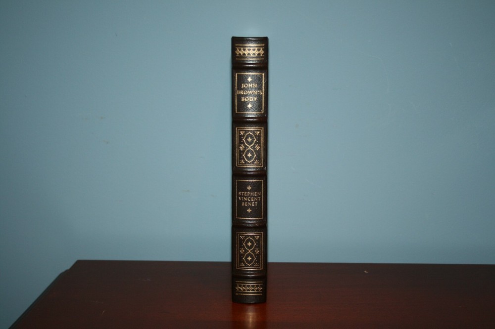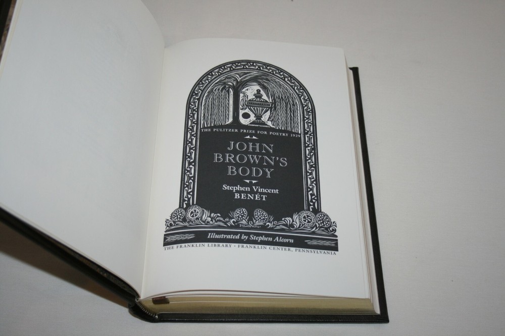 From the Franklin Library Pulitzer Prize Collection... John Brown's Body by Steven Vincent Benet Illustrated by Stephen Alcorn Copyright 1986 by The Franklin Library Premium Full Leather Binding This volume contains all of these classic Franklin Library trimmings: Premium Leather Binding Decorated Endleaves Distinctive Cover Design Hubbed Spine, Accented in Gold Satin Ribbon Page Marker Gilded Page Edges Long-lasting, High Quality Acid-neutral Paper Beautiful Illustrations A very scarce title in any condition, this copy is in Absolute Mint and Unread condition. The front and back covers are in Perfect condition and the gilded page edges show no wear at all! (see pictures) Aside from a blindstamp on the first page, t here are no markings, bookplates, or other signs of prior ownership in this book. This Pulitzer Prize Edition was published by The Franklin Library and would be a beautiful addition to your Franklin Library book collection. Hopefully you can add this book to your collection and enjoy it in the years to come... John Brown's Body is an epic American poem written by Stephen Vincent Benet. Its title references the radical abolitionist John Brown, who raided Harpers Ferry in Virginia in the fall of 1859. He was captured and hanged later that year. Benet's poem covers the history of the American Civil War. It won the Pulitzer Prize in 1929. Please Email Me With Any Questions You Might Have! Shipping Info: Buyer to Pay Shipping and Handling International Bidders Pay Extra Shipping Seller Not Responsible For Uninsured Items Lost or Damaged in Mail Forms of Payment Accepted: Paypal Good luck and happy bidding! Powered by eBay Turbo Lister The free listing tool. List your items fast and easy and manage your active items.