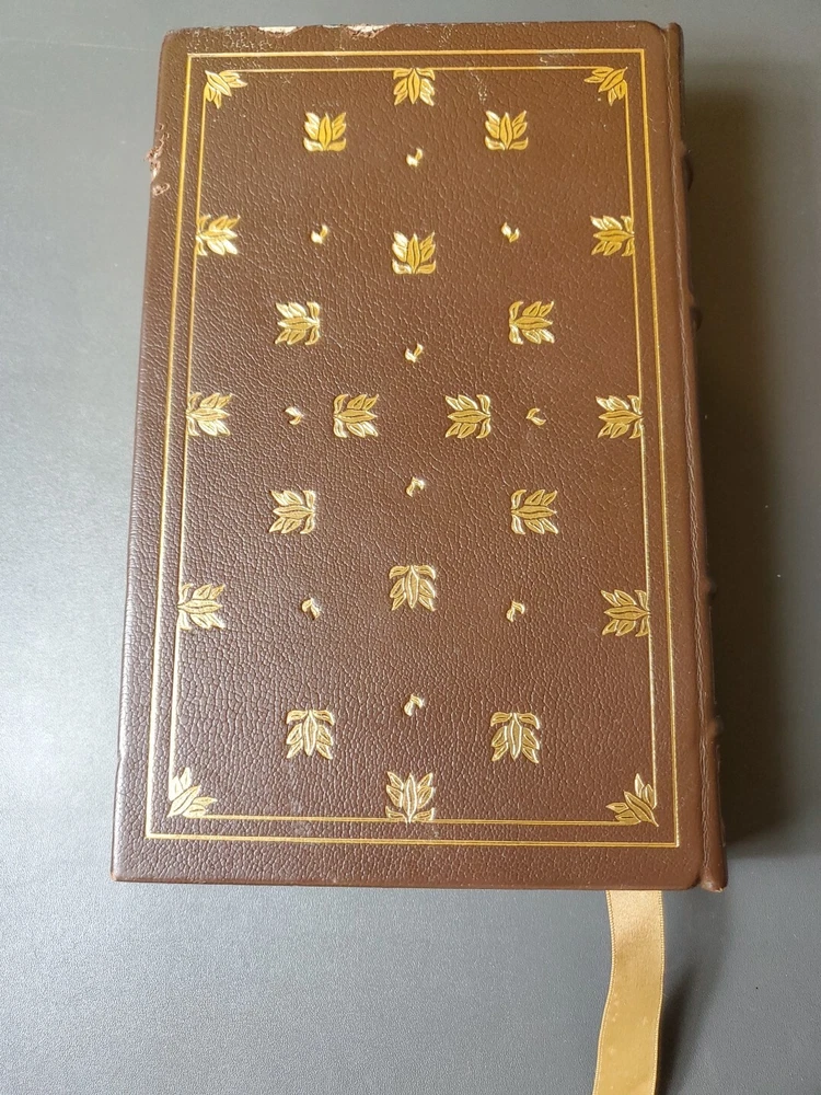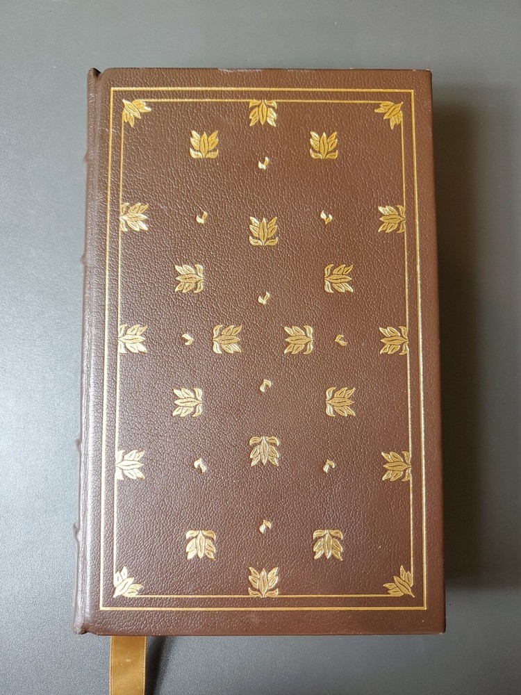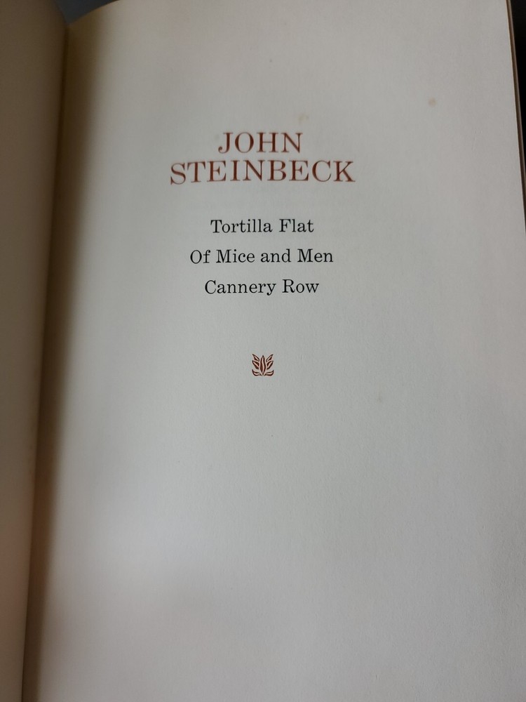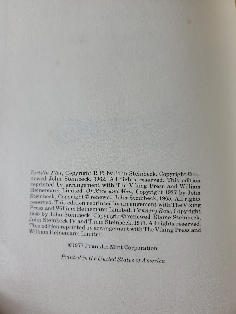 A luxury edition Franklin Library book featuring three novels by John Steinbeck: "Tortilla Flat," "Of Mice and Men," and "Cannery Row." This English language book, illustrated by Herbert Tauss, focuses on characters from Monterey, California like Danny and Doc Ricketts. Published in 1977 by Franklin Library Collected Writers in the United States, this leather-bound book is a collectible piece for literature and fiction enthusiasts.