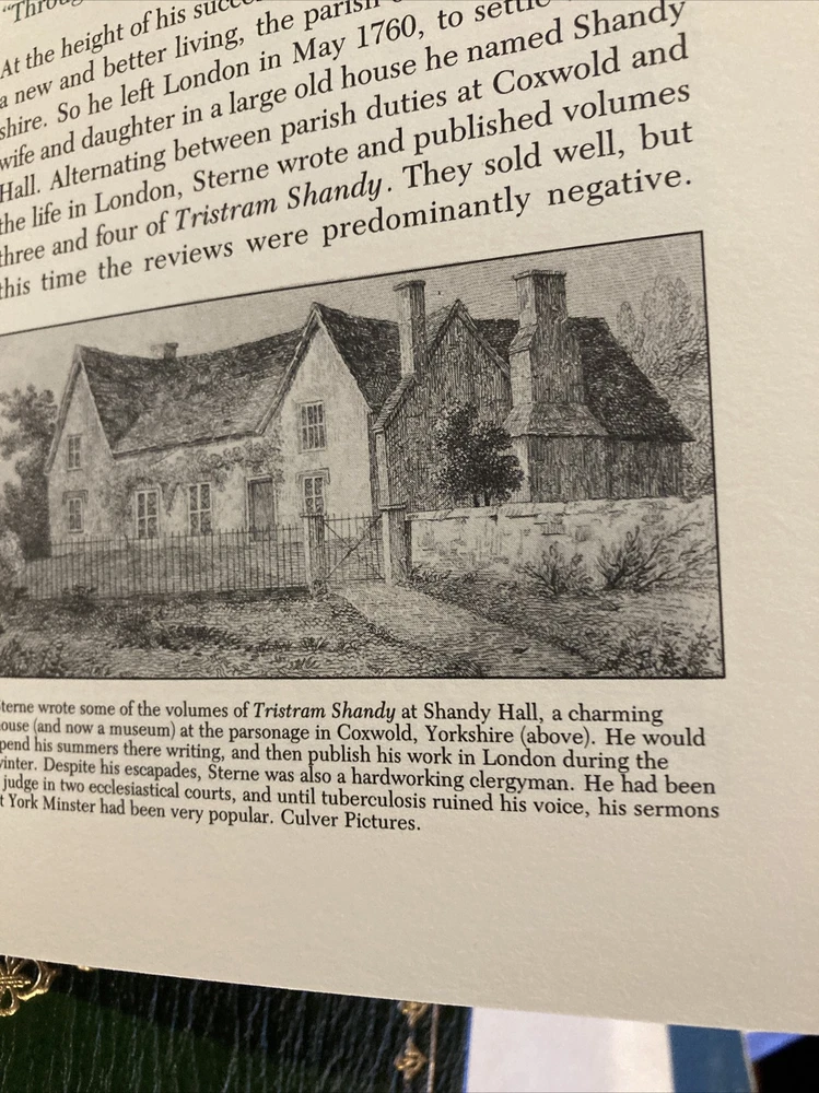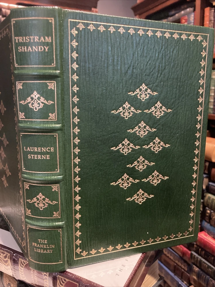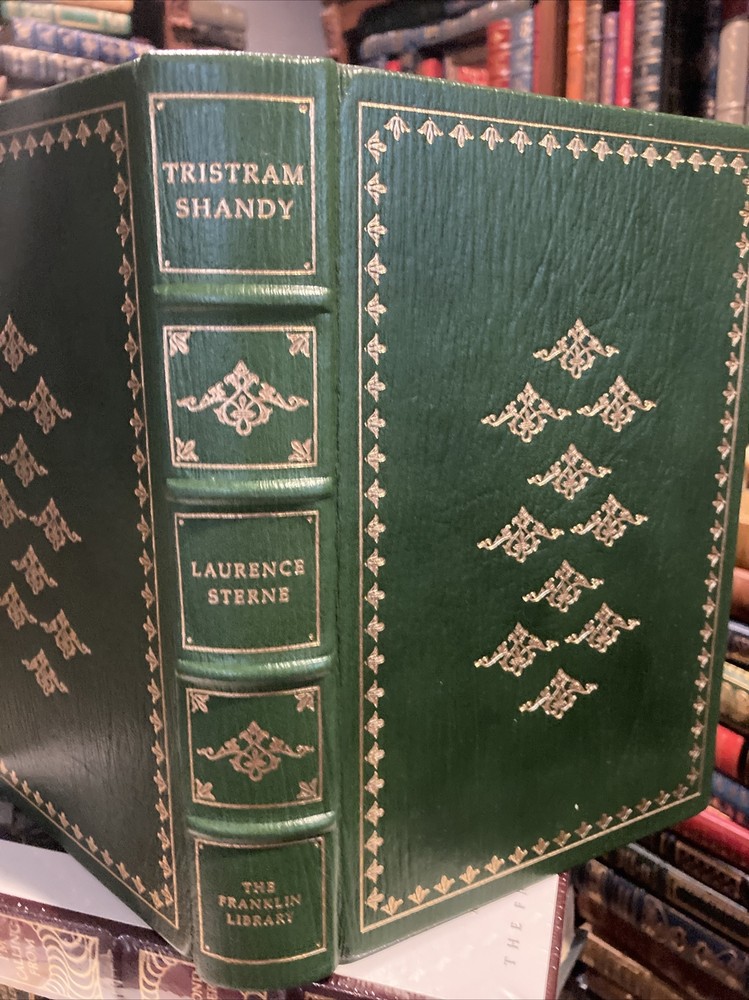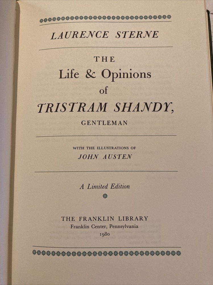 Franklin Library leather edition of Laurence Sterne's "The Life and Opinions of Tristram Shandy Gentleman," a Limited edition, Illustrated by John Austen, one of the 100 GREATEST BOOKS OF ALL TIME series, published in 198. Bound in hunter green leather, the book has matching French moire silk end leaves, acid-free paper, Symth-sewn binding, a satin book marker, hubbed spine, gold gilding on three edges---in near FINE condition. Laurence Sterne, who lived from 1713-1768, was a graduate of Jesus College, CAMBRIDGE, where he entered as a work-scholarship student. Here, he read RABELAIS, who was to be an enormous influence on his later writing. Leaving college in debt and in need of making a living, Sterne, like many young men of his generation, entered the church. He married Elizabeth Lumley. Besides preaching in two parishes, Sterne farmed, gardened, and hunted. He also painted and played the violin and cello. "Tristram Shandy" was first published in 1759. Sterne's own father was the model for Tristram's eccentric philosopher-father. In mixing sentiment, irrationality, voyeurism, and freedom of spirit, Sterne formulated a mode of behavior that has come to be known as "Shandean." Tristram believed that his 'eccentric' behavior occurred at his "moment of conception," when his mother asked his father, "What time is it"? His characters sit around and talk, digress, reminisce, ride their individual "hobbyhorses." Yet, amazingly, their concerns touch all of life. Sterne delighted in puns, often off-color ones, double entendres, and in burlesquing conventions. Sterne is Parson Yorick, a jester, out "to do the world some good if he can." 524 HILARIOUS pages! I offer combined shipping.