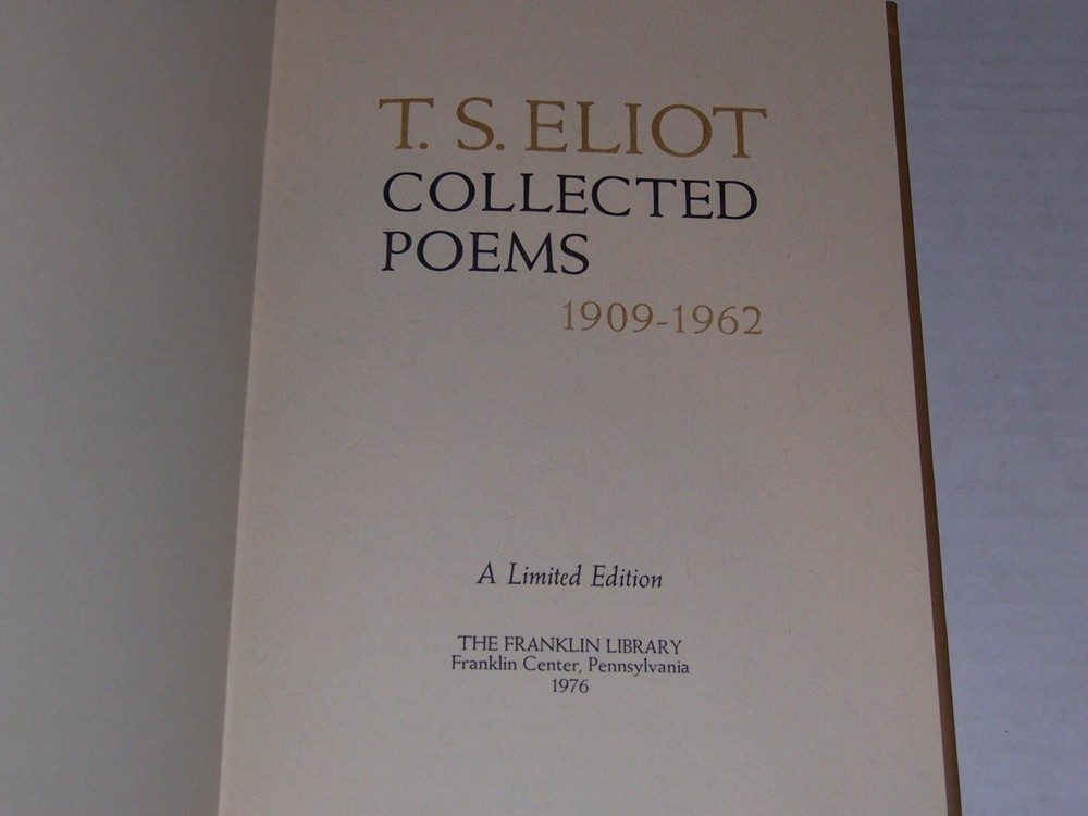 Books from Franklin Library Bound in premium leathers, distinctive cover design, hubbed spine accented in 22-karat gold Endsheets of moire, permanent satin ribbon page marker Thread sewn pages for strength and durability, gilded page edges for beauty and protection Handsome readable typefaces, beautiful illustrations, archival-quality acid-neutral paper TITLE Collected Poems (1909-1962) AUTHOR T.S. Eliot MORE DETAILS Exclusively Published by Franklin Library for Subscribers to the Limited Edition of THE 100 GREATEST BOOKS OF ALL TIME A Limited Edition the portrait of Eliot is the work of Bernard Fuchs DESCRIPTION this book is in like new and unread condition: binding is tight, crisp & bright inside pages, and solid hardcover. SHIPPING Book(s) will be packed safely, and shipped via USPS Media Mail with tracking number.