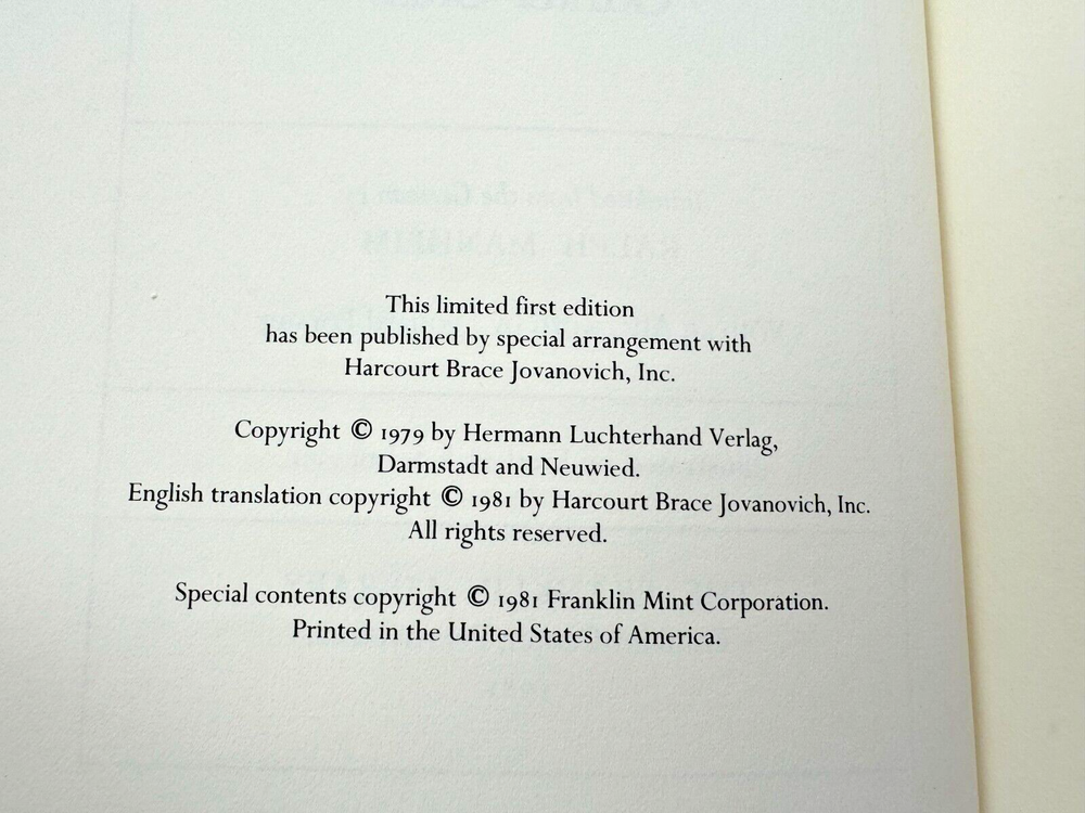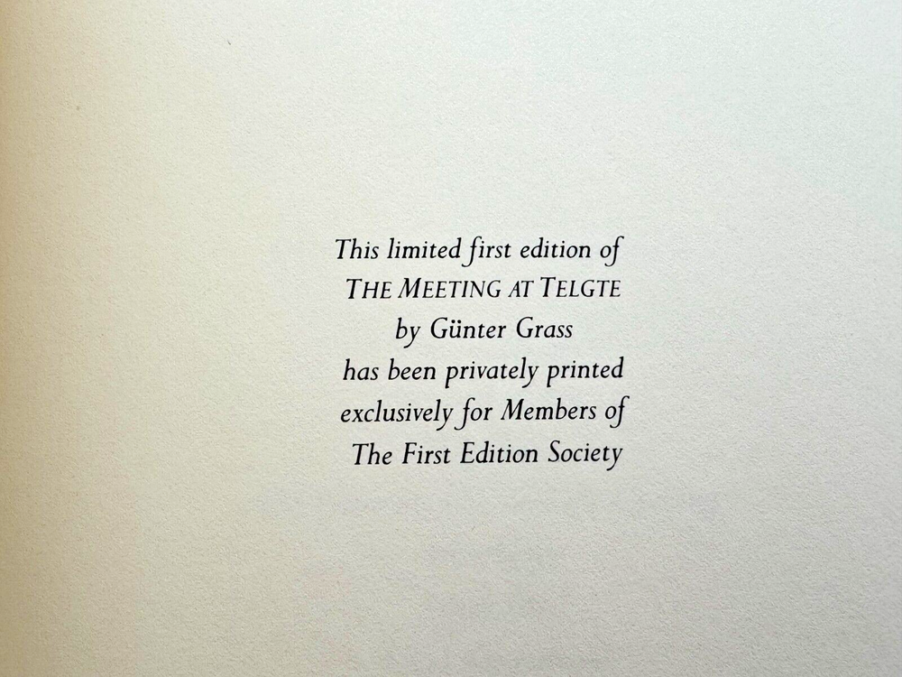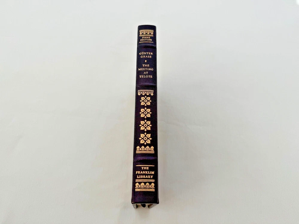 From the Franklin Library First Edition Society Collection... The Meeting at Telgte by Gunter Grass Illustrated by Frederick Schneider Copyright 1981 by The Franklin Library A Limited Edition Premium Full Leather Binding This volume contains all of these classic Franklin Library trimmings: Premium Leather Binding Silk Moire Endleaves Distinctive Cover Design Hubbed Spine, Accented in Gold Satin Ribbon Page Marker Gilded Page Edges Long-lasting, High Quality Acid-neutral Paper Beautiful Illustrations A very scarce title in any condition, this 1981 Limited First Edition is in Mint and Unread condition. The front and back covers are in Perfect condition with very minor wear on the bottom board edges and the gilded page edges show no wear at all! The binding is tight and square without spine lean. There are no markings, bookplates, or other signs of prior ownership in this book. This book is part of the First Edition Society collection published by the Franklin Library and comes complete with the Notes from the Editors. It would be a beautiful addition to your Franklin Library book collection. Overall, this copy is a grade collector's book. This book is very elusive in this superior condition, as only a limited number of them were ever published, so now is the time to act. Hopefully you can add this book to your collection and enjoy it in the years to come... Please Email Me With Any Questions You Might Have! Shipping Info: Buyer to Pay Shipping and Handling International Bidders Pay Extra Shipping Good luck and happy bidding!