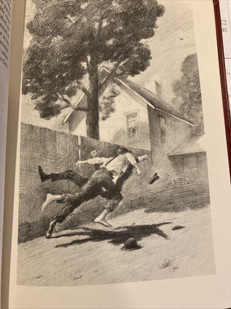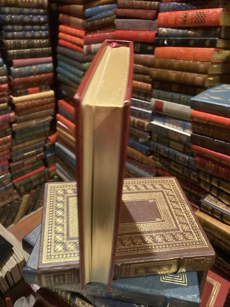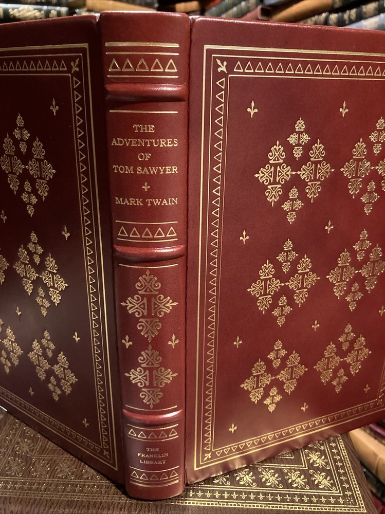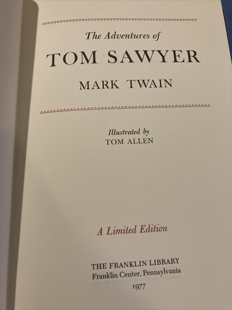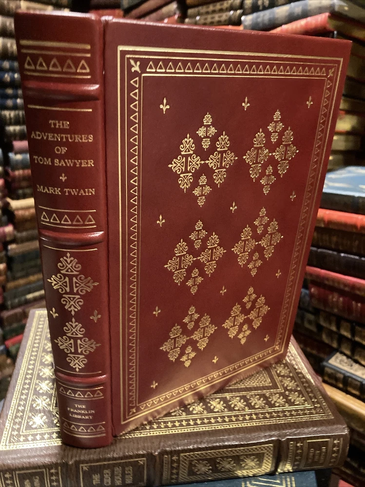 Franklin Library edition of Mark Twain's "The Adventures of Tom Sawyer," a Limited edition, Illustrated by Tom Allen, published in 1977. Bound in deep red leather, the book has burgundy moire silk end leaves, acid-free paper, Symth-sewn binding, a satin book marker, hubbed spine---in near FINE condition. Samuel Langhorne Clemens, who lived from 1835 – 1910, and better known by his pen name Mark Twain, was an American author and humorist, reared in HANNIBAL, MISSOURI. In the drowsy Mississippi River town of St. Petersburg, Missouri, Tom Sawyer, imaginative and mischievous, and his priggish brother, Sid, life with simple, kind-hearted AUNT POLLY. Sid 'peaches' on Tom for playing hookey, and Tom is punished by being made to whitewash a fence, but ingeniously leads his friends to do this job for him, by pretending it is a privilege. When his sweetheart, BECKY THATCHER is angered because Tom reveals that he has previously been in love, he forsakes a temporary effort at virtue, plays hookey, and decides to become a pirate or a ROBIN HOOD. With his boon companion HUCK FINN, a good-natured, irresponsible river-rat, Tom goes to a graveyard at midnight to swing a dead cat--- an act that Huck says is a cure for warts---- and there they watch INJUN JOE, a half-breed criminal, stab the town doctor to death. . . Tom, Huck, and JOE HARPER, hide on nearby Jackson's island. Later when Injun Joe is found dead, Tom and Huck inherit his treasure. The novel concludes with these lines: "So endeth this chronicle. It being strictly a history of a boy, it must stop here. . .most of the characters in this book still live and are prosperous and happy." 265 pages----a GORGEOUS title. I offer combined shipping.