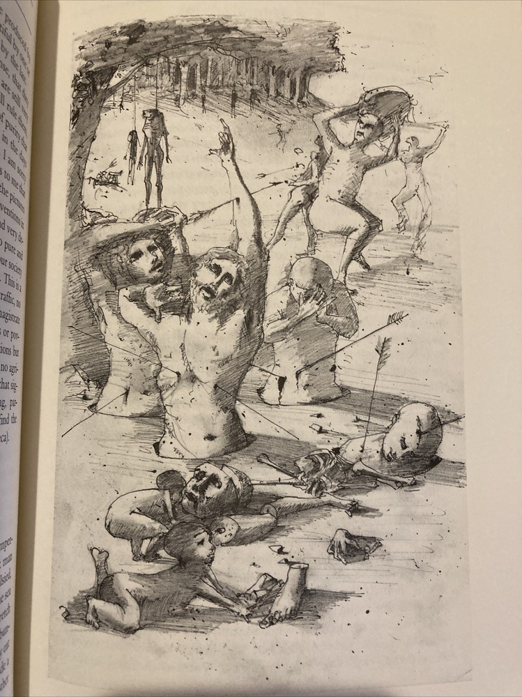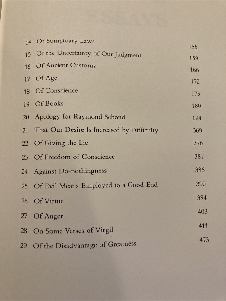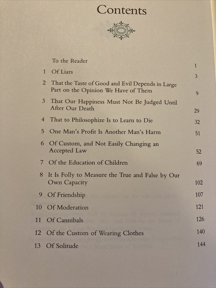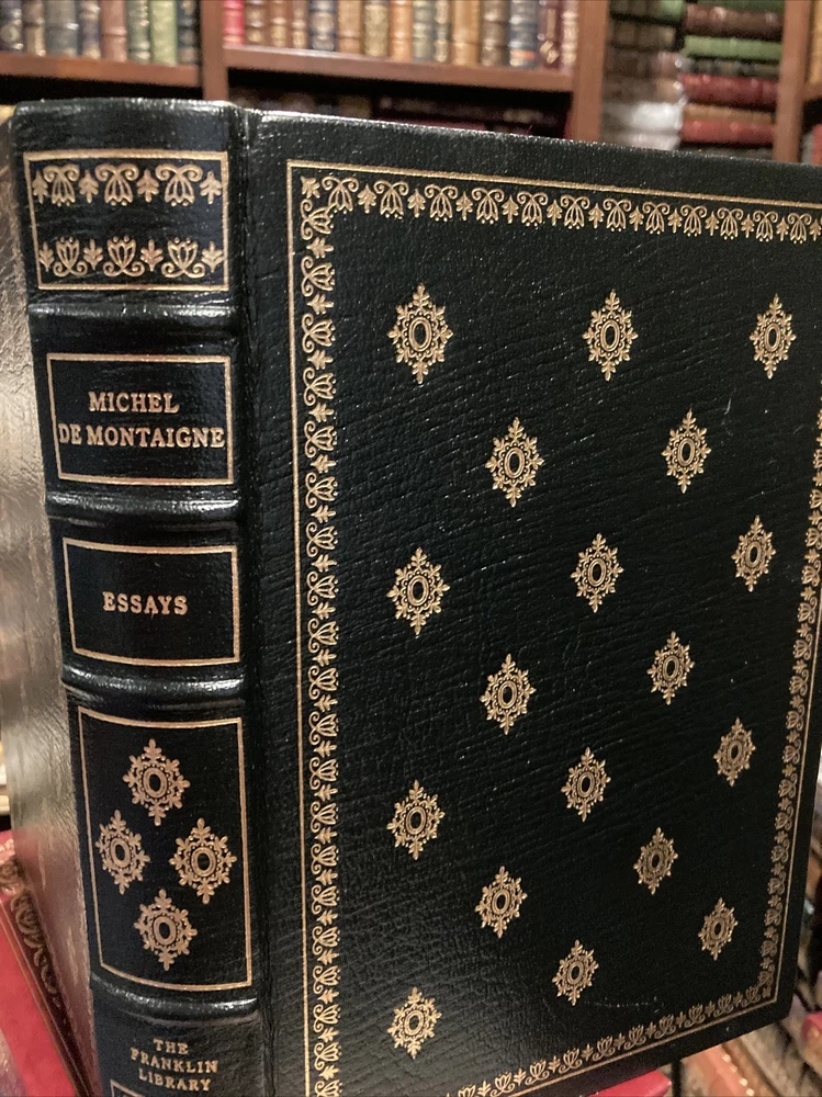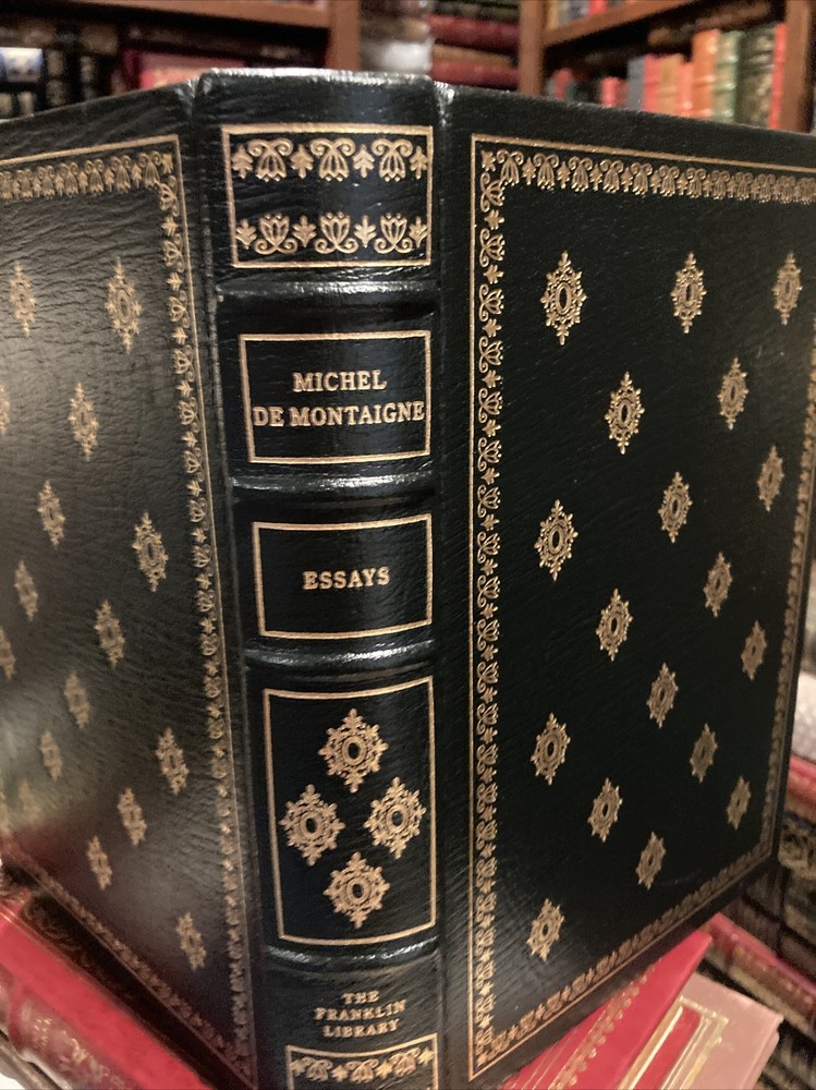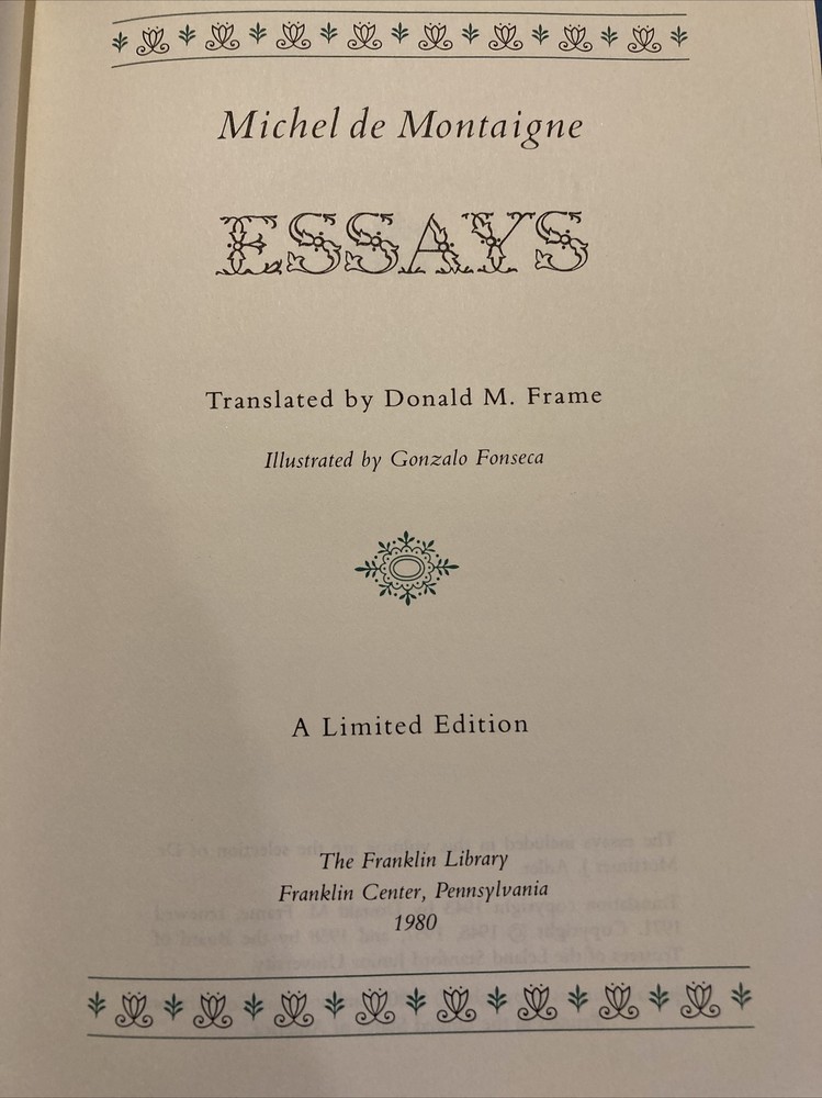 Franklin Library leather edition of Michel de Montaigne's "Essays," Translated by Donald M. Frame, Illustrated by Gonzalo Fonseca, a limited edition, one of the 100 GREATEST BOOKS OF ALL TIME series, published in 1980. Bound in hunter green leather, the book has matching moire silk end leaves, Symth-sewn binding, a satin book marker, acid-free paper, hubbed spine, gold gilding on three edges---in near FINE condition. Michel de Montaigne, who lived from 1533---1592, was educated at Bordeaux, France. "Essays" reveal the author as a man of insatiable intellectual curiosity, kindly and sagacious, condemning pedantry and lying, but tolerant of an easy morality. After the premature death of his friend La Boetie, he is much preoccupied with the subject of death. The general conclusion of the essays, embodied in his famous question, 'Que sais-Je', is the recognition of the fallibility of human reason and the relativity of human science. Some of the essays include: "Of Liars," "Of the Education of Children," "Of Moderation," "Of the Custom of Wearing Clothes," "Of Solitude," "Of Sumptuary Laws," "Of Age," "Of Giving the Lie," "Of Virtue," "Of Anger," "On the Disadvantages of Greatness," "On Some Verses of Virgil," "Of Ancient Customs," "One Man's Profit Is Another Man's Harm," "Of Friendship," "Of Cannibals," "Of Books," "Against Do-nothingness," "That Our Happiness Must Not Be Judged Until After Our Death," "Of Custom, and Not Easily Changing an Accepted Law," and my favorite: "That the Taste of Good and Evil Depends in Large Part on the Opinion We Have of Them." 477 pages. I offer Combined shipping.