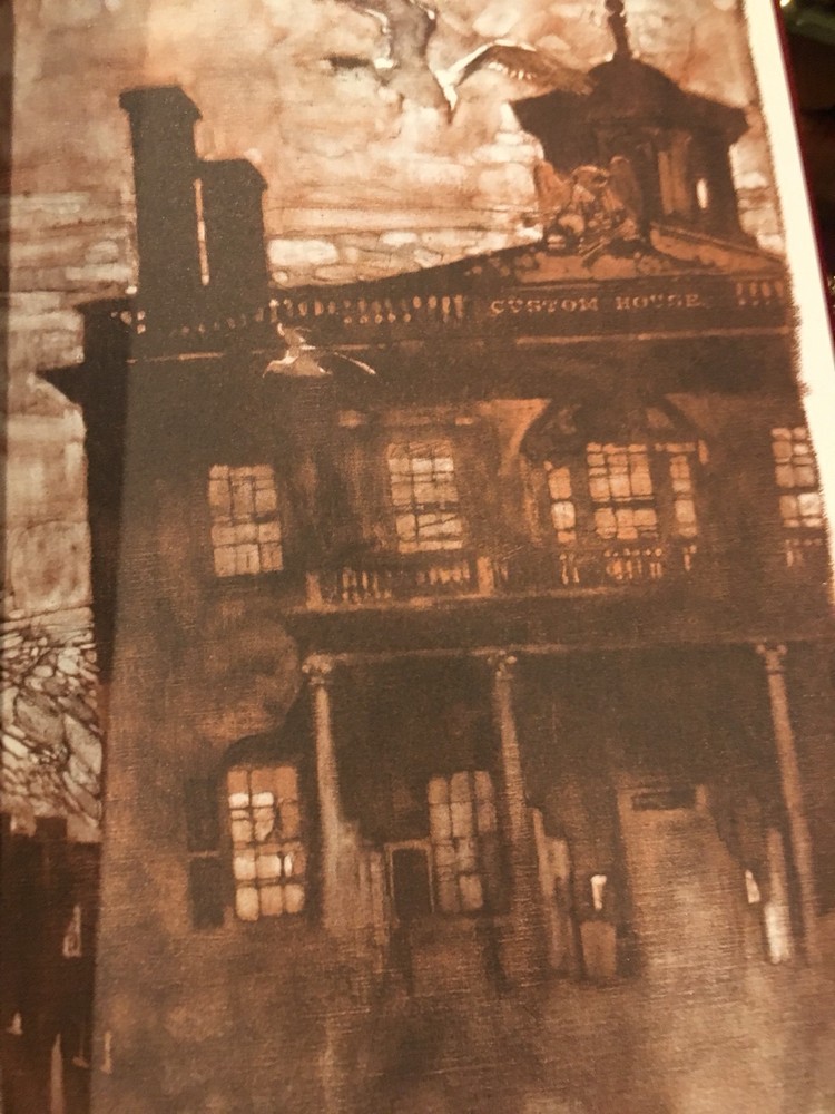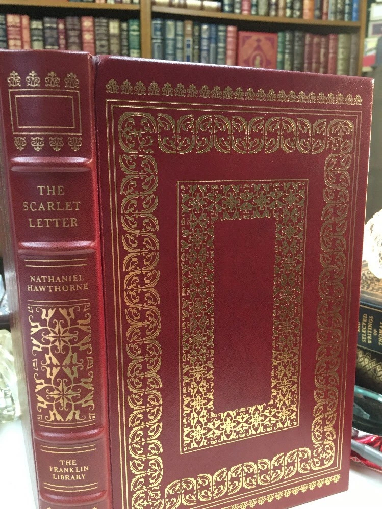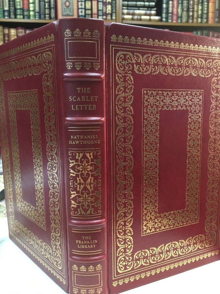 Franklin Library leather edition of Nathaniel Hawthorne's "The Scarlet Letter: A Romance," Illustrated by Bernard Fuchs, one of the The 100 GREATEST MASTERPIECES OF AMERICAN LITERATURE series, published in 1976. Bound in scarlet red leather, the book has brown French moire silk end leaves, acid-free paper, symth-sewn binding, hubbed spine, acid-free paper, a satin book marker, Symth-sewn binding, gold gilding on three edges---in near FINE condition---except for 'moderate/major' rubs on bottom gilt. Nathaniel Hawthorne, who lived from 1804-1864, was born at SALEM, MASSACHUSETTS, to a prominent Puritan family whose ancestors included a judge at the Salem witchcraft trials. During his childhood he read extensively in the poets and romances and spent an impressionable year at a remote lake in Maine, after which he attended and graduated from BOWDOIN COLLEGE in 1825. "The Scarlet Letter" is set in Puritan Boston in the mid-17th century. In the author's second preface, a reviewer wrote: "The Scarlet Letter" has created an unprecented excitement in the respectable community. It could hardly have been more violent, indeed had he burned down the Custom-House, and quenched its lasting smoking ember in the blood of a certain venerable personage, against whom he is supposed to cherish a perculiar malevolence. An aged English scholar sends his young wife, HESTER PRYNNE, to establish their home in Boston. When he arrives two years later, he finds Hester in the pillory with her illegitimate child in her arms. She refuses to name her lover and is sentenced to wear a SCARLET A, signifying ADULTRESS, as a token of her sin. The husband conceals his identity, assumes the name of ROGER CHILLINGWORTH, and in the guise of a doctor seeks to discover her paramour. Hester is ostracized by the community, but she becomes an "angel of mercy," serving others. Ultimately, Chillingworth discovers that the REVEREND ARTHUR DIMMESDALE, a saintly young minister is the father of Hester's beautiful, mischievous child, PEARL. Rev. Dimmesdale has struggled for years with his burden of hidden guilt, but though he does secret penance, pride prevents him from confessing publicly, and he is tortured by his conscience. If Dimmesdale had confessed his sexual sin, he would have lost his job as minister and would have been permanently unemployed. Hester wishes to flee to Europe with her lover, but he refuses the plan as a temptation from the Evil One, and ultimately makes a confession on the pillory in which Hester had once been placed. Hester, with her open confession, survives. . .the men do not fare as well. 285 pages. I offer Combined shipping.