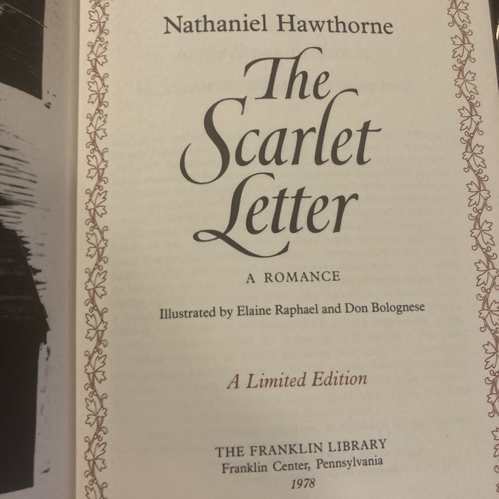 Franklin Library leather edition of Nathaniel Hawthorne's "The Scarlet Letter: A Romance," Illustrated by Elaine Raphael and Don Bolognese, one of the 100 GREATEST BOOKS OF ALL TIME series, published in 1978. Bound in brown leather, the book has brown French moire silk end leaves, acid-free paper, symth-sewn binding, hubbed spine, acid-free paper, a satin book marker, Symth-sewn binding, gold gilding on three edges---in near FINE condition---except for 'very faint' shadow where a bookplate was cleanly removed on credits pag---more felt than seen! Nathaniel Hawthorne, who lived from 1804-1864, was born at SALEM, MASSACHUSETTS, to a prominent Puritan family whose ancestors included a judge at the Salem witchcraft trials. During his childhood he read extensively in the poets and romances and spent an impressionable year at a remote lake in Maine, after which he attended and graduated from BOWDOIN COLLEGE in 1825. "The Scarlet Letter" is set in Puritan Boston in the mid-17th century. In the author's second preface, a reviewer wrote: "The Scarlet Letter" has created an unprecented excitement in the respectable community. It could hardly have been more violent, indeed had he burned down the Custom-House, and quenched its lasting smoking ember in the blood of a certain venerable personage, against whom he is supposed to cherish a perculiar malevolence. An aged English scholar sends his young wife, HESTER PRYNNE, to establish their home in Boston. When he arrives two years later, he finds Hester in the pillory with her illegitimate child in her arms. She refuses to name her lover and is sentenced to wear a SCARLET A, signifying ADULTRESS, as a token of her sin. The husband conceals his identity, assumes the name of ROGER CHILLINGWORTH, and in the guise of a doctor seeks to discover her paramour. Hester is ostracized by the community, but she becomes an "angel of mercy," serving others. Ultimately, Chillingworth discovers that the REVEREND ARTHUR DIMMESDALE, a saintly young minister is the father of Hester's beautiful, mischievous child, PEARL. Rev. Dimmesdale has struggled for years with his burden of hidden guilt, but though he does secret penance, pride prevents him from confessing publicly, and he is tortured by his conscience. If Dimmesdale had confessed his sexual sin, he would have lost his job as minister and would have been permanently unemployed. Hester wishes to flee to Europe with her lover, but he refuses the plan as a temptation from the Evil One, and ultimately makes a confession on the pillory in which Hester had once been placed. Hester, with her open confession, survives. . .the men do not fare as well. 266 pages. I offer Combined shipping.