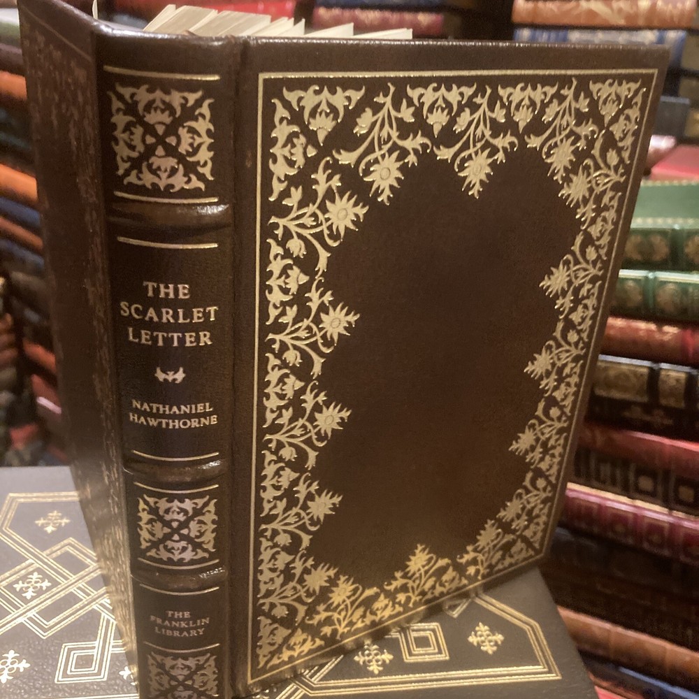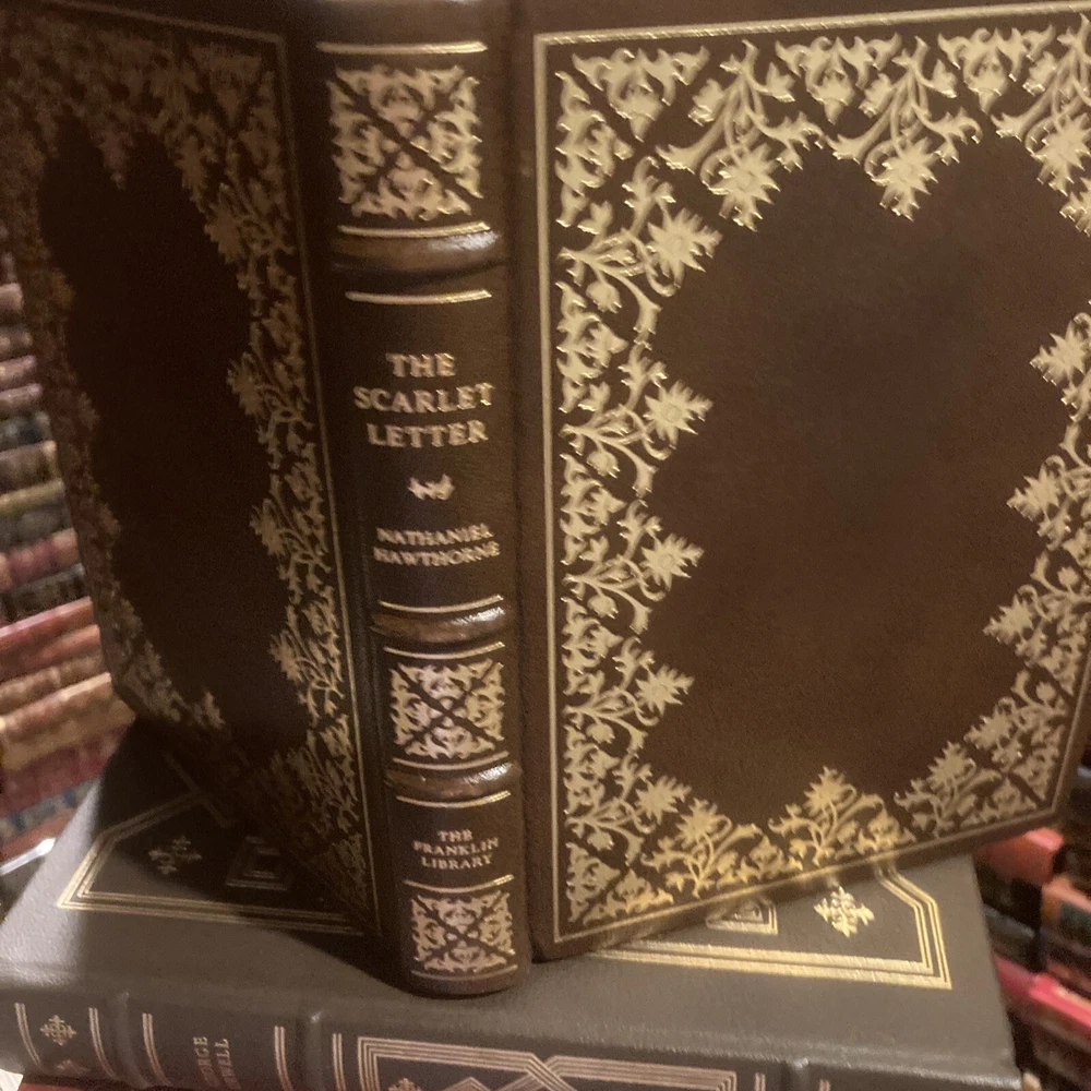 This Franklin Library edition of *The Scarlet Letter* is absolutely stunning—the rich brown leather, gold gilding, and silk end leaves make it feel like a true collector's piece. The illustrations by Raphael and Bolognese add depth to Hawthorne's classic, and the Smyth-sewn binding ensures durability. Even with the faint shadow from the removed bookplate, it's in fantastic condition. A must-have for any serious bibliophile!
