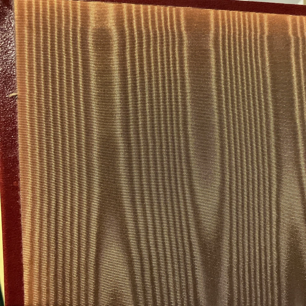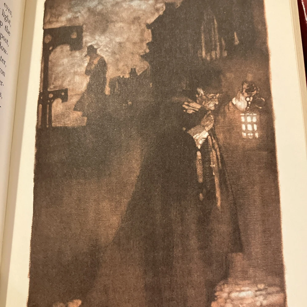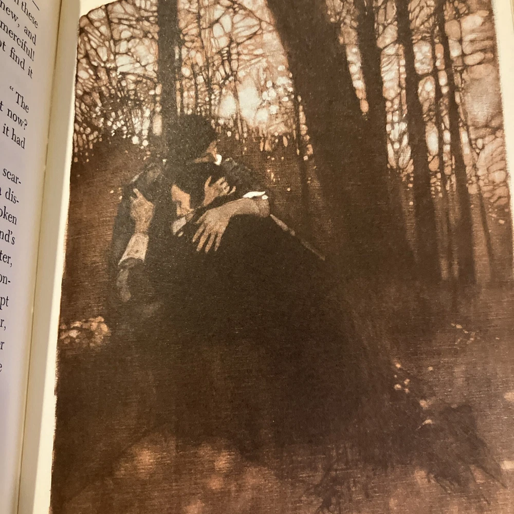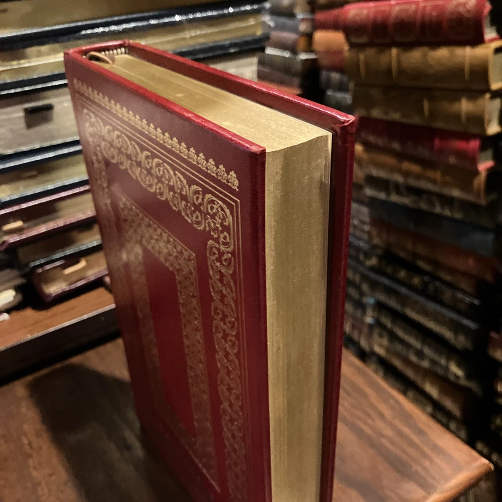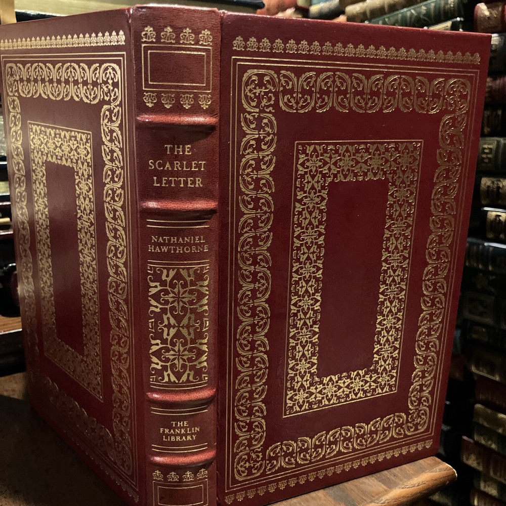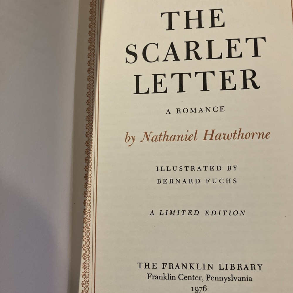 Franklin Library leather edition of Nathaniel Hawthorne's "The Scarlet Letter: A Romance," Illustrated by Bernard Fuchs, one of the 100 GREATEST MASTERPIECES OF AMERICAN LITERATURE series, published in 1976. Bound in brown leather, the book has brown French moire silk end leaves, acid-free paper, Symth-sewn binding, hubbed spine, acid-free paper, a satin book marker, Symth-sewn binding, gold gilding on three edges---in near FINE condition---except for 'minor' fading to edges of the moire silk. Nathaniel Hawthorne, who lived from 1804-1864, was born at SALEM, MASSACHUSETTS, to a prominent Puritan family whose ancestors included a judge at the Salem witchcraft trials. During his childhood he read extensively in the poets and romances and spent an impressionable year at a remote lake in Maine, after which he attended and graduated from BOWDOIN COLLEGE in 1825. Set in Puritan Boston in the mid-17th century, "The Scarlet Letter" created an un-precented excitement in the respectable community. It could hardly have been more violent, indeed had he burned down the Custom-House, and quenched its lasting smoking ember in the blood of a certain venerable personage, against whom he is supposed to cherish a peculiar malevolence. An aged English scholar sends his young wife, HESTER PRYNNE, to establish their home in Boston. When he arrives two years later, he finds Hester in the pillory with her illegitimate child in her arms. She refuses to name her lover and is sentenced to wear a SCARLET A, signifying ADULTRESS, as a token of her sin. The husband conceals his identity, assumes the name of ROGER CHILLINGWORTH, and in the guise of a doctor seeks to discover her paramour. Hester is ostracized by the community, but she becomes an "angel of mercy," serving others. Ultimately, Chillingworth discovers that the REVEREND ARTHUR DIMMESDALE, a saintly young minister is the father of Hester's beautiful, mischievous child, PEARL. Rev. Dimmesdale has struggled for years with his burden of hidden guilt, but though he does secret penance, pride prevents him from confessing publicly, and he is tortured by his conscience. If Dimmesdale had confessed his sexual sin, he would have lost his job as minister and would have been permanently unemployed. Hester wishes to flee to Europe with her lover, but he refuses the plan as a temptation from the Evil One and ultimately makes a confession on the pillory in which Hester had once been placed. Hester, with her open confession, survives. . .the men do not fare as well. 285 pages---classic American Literature at its finest! I offer Combined shipping.
