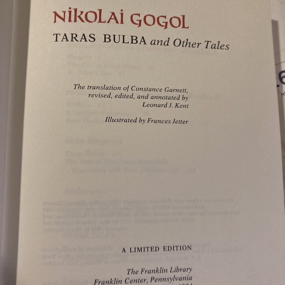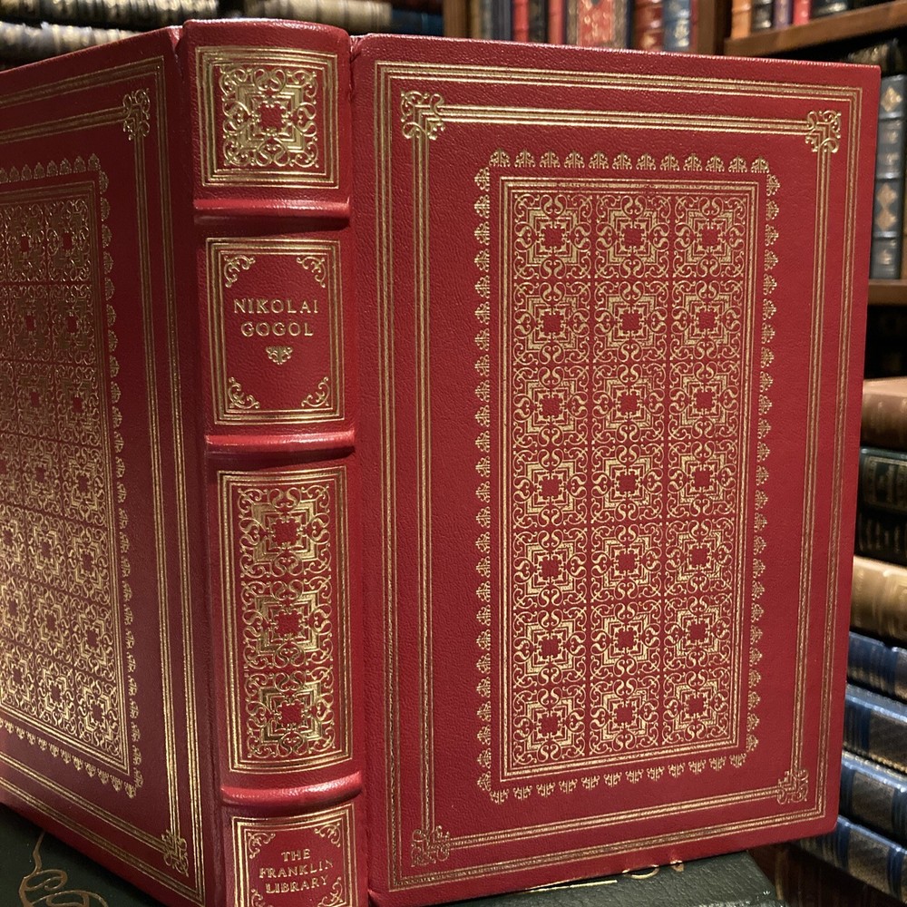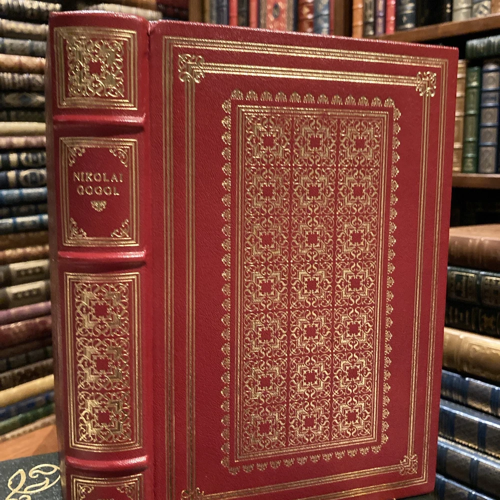 Franklin Library leather edition of Nikolai Gogol's " Taras Bulba and Other Tales," Translated by Constance Garnett, revised, edited, and annotated by Leonard J. Kent, illustrated by Frances Jetter, Frontispiece portrait of Gogol, a Limited edition, one of the COLLECTED STORIES OF THE WORLD'S GREATEST WRITERS series, published in 1984. Bound in deep scarlet red leather, the book has red moire silk end leaves, hubbed spine, a satin book marker, acid-free paper, Symth-sewn binding, gold gilding on three edge---in near FINE condition. Nikolai Vasilievich Gogol, who lived from 1809-1852, was born in the Ukraine, the first boy in a family of twelve children. At age nine, Gogol went to boarding school where he remained for seven years. Gogol arrived in St. Petersburg in 1828. There in his weary working day he confronted in "The Overcoat," the story of Akaky Akakievich, a simple, unambitious government clerk who manages to escape his small world for one day, only to be beaten back that same evening. His superiors ignore him; his colleagues enjoy harassing him for no reason at all. He receives their good wishes only after he wears to work a new, tailored-to-order winter coat, purchased after considerable privations. But the overcoat is taken from him a couple of men, leaving him shattered to the point that he goes home, falls ill, and dies a few weeks later. Despite a growing reputation as a writer, Gogol earned little money; he later took a professorship in world history at the University of St. Petersburg. "Nevsky Prospekt" focuses on the strange characters who walk along St. Petersburg's main avenue. In "Taras Bulba" a Cossack chieftain leads his warriors into combat time after time. The story covers the 17th century wars between the Poles and the Ukrainian Cossacks. "Diary of a Madman" consists of nineteen diary entries and follows the civil servant Poprischin, an ambitious middle-aged fellow whose dreams of success are constantly thwarted by his superiors. Poprischin fantasizes about his director's daughter; he reads letters written by her dog; to win the girl's affection, he even makes himself into the King of Spain. Gogol confronts rank and social status in "The Nose"---an extravagant farce---and makes us laugh at the folly of class stratification. Gogol said: "Laughter is a great thing: it deprives you of neither life nor property, but before it the guilty are like a hare with its legs tied." This volume is a collection of ten stories, including selections from "Evenings on a Farm near Dikanka." Dostoevsky said: "We all come from under Gogol's overcoat." Gogol enjoyed a close relationship with the great Russian poet, Alesandr Pushkin. Gogol was one of the first writers to criticize Russian society during a time of severe government censorship. 441 pages---a RARE title. I offer Combined shipping.