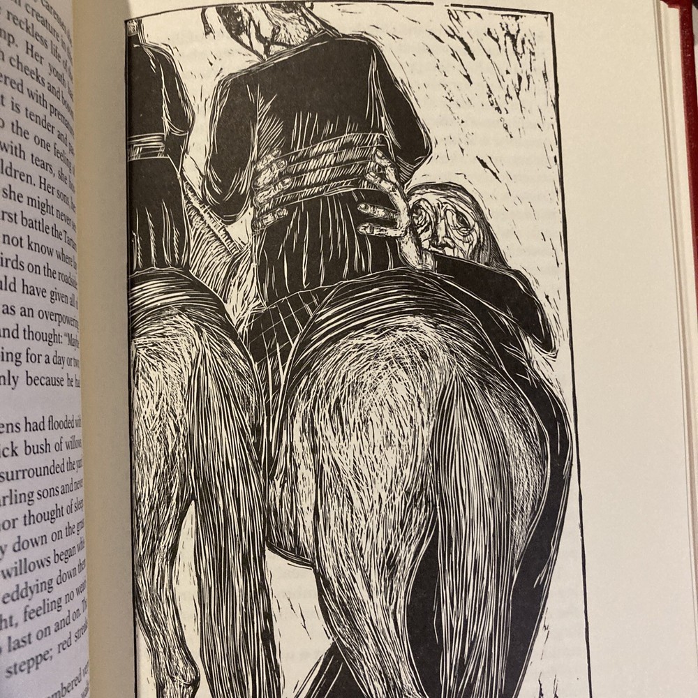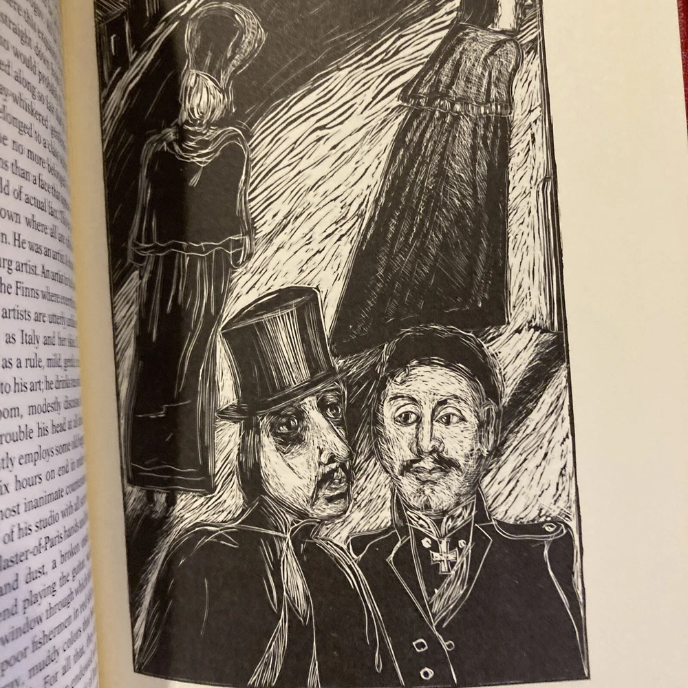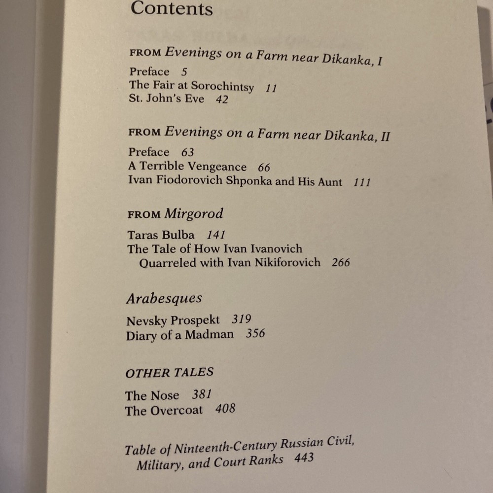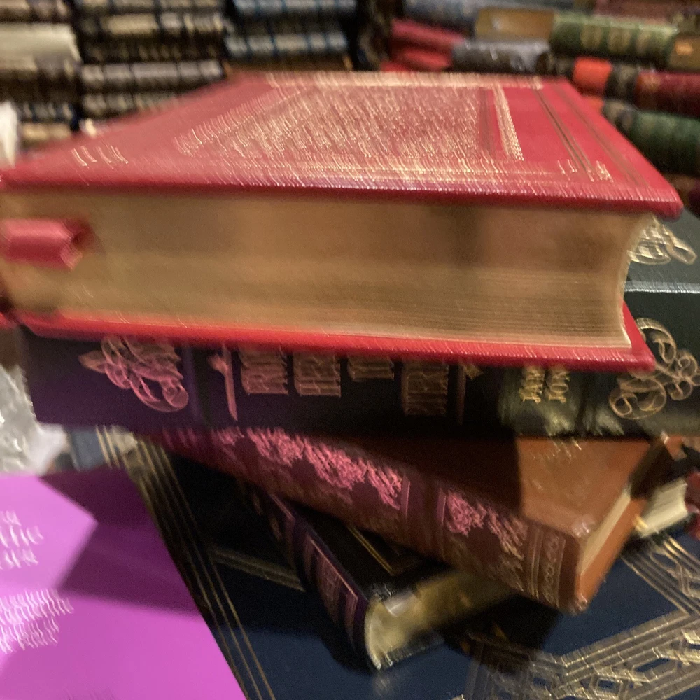 Franklin Library leather edition of Nikolai Gogol's " Taras Bulba and Other Tales," Translated by Constance Garnett, revised, edited, and annotated by Leonard J. Kent, illustrated by Frances Jetter, Frontispiece portrait of Gogol, a Limited edition, one of the COLLECTED STORIES OF THE WORLD'S GREATEST WRITERS series, published in 1984. Bound in deep scarlet red leather, the book has red moire silk end leaves, hubbed spine, a satin book marker, acid-free paper, Symth-sewn binding, gold gilding on three edge---in near FINE condition. Nikolai Vasilievich Gogol, who lived from 1809-1852, was born in the Ukraine, the first boy in a family of twelve children. At age nine, Gogol went to boarding school where he remained for seven years. Gogol arrived in St. Petersburg in 1828. There in his weary working day he confronted in "The Overcoat," the story of Akaky Akakievich, a simple, unambitious government clerk who manages to escape his small world for one day, only to be beaten back that same evening. His superiors ignore him; his colleagues enjoy harassing him for no reason at all. He receives their good wishes only after he wears to work a new, tailored-to-order winter coat, purchased after considerable privations. But the overcoat is taken from him a couple of men, leaving him shattered to the point that he goes home, falls ill, and dies a few weeks later. Despite a growing reputation as a writer, Gogol earned little money; he later took a professorship in world history at the University of St. Petersburg. "Nevsky Prospekt" focuses on the strange characters who walk along St. Petersburg's main avenue. In "Taras Bulba" a Cossack chieftain leads his warriors into combat time after time. The story covers the 17th century wars between the Poles and the Ukrainian Cossacks. "Diary of a Madman" consists of nineteen diary entries and follows the civil servant Poprischin, an ambitious middle-aged fellow whose dreams of success are constantly thwarted by his superiors. Poprischin fantasizes about his director's daughter; he reads letters written by her dog; to win the girl's affection, he even makes himself into the King of Spain. Gogol confronts rank and social status in "The Nose"---an extravagant farce---and makes us laugh at the folly of class stratification. Gogol said: "Laughter is a great thing: it deprives you of neither life nor property, but before it the guilty are like a hare with its legs tied." This volume is a collection of ten stories, including selections from "Evenings on a Farm near Dikanka." Dostoevsky said: "We all come from under Gogol's overcoat." Gogol enjoyed a close relationship with the great Russian poet, Alesandr Pushkin. Gogol was one of the first writers to criticize Russian society during a time of severe government censorship. 441 pages---a RARE title. I offer Combined shipping.