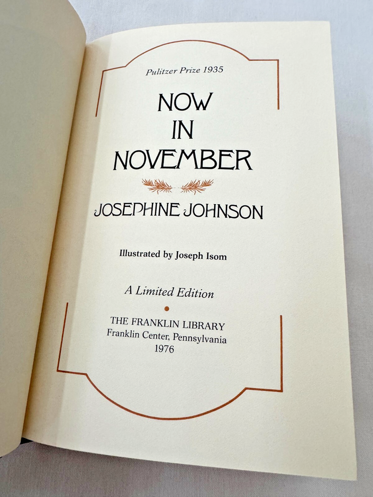 From the Franklin Library of Pulitzer Prize Classics... Now in November by Josephine Johnson Illustrated by Joseph Isom Copyright 1976 by The Franklin Library Bound in Premium Full Leather This volume contains all of these classic Franklin Library trimmings: Premium Leather Binding Decorated Endleaves Distinctive Cover Design Hubbed Spine, Accented in Gold Satin Ribbon Page Marker Gilded Page Edges Long-lasting, High Quality Acid-neutral Paper Beautiful Illustrations DESCRIPTION A very scarce title in any condition, this 1976 First Edition is in Absolute Mint and Unread condition. The front and back covers are in Perfect condition and the gilded page edges show no wear at all! There are no markings, bookplates, or other signs of prior ownership in this book. This Pulitzer Prize Edition was published by The Franklin Library and would be a beautiful addition to your Franklin Library book collection. Overall, this copy is a grade collector's book. This book is very elusive in this superior condition, as only a limited number of them were ever published, so now is the time to act. Hopefully you can add this book to your collection and enjoy it in the years to come... SHIPPING POLICY We take great care packaging every item to ensure safe shipment to you. Items are packaged using plenty of bubble wrap and packaged securely in a sturdy box. Our secure shipping methods have resulted in zero damaged items in over 15 years! Items are shipped out within 1 - 3 days of payment being received. RETURN & REFUND POLICY We accept refunds within 30 days of purchase. If you are not 100% satisfied with your purchase, please contact us about a refund, or initiate a refund through eBay. CONTACT US We are committed to providing our customers with the best possible on-line shopping experience. This includes a commitment to excellent customer service, before you purchase as well as after your order has been delivered. Please feel free to submit any questions or inquiries regarding this item or your order by sending us a message through the eBay messaging system. We will typically respond within 24 hours of receiving your message.
