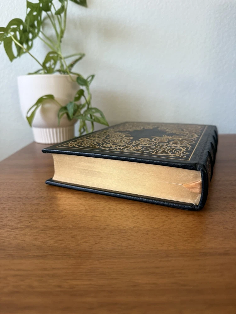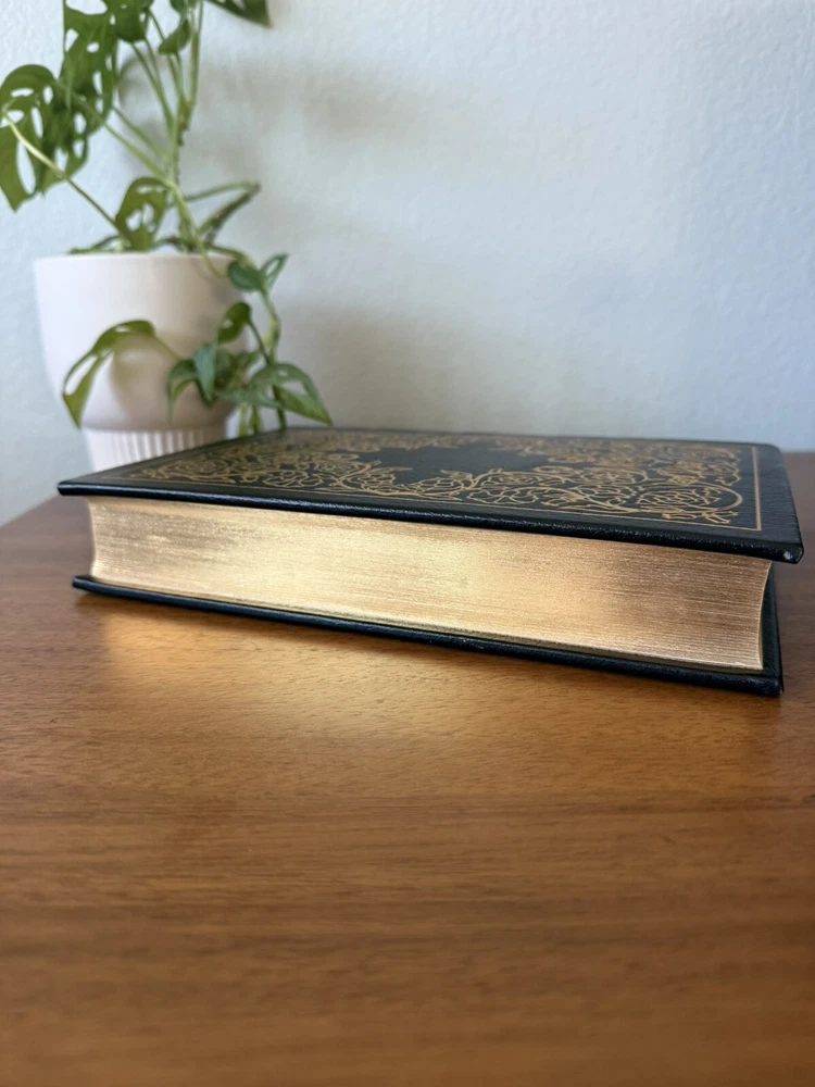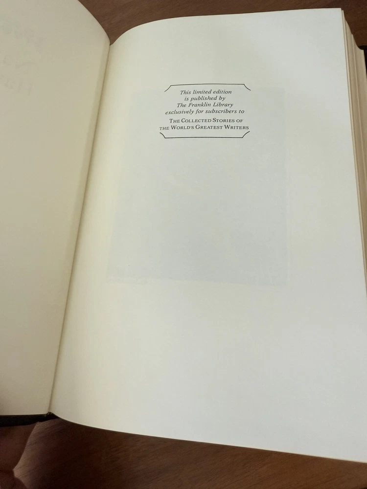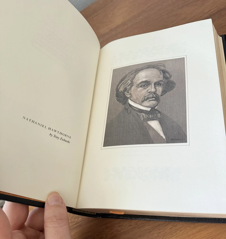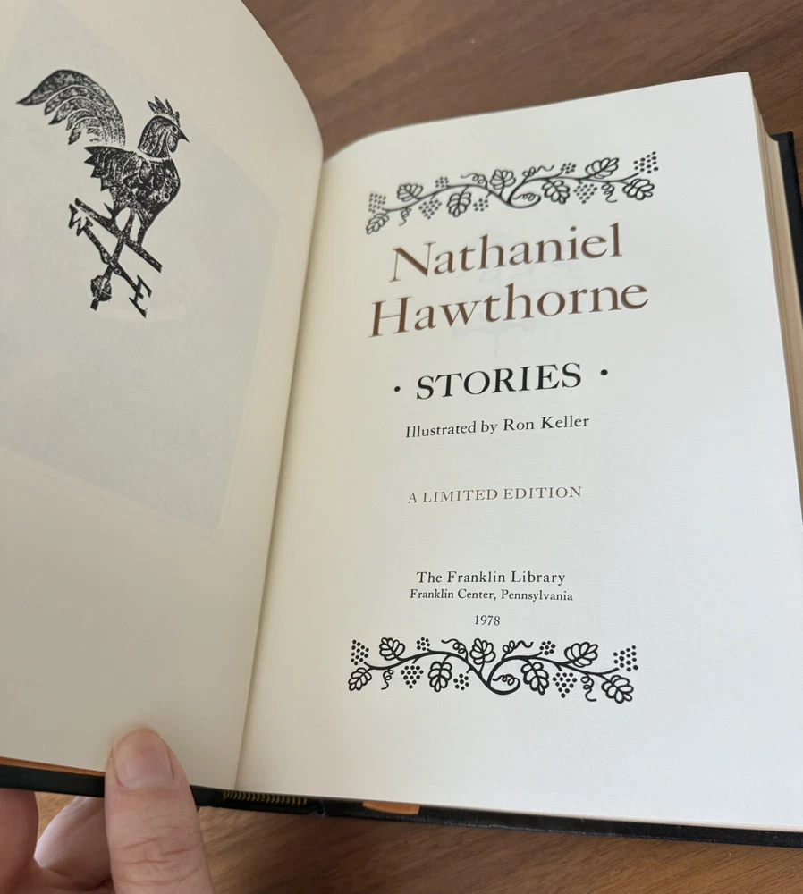 Franklin Library Limited Edition Nathaniel Hawthorne “Stories” Part of the Collected Stories of the Worlds greatest Writers. 1978 Leather Bound, Accented in 22kt gold. Printed on archival paper with gilded edges. The endsheets are of moire fabric with a silk ribbon page marker. Smyth sewing and concealed muslin joints. This book is in a black full leather with gold floral detail and hubbed spines. This UNREAD leather limited edition book from The Franklin Mint is in practically new condition with no markings inside or out. The only sign of age is some fading near the edges of the moire silk interior end pages. Otherwise it is pristine. It will make a fine addition to any collector's library of antique and collectible books.