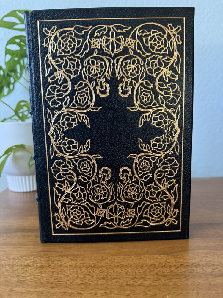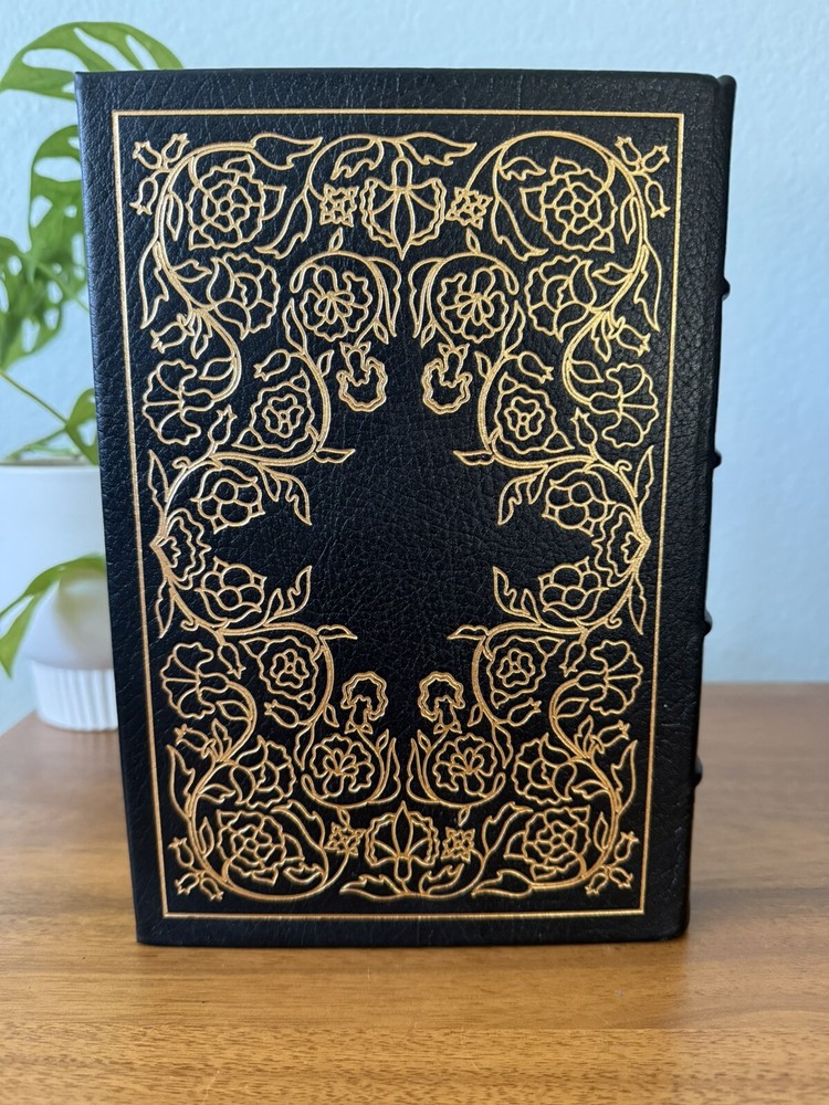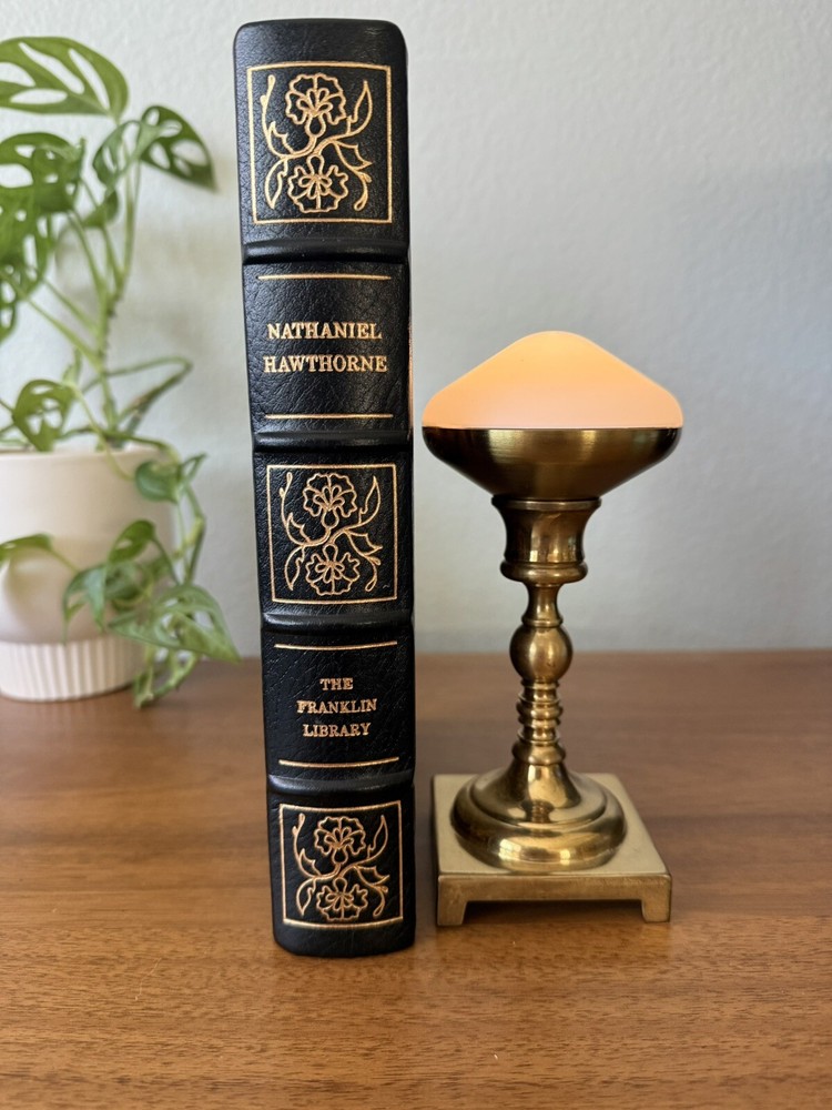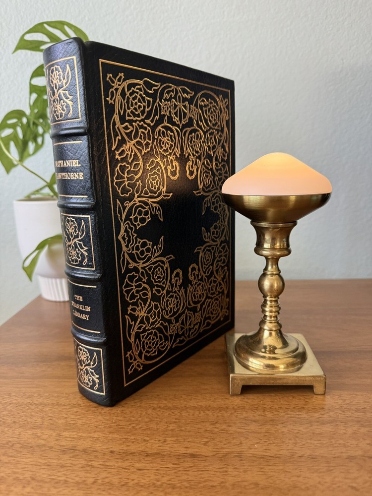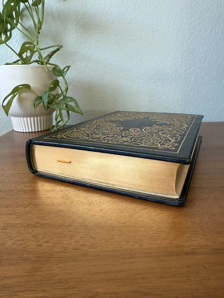Franklin Library Limited Edition Nathaniel Hawthorne “Stories” Part of the Collected Stories of the Worlds greatest Writers. 1978 Leather Bound, Accented in 22kt gold. Printed on archival paper with gilded edges. The endsheets are of moire fabric with a silk ribbon page marker. Smyth sewing and concealed muslin joints. This book is in a black full leather with gold floral detail and hubbed spines. This UNREAD leather limited edition book from The Franklin Mint is in practically new condition with no markings inside or out. The only sign of age is some fading near the edges of the moire silk interior end pages. Otherwise it is pristine. It will make a fine addition to any collector's library of antique and collectible books.