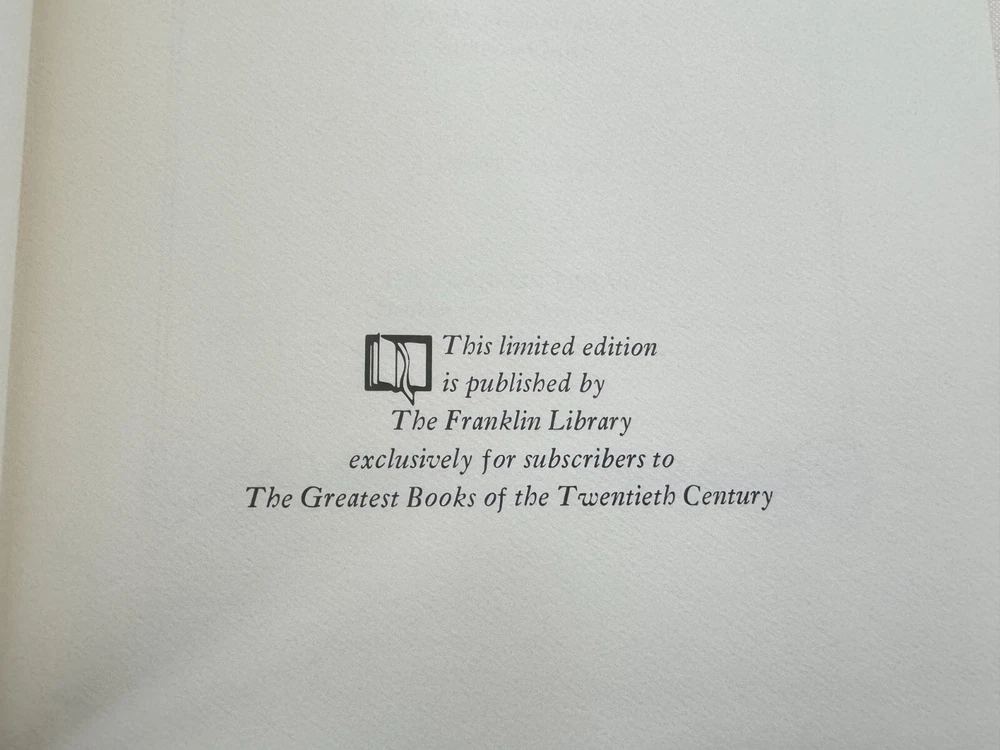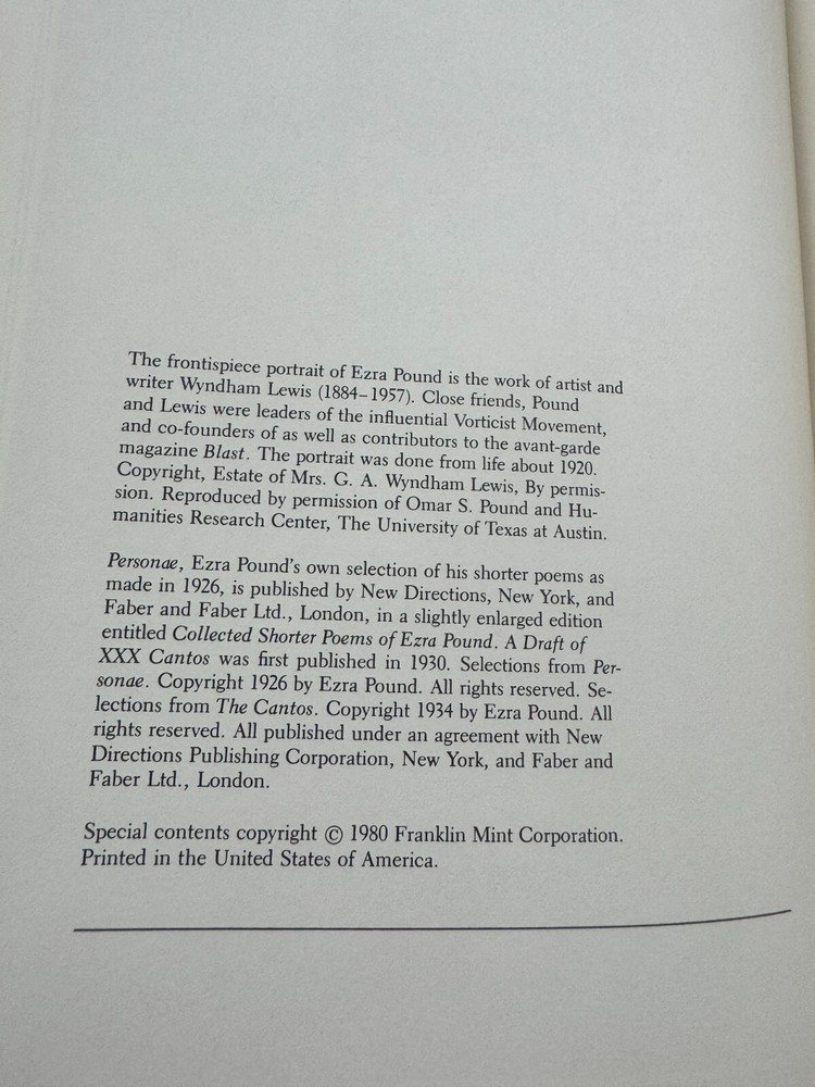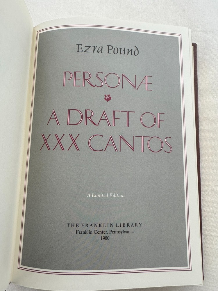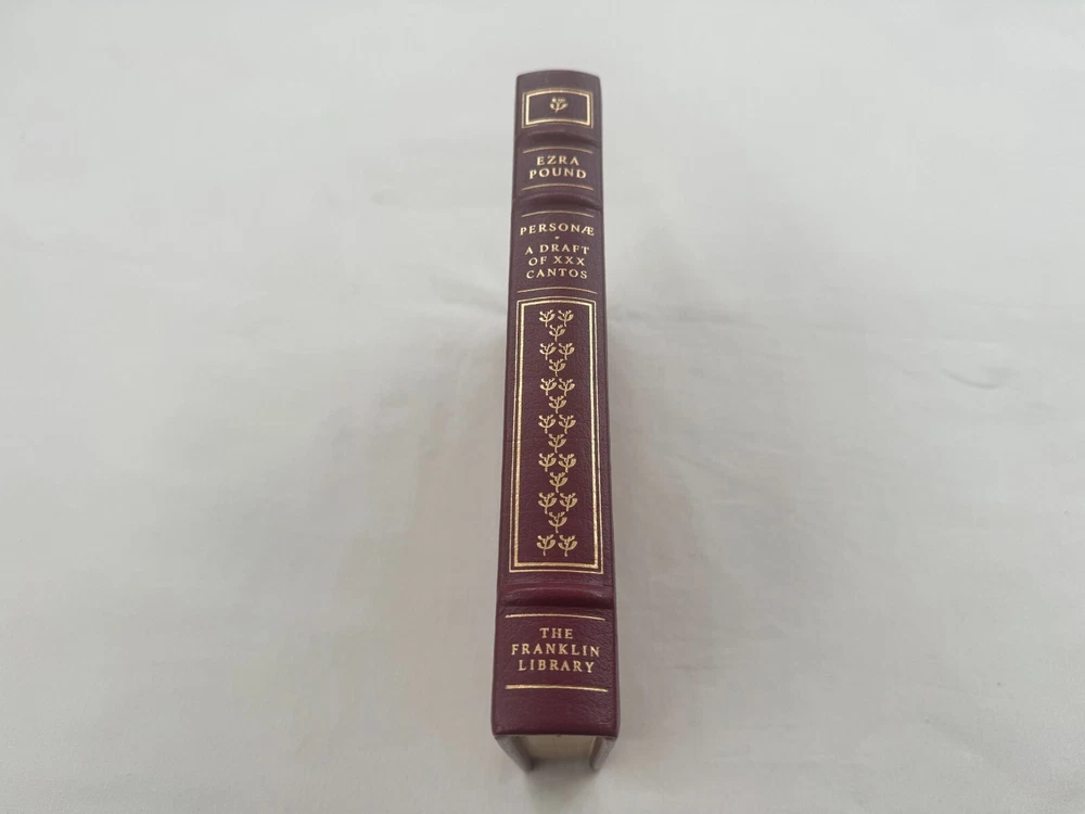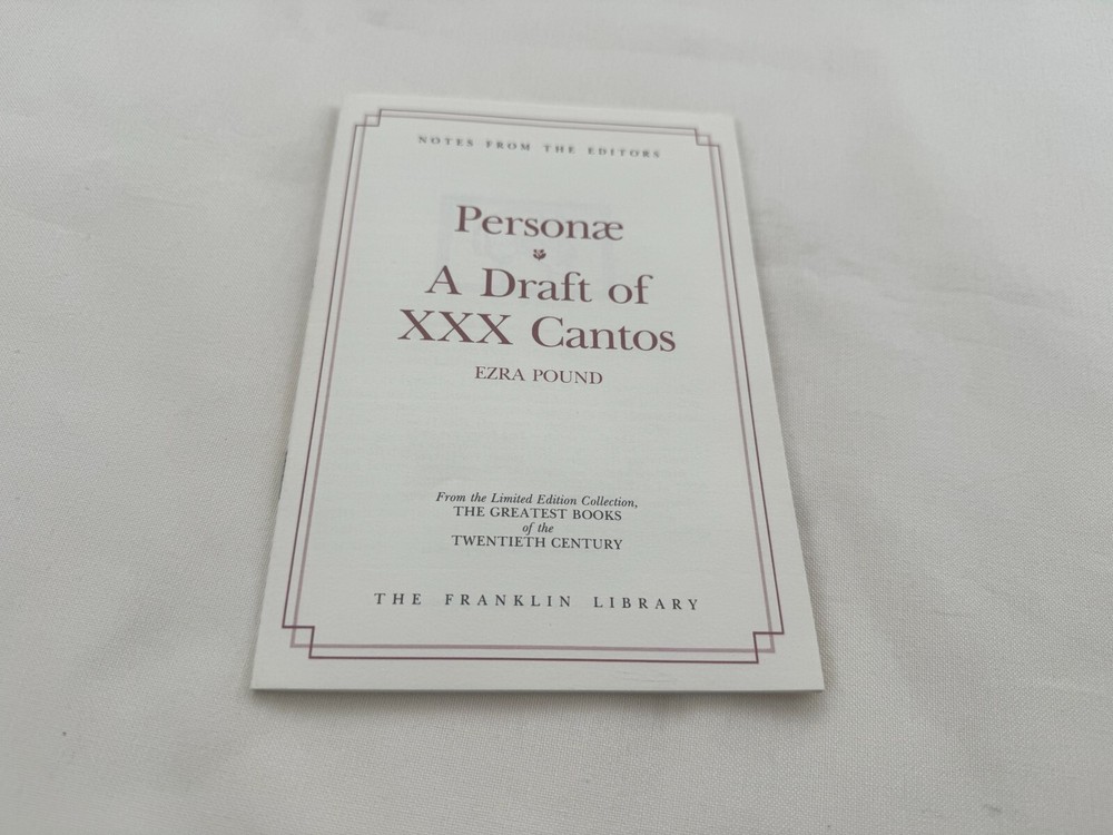 From the Greatest Books of the 20th Century Franklin Library Collection... Personae A Draft of XXX Cantos by Ezra Pound Copyright 1980 by The Franklin Library A Limited Edition Premium Full Leather Binding This volume contains all of these classic Franklin Library trimmings: Premium Leather Binding Silk Moire Endleaves Distinctive Cover Design Hubbed Spine, Accented in Gold Satin Ribbon Page Marker Gilded Page Edges Long-lasting, High Quality Acid-neutral Paper Beautiful Illustrations A very scarce title in any condition, this 1980 Limited Edition is in Absolute Mint and Unread condition. The front and back covers are in Perfect condition showing very faint wear along the bottom board edges and the gilded page edges show no wear at all! The binding is tight and square without spine lean. There are no markings, bookplates, or other signs of prior ownership in this book. This book is part of the Great Books of the Twentieth Century collection published by the Franklin Library and comes complete with the Notes from the Editors. It would be a beautiful addition to your Franklin Library book collection. Overall, this copy is a grade collector's book. This book is very elusive in this superior condition, as only a limited number of them were ever published, so now is the time to act. Hopefully you can add this book to your collection and enjoy it in the years to come... Please Email Me With Any Questions You Might Have! Shipping Info: Buyer to Pay Shipping and Handling International Bidders Pay Extra Shipping Good luck and happy bidding!