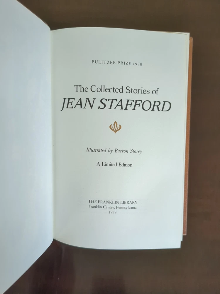 Collected Stories by Jean Stafford as part of the Pulitzer Prize Collection by Franklin Library. Leather bound with gold gilt page ends, silk moire end pages and silk marker ribbon. See pictures for details.