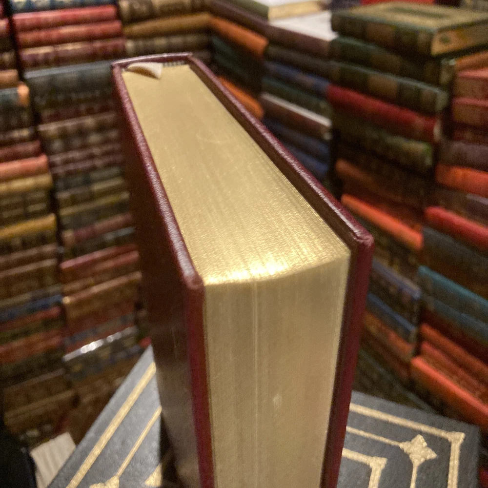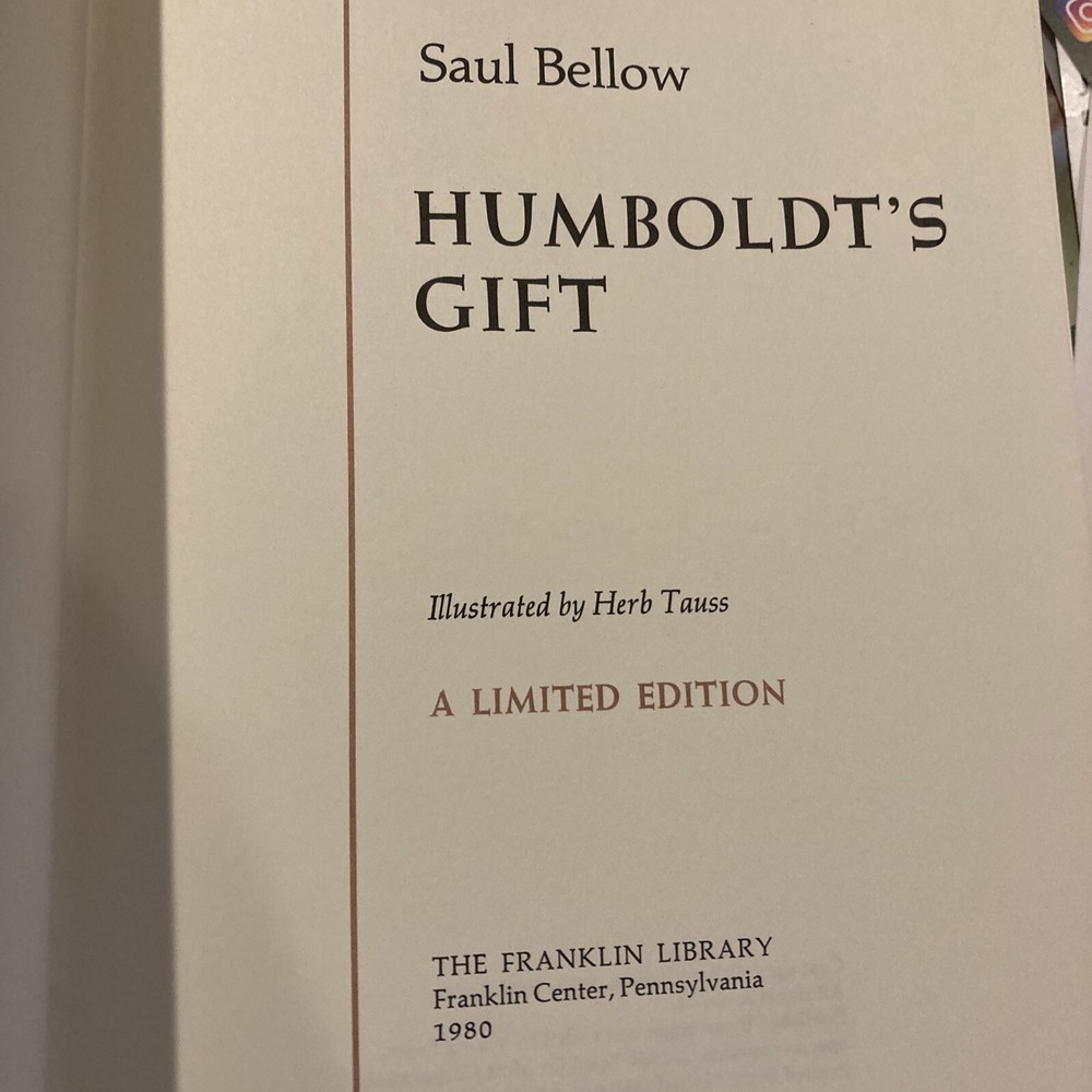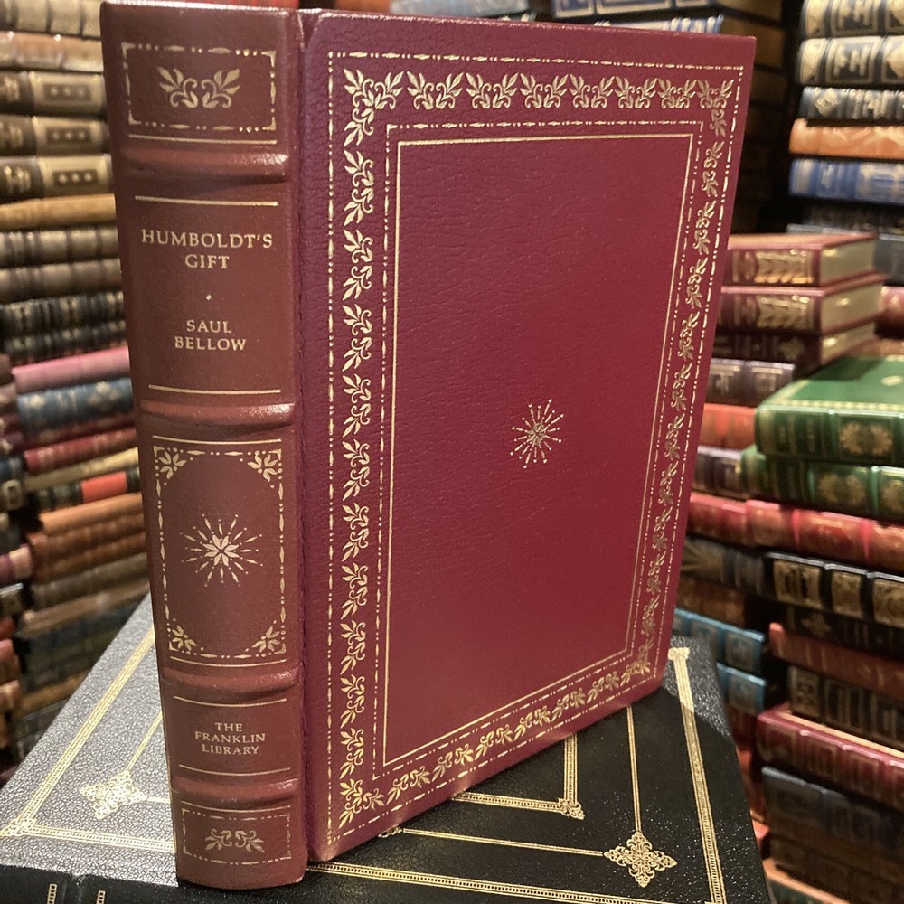 Franklin Library leather edition of Saul Bellow's "Humboldt's Gift," a Limited edition, Illustrated by Herbert Tauss, one of the 100 GREATEST MASTERPIECES OF AMERICAN LITERATURE series, published in 1980. Bound in burgundy leather, the book has ivory moire silk end leaves, acid-free paper, Symth-sewn binding, hubbed spine, satin book marker, gold gilding on three edges---in FINE condition. Saul Bellow, who lived from 1915-2005, was an American Jewish author. Born in Quebec of parents who had come from Russia two years earlier, his family moved to Chicago when he was eleven; his early childhood had been spent in a Montreal slum. Bellow was raised in a Jewish home, and the fluent Yiddish he learned there had a noticeable influence on his English style. After graduating from Northwestern University, he taught at various colleges and universities, but his real vocation was writing. "Humboldt's Gift" is not basically a Jewish novel even though its protagonist, CHARLIE CITRINE, is a Jewish author from Chicago. Instead, the book deals with Charlie's attempts to cope with a lifestyle and a career that are turning sour. Bellow is the only American author to win the National Book Award three times. 467 pages---a GORGEOUS leather. I offer Combined shipping.
