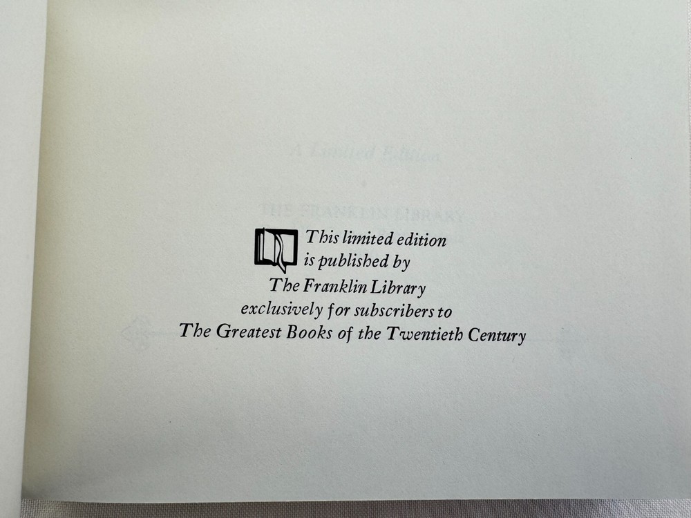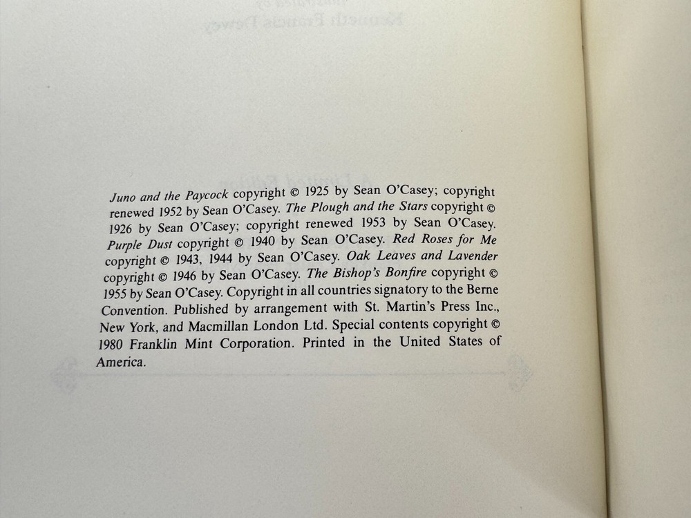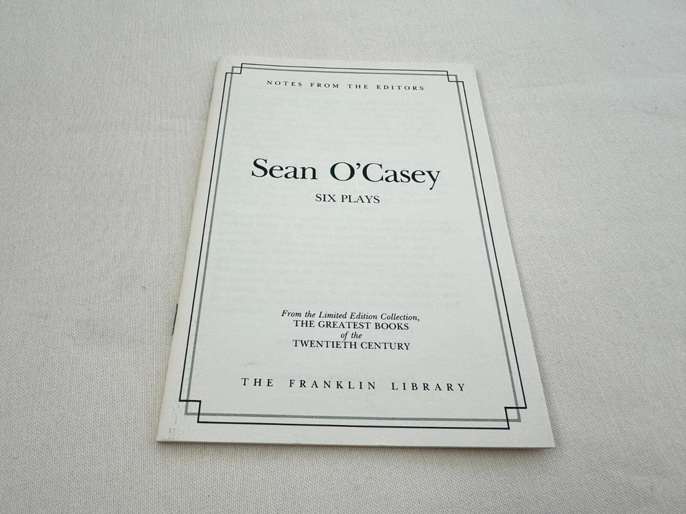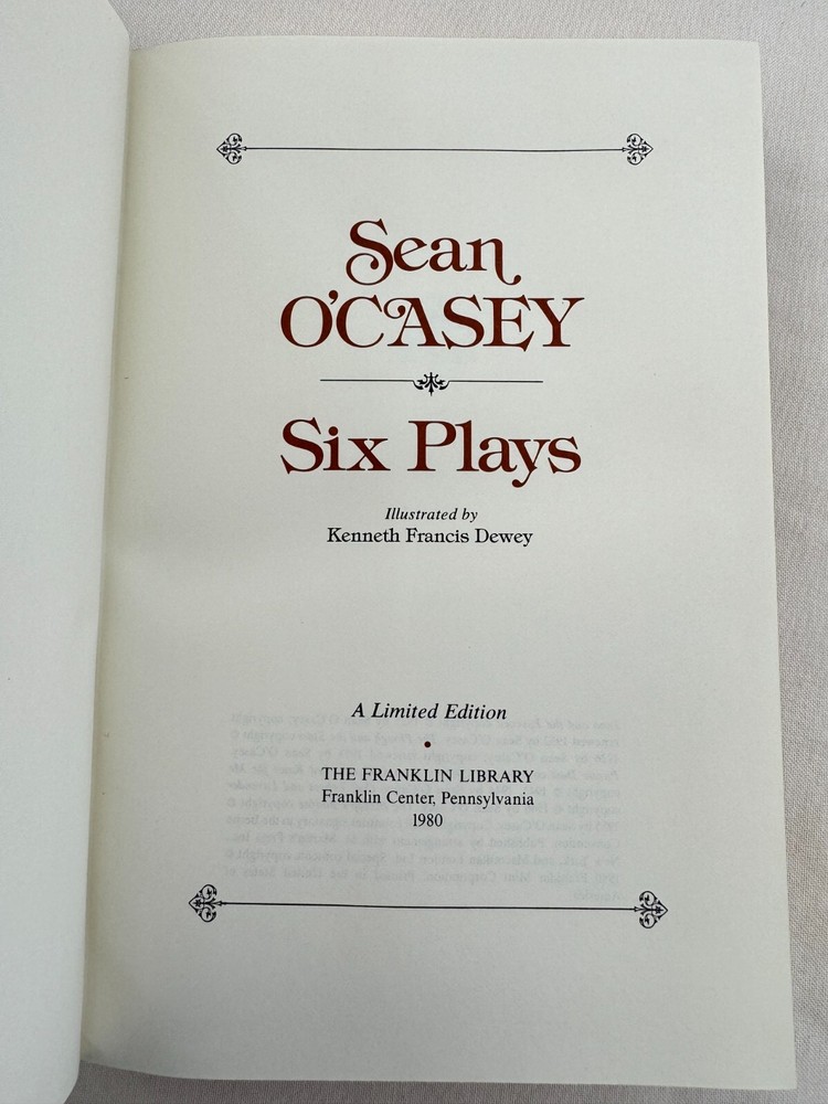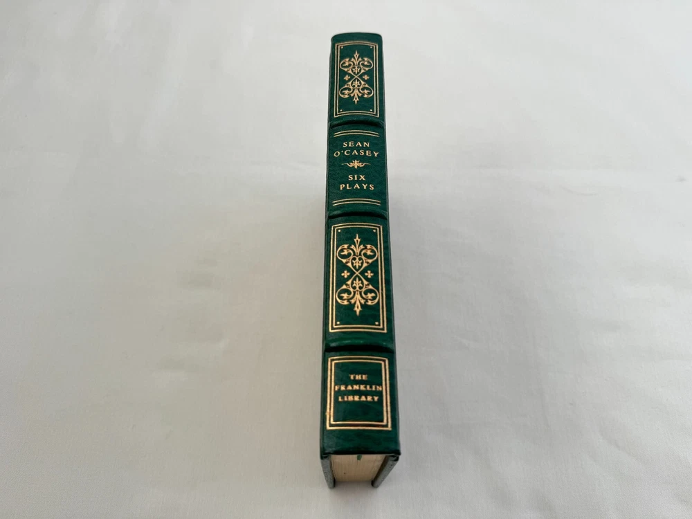 From the Greatest Books of the 20th Century Franklin Library Collection... Six Plays of Sean O'Casey Illustrated by Kenneth Francis Dewey Copyright 1980 by The Franklin Library A Limited Edition Premium Full Leather Binding This volume contains all of these classic Franklin Library trimmings: Premium Leather Binding Silk Moire Endleaves Distinctive Cover Design Hubbed Spine, Accented in Gold Satin Ribbon Page Marker Gilded Page Edges Long-lasting, High Quality Acid-neutral Paper Beautiful Illustrations A very scarce title in any condition, this 1980 Limited Edition is in near Mint and Unread condition. The front and back covers are in Perfect condition with very minor wear on the bottom board edges and the gilded page edges show no wear at all! The binding is tight and square without spine lean. There are no markings, bookplates, or other signs of prior ownership in this book. This book is part of the Great Books of the Twentieth Century collection published by the Franklin Library and comes complete with the Notes from the Editors. It would be a beautiful addition to your Franklin Library book collection. Overall, this copy is a grade collector's book. This book is very elusive in this superior condition, as only a limited number of them were ever published, so now is the time to act. Hopefully you can add this book to your collection and enjoy it in the years to come... Please Email Me With Any Questions You Might Have! Shipping Info: Buyer to Pay Shipping and Handling International Bidders Pay Extra Shipping Good luck and happy bidding!
