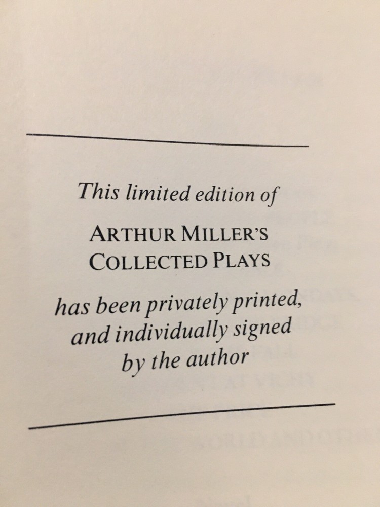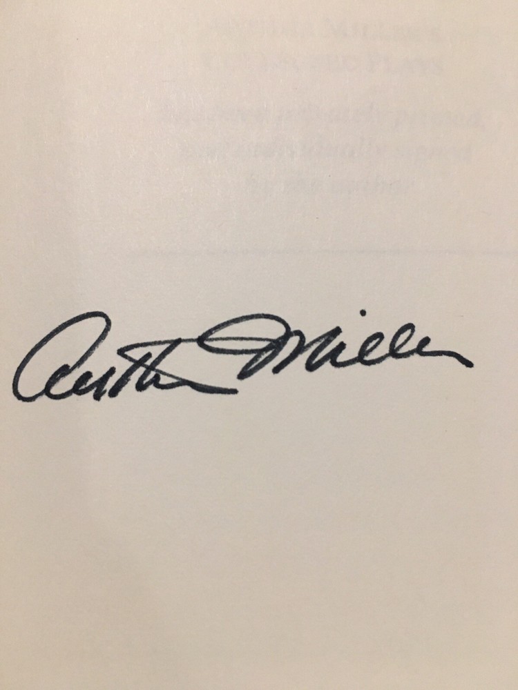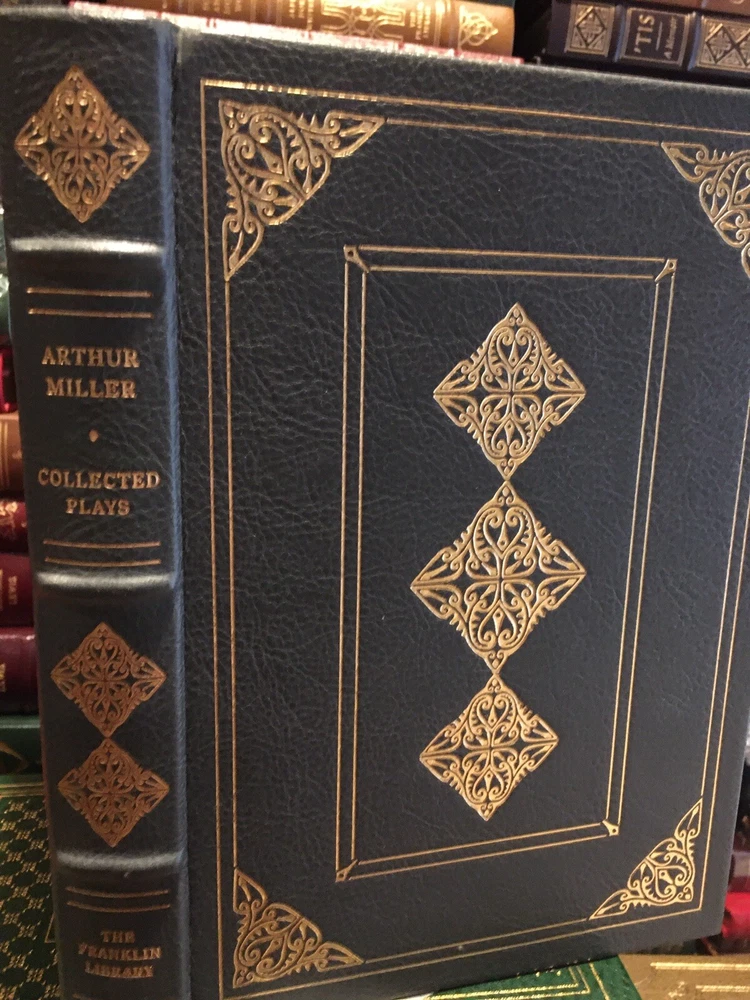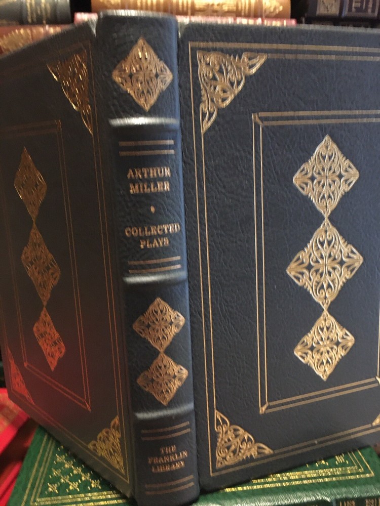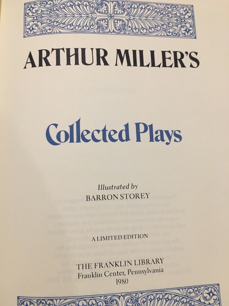 Franklin Library leather edition of Arthur Miller's "Collected Plays," Illustrated by Barron Storey, a limited edition, one of the SIGNED 60 series, PERSONALLY SIGNED by ARTHUR MILLER, published in 1980. Bound in gray/blue leather, the book has gray/blue French moire end leaves, acid-free paper, Symth-sewn binding, a satin book marker, gold gilding on three edges---in Near Fine condition. Asher Miller, who lived from 1915 – 2005, was a prolific American playwright, essayist, and prominent figure in twentieth-century American theatre. This volume includes: "Introduction to the Collected Plays,"---50 pages of Miller's comments and analysis--- and his major dramas: "All My Sons," "Death of a Salesman," "The Crucible," "A View from the Bridge, and "A Memory of Two Mondays." Miller was born in Harlem of Polish Jewish parents. In the Wall Street Crash on 1929, the family lost almost everything. As a teenager, Miller delivered bread every morning before school to help the family. After graduating high school in 1932 he worked at several menial jobs to pay for his college tuition before enrolling at the UNIVERSITY OF MICHIGAN where he began writing plays. Miller retained strong ties to his alma mater throughout the rest of his life. After his graduation in 1938, he joined the Federal Theatre Project, a NEW DEAL agency established to provide jobs in the theater. In 1940, Miller married Mary Grace Slattery and they became parents to two children. Miller was exempted from military service during World War II because of a high-school football injury injury to his left kneecap. 1940 was also the year his first play was produced; "The Man Who Had All the Luck" won the Theatre Guild's National Award. In 1947, Miller's play "All My Sons" was a success on BROADWAY, earning him his first TONY AWARD and his reputation as a playwright was established. In 1948, Miller wrote "Death of a Salesman" and the play premiered on Broadway on February 10, 1949, directed by ELIA KAZAN, and starring Lee J. Cobb as Willy Loman and Mildred Dunnock as Linda. The play was commercially successful and critically acclaimed, winning a numerous award, including the New York Drama Critics' Award and the Pulitzer Prize. The play was performed 742 times. In 1955, Miller's "A View from the Bridge" opened on Broadway. In 1956, Miller married MARILYN MONROE. Miller was subpoenaed by the HUAC. Miller wrote the screenplay "The Misfits" and Marilyn Monroe was given the leading role. In 1961, Miller and Monroe divorced after their five years of marriage. Nineteen months later, Monroe died of a likely drug overdose. 437 pages. I offer Combined shipping.