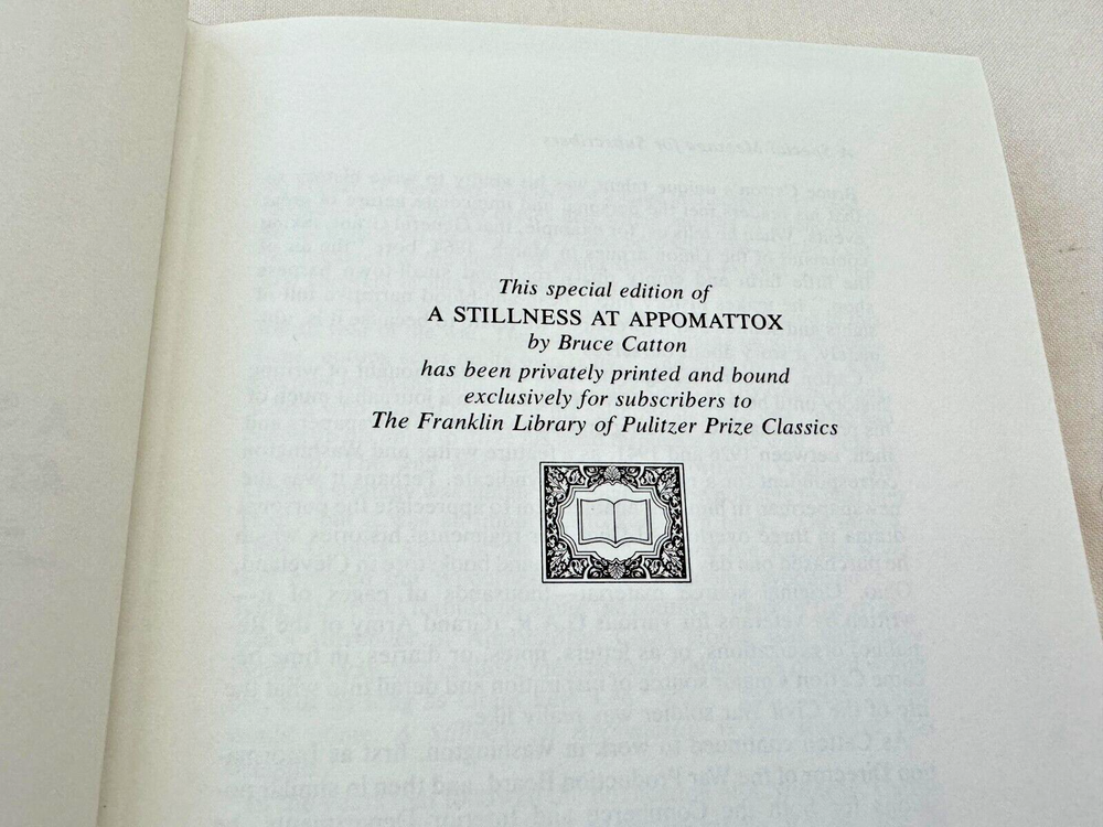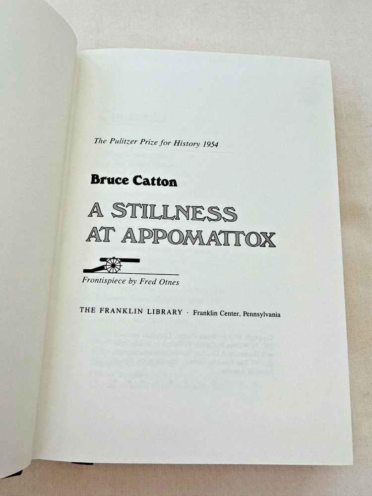 From the Franklin Library of Pulitzer Prize Classics... A Stillness at Appomattox by Bruce Catton Frontispiece by Fred Otnes Copyright 1983 by The Franklin Library Bound in Premium Full Leather This volume contains all of these classic Franklin Library trimmings: Premium Leather Binding Decorated Endleaves Distinctive Cover Design Hubbed Spine, Accented in Gold Satin Ribbon Page Marker Gilded Page Edges Long-lasting, High Quality Acid-neutral Paper Beautiful Illustrations DESCRIPTION A very scarce title in any condition, this 1983 First Edition is in Absolute Mint and Unread condition. The front and back covers are in Perfect condition and the gilded page edges show no wear at all! There are no markings, bookplates, or other signs of prior ownership in this book. This Pulitzer Prize Edition was published by The Franklin Library and would be a beautiful addition to your Franklin Library book collection. Overall, this copy is a grade collector's book. This book is very elusive in this superior condition, as only a limited number of them were ever published, so now is the time to act. Hopefully you can add this book to your collection and enjoy it in the years to come... SHIPPING POLICY We take great care packaging every item to ensure safe shipment to you. Items are packaged using plenty of bubble wrap and packaged securely in a sturdy box. Our secure shipping methods have resulted in zero damaged items in over 15 years! Items are shipped out within 1 - 3 days of payment being received. RETURN & REFUND POLICY We accept refunds within 30 days of purchase. If you are not 100% satisfied with your purchase, please contact us about a refund, or initiate a refund through eBay. CONTACT US We are committed to providing our customers with the best possible on-line shopping experience. This includes a commitment to excellent customer service, before you purchase as well as after your order has been delivered. Please feel free to submit any questions or inquiries regarding this item or your order by sending us a message through the eBay messaging system. We will typically respond within 24 hours of receiving your message.