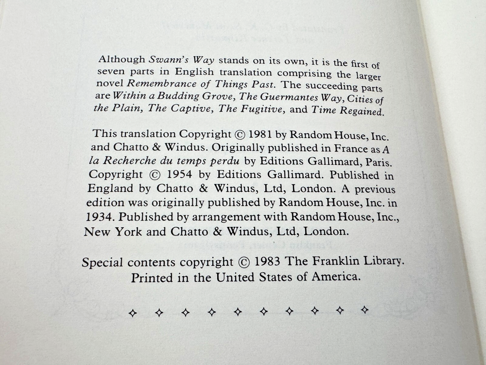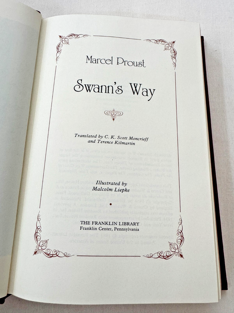From the Franklin Library Collection... Swann's Way by Marcel Proust Illustrated by Malcolm Liepke Copyright 1983 by The Franklin Library Bound in Premium Full Leather This volume contains all of these classic Franklin Library trimmings: Premium Leather Binding Decorated Endleaves Distinctive Cover Design Hubbed Spine, Accented in Gold Satin Ribbon Page Marker Gilded Page Edges Long-lasting, High Quality Acid-neutral Paper Beautiful Illustrations DESCRIPTION A very scarce title in any condition, this 1983 Limited Edition is in Absolute Mint and Unread condition. The front and back covers are in Perfect condition and the gilded page edges show hardly any wear at all! There are no markings, bookplates, or other signs of prior ownership in this book. This Edition is published by The Franklin Library and would be a beautiful addition to your Franklin Library book collection. Overall, this copy is a grade collector's book. This book is very elusive in this superior condition, as only a limited number of them were ever published, so now is the time to act. Hopefully you can add this book to your collection and enjoy it in the years to come... SHIPPING POLICY We take great care packaging every item to ensure safe shipment to you. Items are packaged using plenty of bubble wrap and packaged securely in a sturdy box. Our secure shipping methods have resulted in zero damaged items in over 15 years! Items are shipped out within 1 - 3 days of payment being received. RETURN & REFUND POLICY We accept refunds within 30 days of purchase. If you are not 100% satisfied with your purchase, please contact us about a refund, or initiate a refund through eBay. CONTACT US We are committed to providing our customers with the best possible on-line shopping experience. This includes a commitment to excellent customer service, before you purchase as well as after your order has been delivered. Please feel free to submit any questions or inquiries regarding this item or your order by sending us a message through the eBay messaging system. We will typically respond within 24 hours of receiving your message.