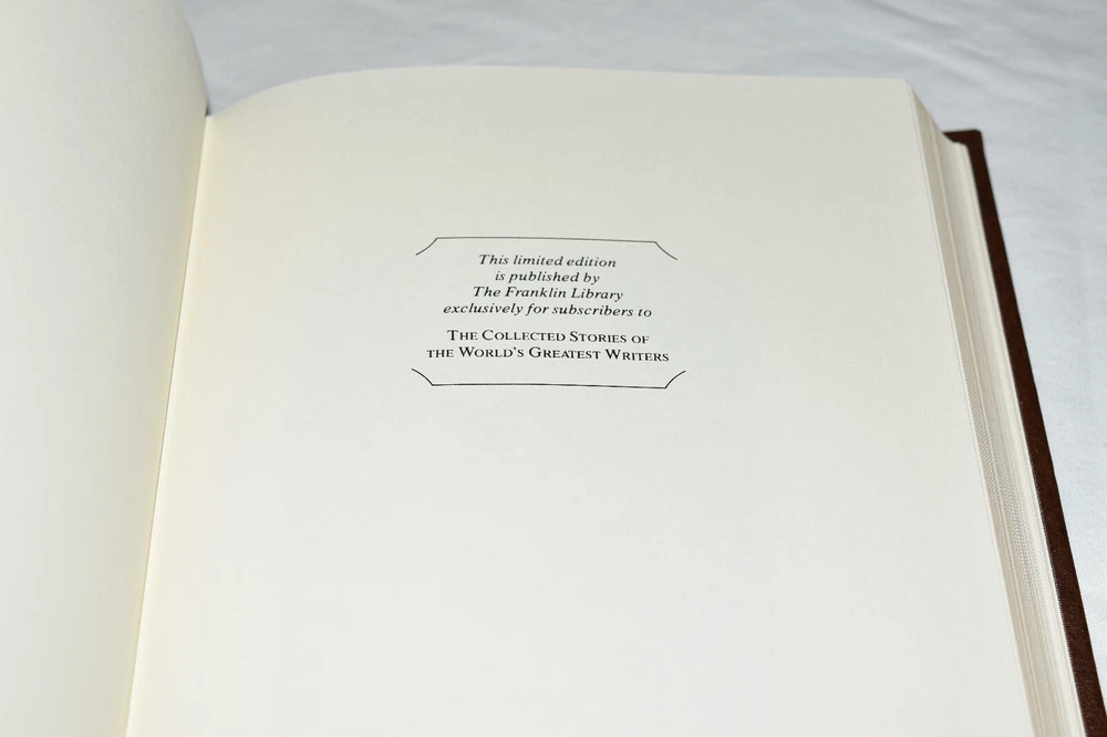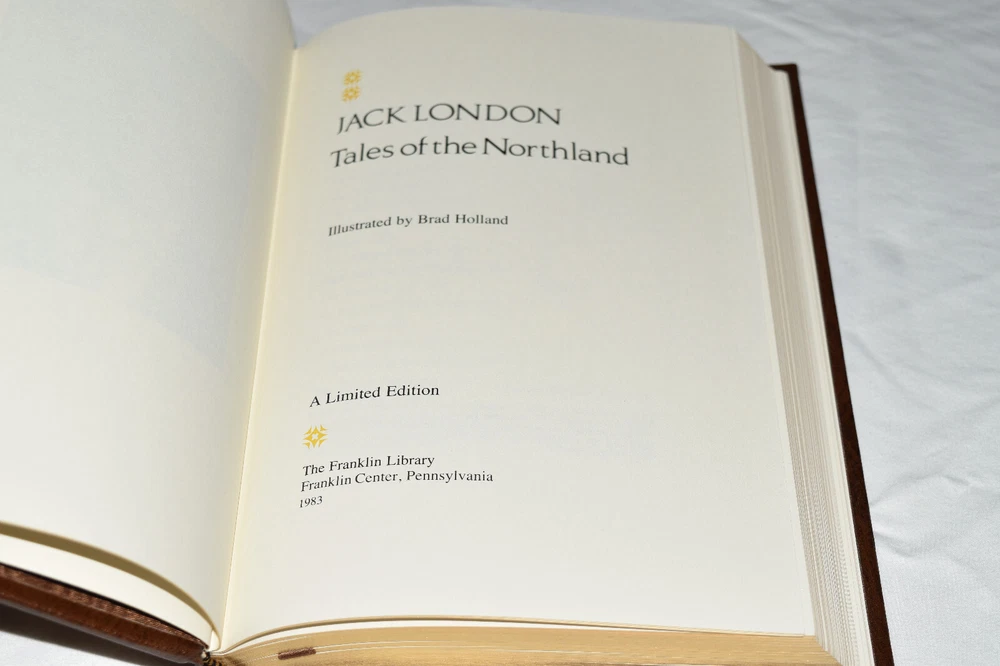 From the Franklin Library World's Greatest Writers Collection... Tales of the Northland by Jack London Illustrated by Brad Holland Copyright 1983 by The Franklin Library Premium Full Leather Binding This volume contains all of these classic Franklin Library trimmings: Premium Leather Binding Silk Moire Endleaves Distinctive Cover Design Hubbed Spine, Accented in Gold Satin Ribbon Page Marker Gilded Page Edges Long-lasting, High Quality Acid-neutral Paper Beautiful Illustrations A very scarce title in any condition, this copy is in Fine condition. The front and back covers are in terrific condition and the gilded page edges show hardly any wear (see pictures of all sides). There are no markings, bookplates, or other signs of prior ownership in this book. This World's Greatest Writers Edition was published by The Franklin Library and would be a beautiful addition to your Franklin Library book collection. Overall, this copy is a grade collector's book. This book is very elusive in this superior condition, as only a limited number of them were ever published, so now is the time to act. Hopefully you can add this book to your collection and enjoy it in the years to come... Please Email Me With Any Questions You Might Have! Shipping Info: Buyer to Pay Shipping and Handling International Bidders Pay Extra Shipping Seller Not Responsible For Uninsured Items Lost or Damaged in Mail Forms of Payment Accepted: Paypal Good luck and happy bidding! Powered by eBay Turbo Lister The free listing tool. List your items fast and easy and manage your active items.