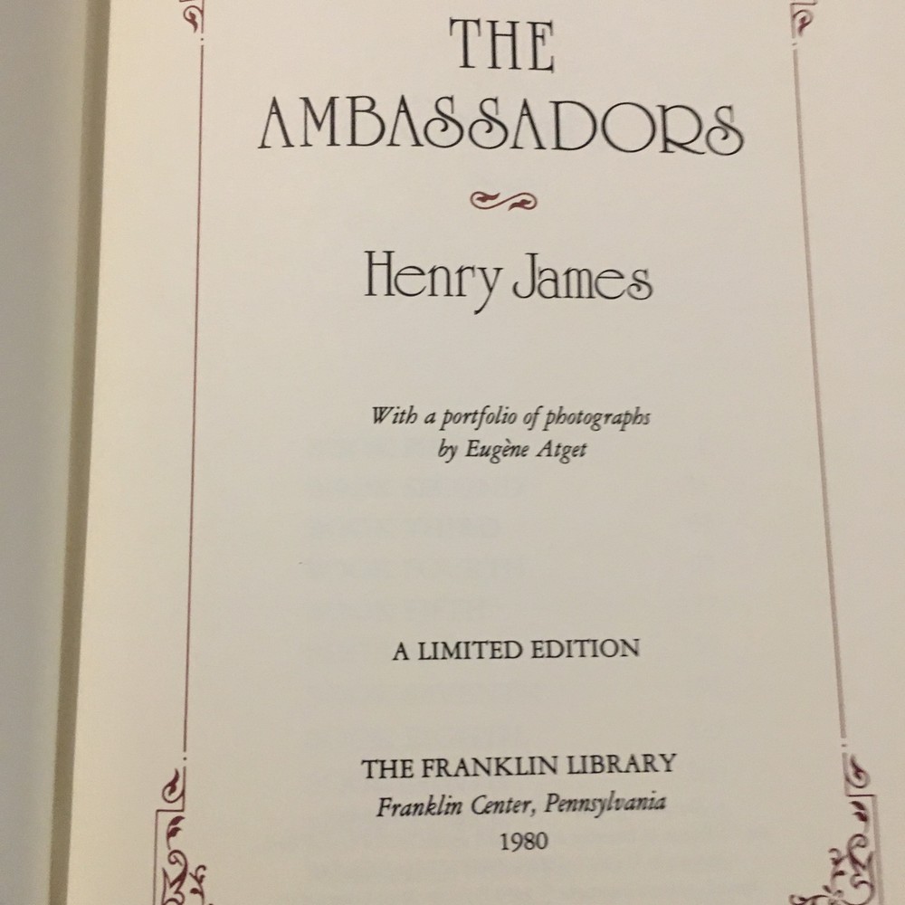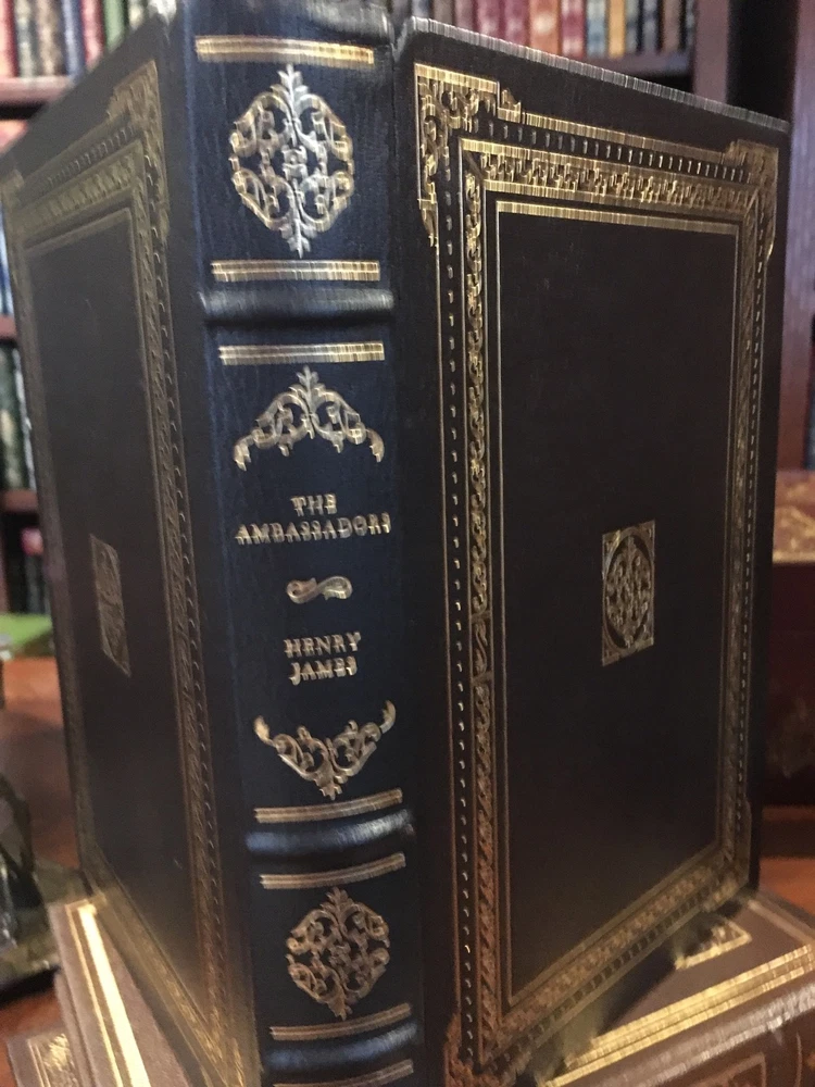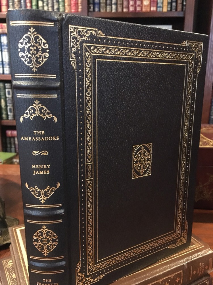 Franklin Library leather edition of Henry James's "The Ambassadors," a Limited edition, Illustrated by Eugene Atget , one of the 100 GREATEST BOOKS OF ALL TIME series, published in 1980. Bound in deep hunter green leather, the book has dark brown French moire silk end leaves, acid-free paper, Symth-sewn binding, a satin book marker, hubbed spine, gold gilding on three edges---in near FINE condition. Henry James, who lived from 1843-1916, was born in New York City, but grew up in Europe and the U.S. He graduated from HARVARD and entered Law School in 1862 but was bored after a year and returned to Europe where he lived for most of his life. Like many of James's novels, it is set in Europe. "Ambassadors" is the story of Lambert Strether, a middle-aged, yet not broadly experienced, man from Woollett, Massachusetts, who agrees to assume a mission for his wealthy fiancée: go to Paris and rescue her son, Chad Newsome, from the clutches of a presumably wicked woman. On his journey, Strether stops in England and there meets Maria Gostrey, an American who has lived in Paris for years. Her cynical wit and worldly opinions start to rattle Strether's preconceived view of the situation. In Paris, Strether meets Chad and is impressed by the much greater sophistication Chad seems to have gained during his years in Europe. Chad takes him to a garden party, where Strether meets Marie de Vionnet, a lovely woman of impeccable manners, separated from her reportedly unpleasant husband, and Jeanne, her exquisite daughter. Strether is confused as to whether Chad is more attracted to the mother or the daughter. At the same time, Strether, himself, feels an overwhelming attraction to Marie de Vionnet, which he suspects she might requite, and so begins questioning his commitment to return to Woollett and marry Chad's mother, despite his admiration for her. Meanwhile, Mrs. Newsome, Strether's fiancée and Chad's mother, impatiently waiting in America, enlists new "ambassadors" to return forthwith with Chad. 406 pages. I offer Combined shipping.