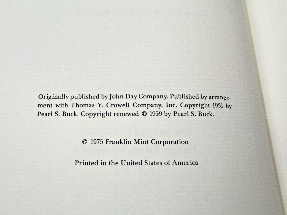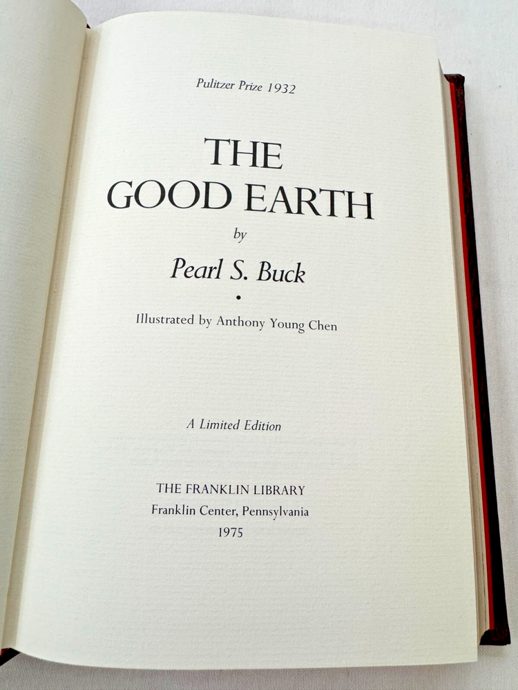From the Franklin Library of Pulitzer Prize Classics... The Good Earth by Pearl S. Buck Illustrated by Anthony Young Chen Copyright 1975 by The Franklin Library Bound in Premium Full Leather This volume contains all of these classic Franklin Library trimmings: Premium Leather Binding Silk-Moire Endleaves Distinctive Cover Design Hubbed Spine, Accented in Gold Satin Ribbon Page Marker Gilded Page Edges Long-lasting, High Quality Acid-neutral Paper Beautiful Illustrations DESCRIPTION A very scarce title in any condition, this 1975 First Edition is in Absolute Mint and Unread condition. The front and back covers are in near Perfect condition and the gilded page edges show no wear at all! There are no markings, bookplates, or other signs of prior ownership in this book. This Pulitzer Prize Edition was published by The Franklin Library and would be a beautiful addition to your Franklin Library book collection. Overall, this copy is a grade collector's book. This book is very elusive in this superior condition, as only a limited number of them were ever published, so now is the time to act. Hopefully you can add this book to your collection and enjoy it in the years to come... SHIPPING POLICY We take great care packaging every item to ensure safe shipment to you. Items are packaged using plenty of bubble wrap and packaged securely in a sturdy box. Our secure shipping methods have resulted in zero damaged items in over 15 years! Items are shipped out within 1 - 3 days of payment being received. RETURN & REFUND POLICY We accept refunds within 30 days of purchase. If you are not 100% satisfied with your purchase, please contact us about a refund, or initiate a refund through eBay. CONTACT US We are committed to providing our customers with the best possible on-line shopping experience. This includes a commitment to excellent customer service, before you purchase as well as after your order has been delivered. Please feel free to submit any questions or inquiries regarding this item or your order by sending us a message through the eBay messaging system. We will typically respond within 24 hours of receiving your message.