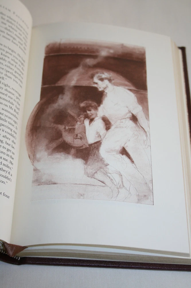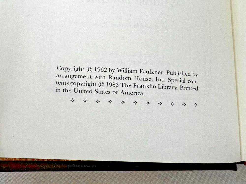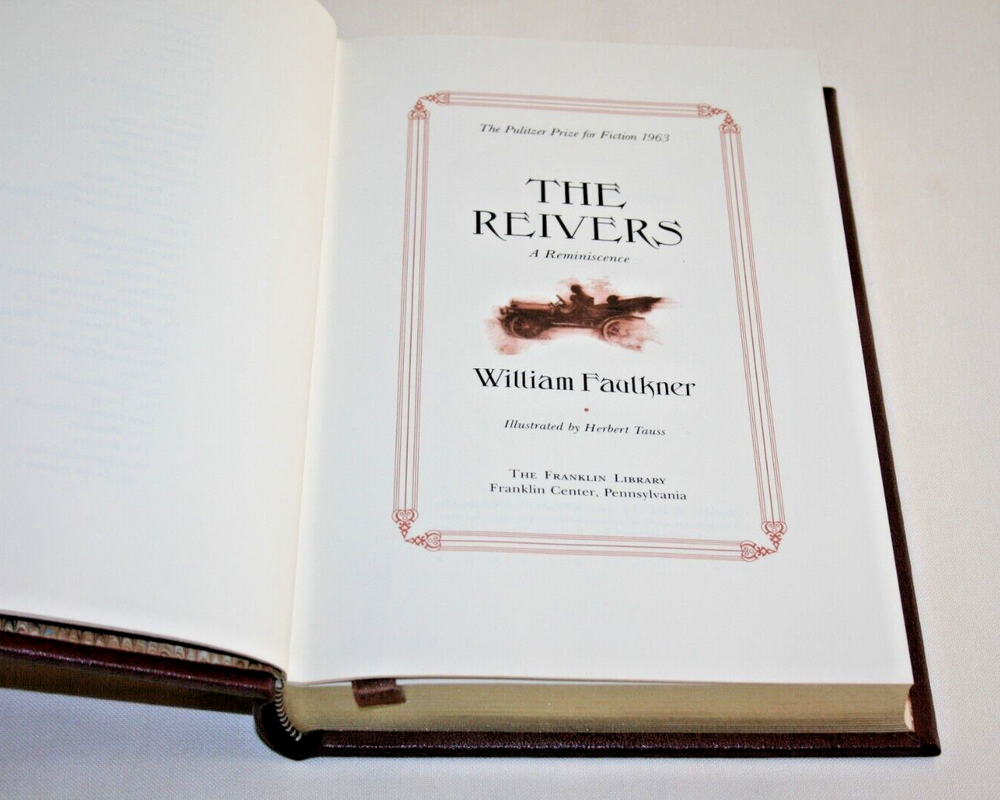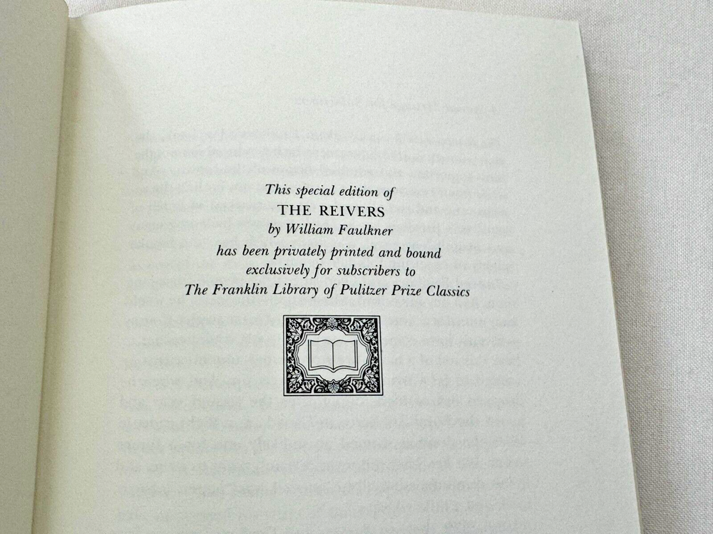 From the Franklin Library of Pulitzer Prize Classics... The Reivers by William Faulkner Illustrated by Herbert Tauss Copyright 1983 by The Franklin Library Bound in Premium Full Leather This volume contains all of these classic Franklin Library trimmings: Premium Leather Binding Decorated Endleaves Distinctive Cover Design Hubbed Spine, Accented in Gold Satin Ribbon Page Marker Gilded Page Edges Long-lasting, High Quality Acid-neutral Paper Beautiful Illustrations DESCRIPTION A very scarce title in any condition, this 1983 First Edition is in Absolute Mint and Unread condition. The front and back covers are in Perfect condition and the gilded page edges show hardly any wear at all! There are no markings, bookplates, or other signs of prior ownership in this book. This Pulitzer Prize Edition was published by The Franklin Library and would be a beautiful addition to your Franklin Library book collection. Overall, this copy is a grade collector's book. This book is very elusive in this superior condition, as only a limited number of them were ever published, so now is the time to act. Hopefully you can add this book to your collection and enjoy it in the years to come... SHIPPING POLICY We take great care packaging every item to ensure safe shipment to you. Items are packaged using plenty of bubble wrap and packaged securely in a sturdy box. Our secure shipping methods have resulted in zero damaged items in over 15 years! Items are shipped out within 1 - 3 days of payment being received. RETURN & REFUND POLICY We accept refunds within 30 days of purchase. If you are not 100% satisfied with your purchase, please contact us about a refund, or initiate a refund through eBay. CONTACT US We are committed to providing our customers with the best possible on-line shopping experience. This includes a commitment to excellent customer service, before you purchase as well as after your order has been delivered. Please feel free to submit any questions or inquiries regarding this item or your order by sending us a message through the eBay messaging system. We will typically respond within 24 hours of receiving your message.