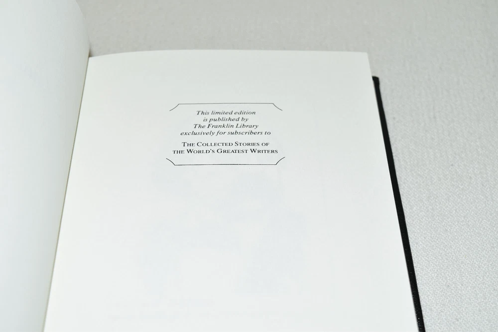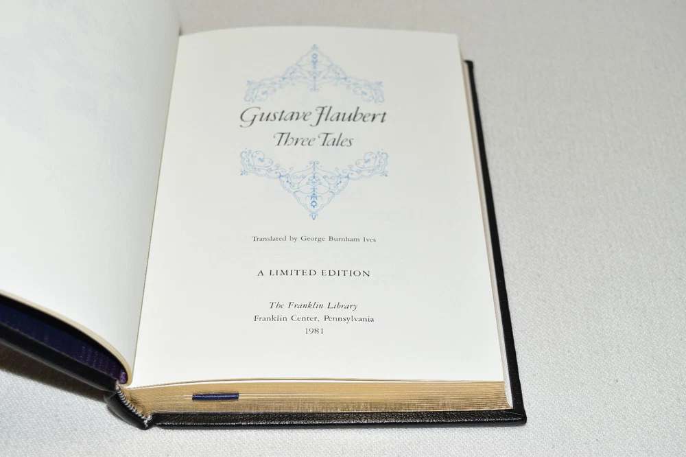 From the Franklin Library World's Greatest Writers Collection... Three Tales A Simple Heart The Legend of St. Julian the Hospitaller Herodias by Gustave Flaubert Illustrated by Andre Deslignieres Copyright 1981 by The Franklin Library Premium Full Leather Binding This volume contains all of these classic Franklin Library trimmings: Premium Leather Binding Silk Moire Endleaves Distinctive Cover Design Hubbed Spine, Accented in Gold Satin Ribbon Page Marker Gilded Page Edges Long-lasting, High Quality Acid-neutral Paper Beautiful Illustrations A very scarce title in any condition, this 1981 edition is in Fine condition. The front and back covers are in terrific condition and the gilded page edges show hardly any wear (see pictures of all sides). There are no markings, bookplates, or other signs of prior ownership in this book. This World's Greatest Writers Edition was published by The Franklin Library and would be a beautiful addition to your Franklin Library book collection. Overall, this copy is a grade collector's book. This book is very elusive in this superior condition, as only a limited number of them were ever published, so now is the time to act. Hopefully you can add this book to your collection and enjoy it in the years to come... Please Email Me With Any Questions You Might Have! Shipping Info: Buyer to Pay Shipping and Handling International Bidders Pay Extra Shipping Seller Not Responsible For Uninsured Items Lost or Damaged in Mail Forms of Payment Accepted: Paypal Good luck and happy bidding! Powered by eBay Turbo Lister The free listing tool. List your items fast and easy and manage your active items.