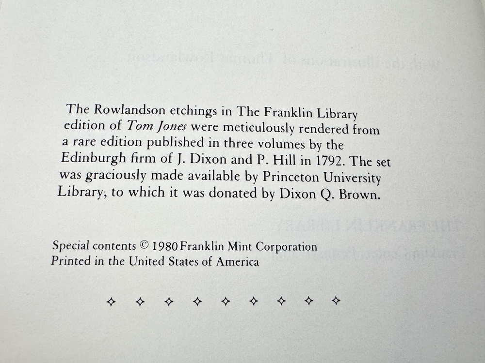 From the Franklin Library Collection... The History of Tom Jones by Henry Fielding Illustrated by Thomas Rowlandson Copyright 1980 by The Franklin Library Bound in Premium Full Leather This volume contains all of these classic Franklin Library trimmings: Premium Leather Binding Decorated Endleaves Distinctive Cover Design Hubbed Spine, Accented in Gold Satin Ribbon Page Marker Gilded Page Edges Long-lasting, High Quality Acid-neutral Paper Beautiful Illustrations DESCRIPTION A very scarce title in any condition, this 1980 Limited Edition is in Absolute Mint and Unread condition. The front and back covers are in Perfect condition and the gilded page edges show hardly any wear at all! There are no markings, bookplates, or other signs of prior ownership in this book. This Edition is published by The Franklin Library and would be a beautiful addition to your Franklin Library book collection. Overall, this copy is a grade collector's book. This book is very elusive in this superior condition, as only a limited number of them were ever published, so now is the time to act. Hopefully you can add this book to your collection and enjoy it in the years to come... SHIPPING POLICY We take great care packaging every item to ensure safe shipment to you. Items are packaged using plenty of bubble wrap and packaged securely in a sturdy box. Our secure shipping methods have resulted in zero damaged items in over 15 years! Items are shipped out within 1 - 3 days of payment being received. RETURN & REFUND POLICY We accept refunds within 30 days of purchase. If you are not 100% satisfied with your purchase, please contact us about a refund, or initiate a refund through eBay. CONTACT US We are committed to providing our customers with the best possible on-line shopping experience. This includes a commitment to excellent customer service, before you purchase as well as after your order has been delivered. Please feel free to submit any questions or inquiries regarding this item or your order by sending us a message through the eBay messaging system. We will typically respond within 24 hours of receiving your message.