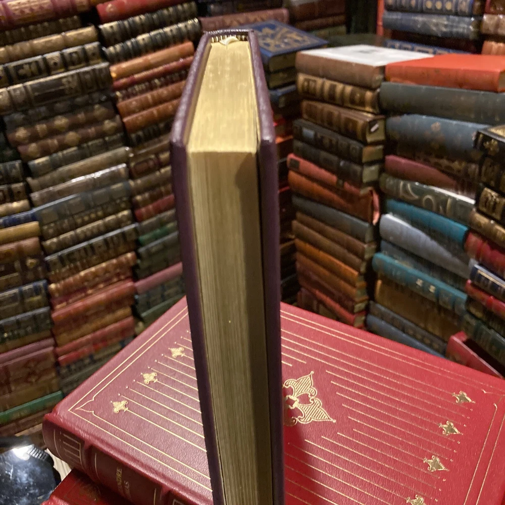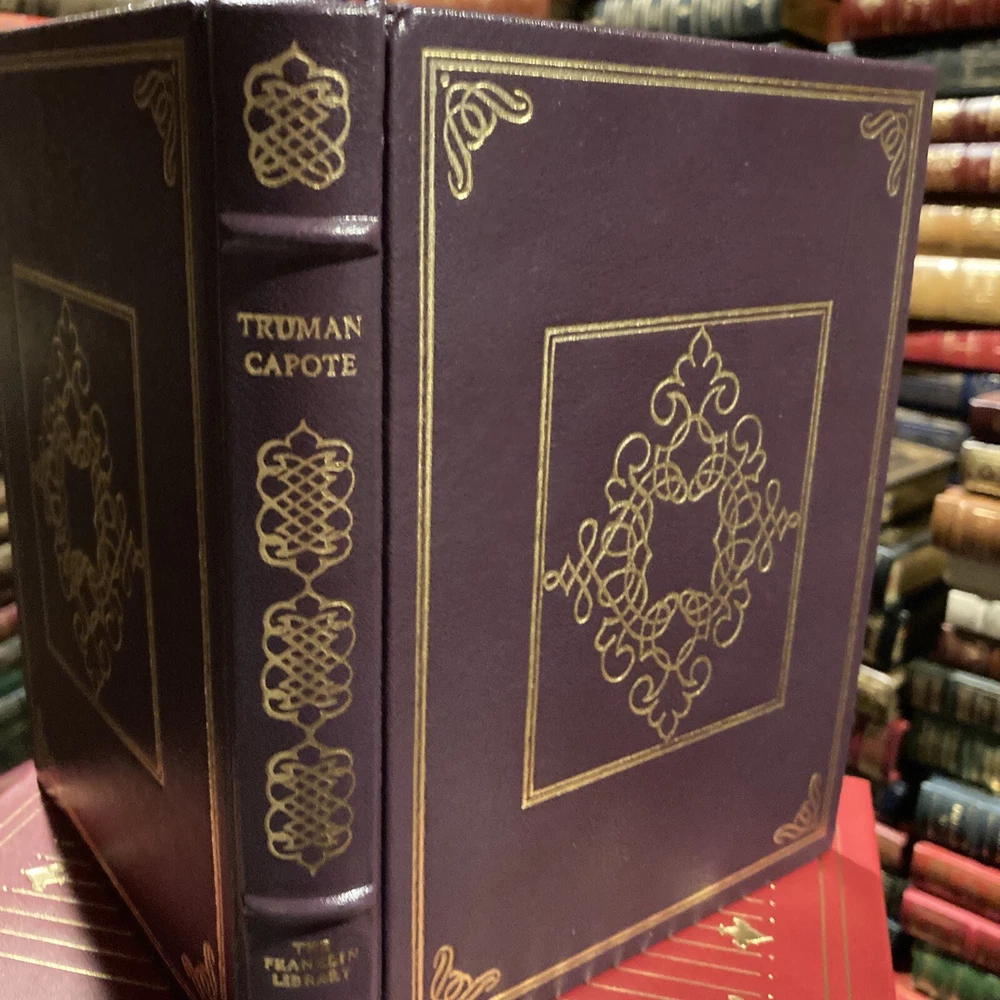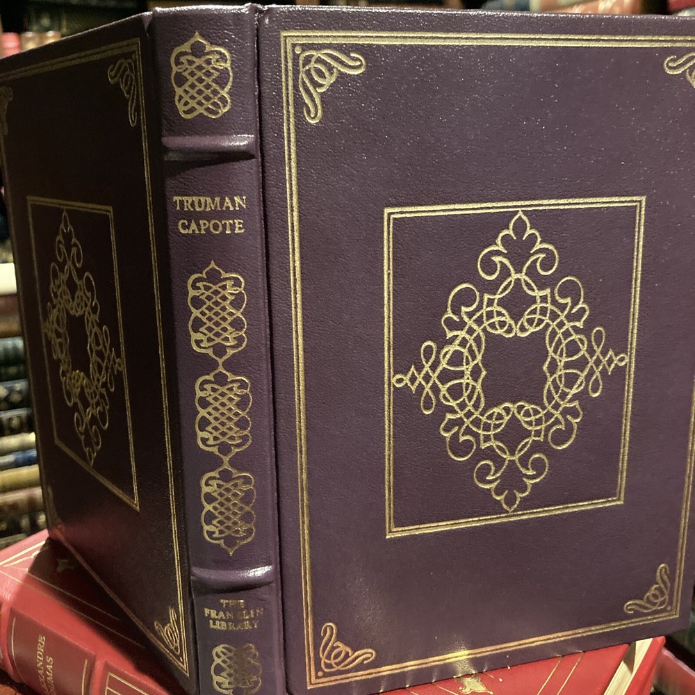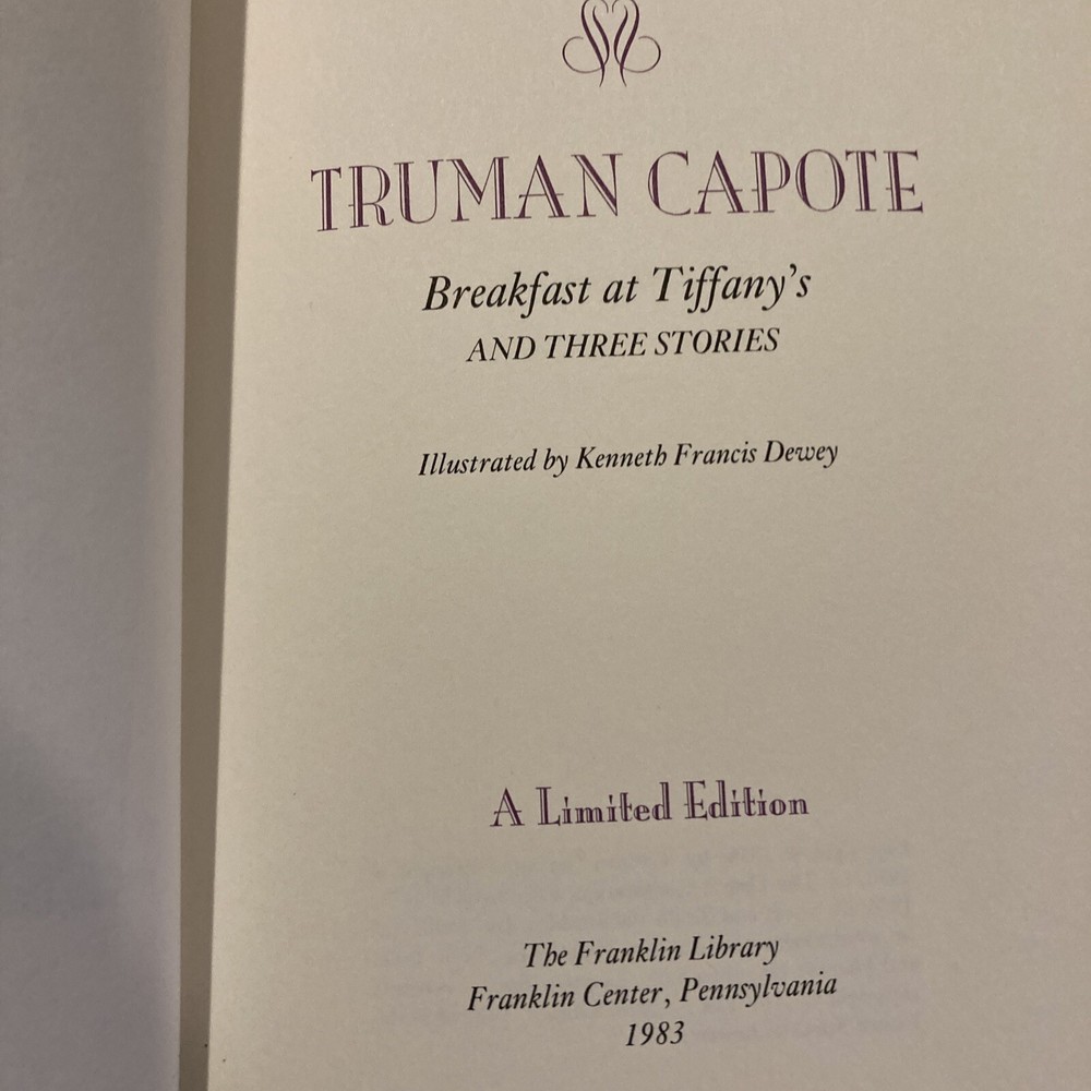 Franklin Library leather edition of Truman Capote's "Breakfast at Tiffany's and Three Stories," one of the COLLECTED STORIES OF THE WORLD'S GREATEST WRITERS series, Illustrated by Kenneth Francis Dewey, published in 1923. Bound in purple leather, the book has ivory French moire silk end leaves, hubbed spine, acid-free paper, Symth-sewn binding, a satin book marker, gold gilding on three edges---in near FINE condition. Truman Streckfus Persons, who lived from 1924 – 1984, known as Truman Capote, was an American novelist, screenwriter, playwright, and actor. "Breakfast at Tiffany's" has been described as a humorous portrait of a Manhattan playgirl, eighteen-year-old HOLLY GOLIGHTLY. Set on the fashionable Upper East Side in war-time 1943, the novel is told in flashbacks by a young unpublished writer whom Holly calls Fred, after her adored brother. Both newly arrived in New York, Holly and Fred, who live in the same brownstone, meet late one evening when Holly climbs up the fire escape and through his window to escape her drunken date. . .Holly confesses that "I've only had eleven lovers" and Fred is fascinated. A cast of outrageous characters regularly gathers in Holly's apartment for hilarious, rowdy parties. "House of Flowers" and "A Diamond Guitar" are both delicate stories, in spite of the fact that they deal with, respectively, prostitutes and convicts. Capote paints the prostitute OTTILIE in "House of Flowers" with delicacy. "A Christmas Memory" is the story of a seven-year-old boy, BUDDY, and his cousin, an elderly woman in tennis shoes who Buddy calls my friend. They bake fruitcakes and deliver them to elderly friends in a dilapidated baby carriage. The thirty-one cakes are made of cherries and citron, ginger and vanilla and canned Hawaiian pineapple, rinds and raisins and walnuts and whiskey---a somewhat autobiographical retelling of Capote's own childhood in Alabama. 174 pages---a RARE title. I offer combined shipping.