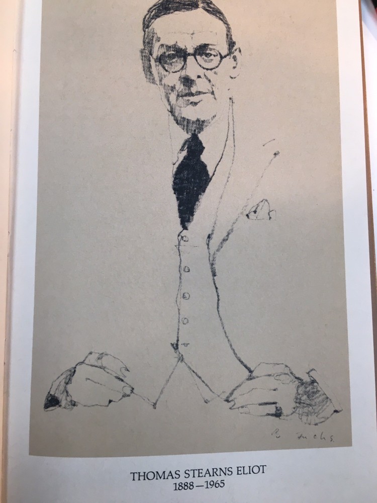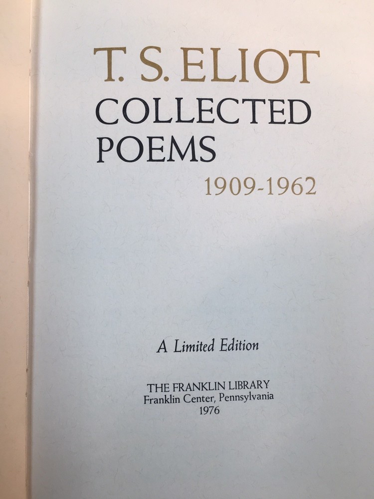 Franklin Library leather edition of T.S. Eliot's "Collected Poems, 1909-1962," a Limited edition, Frontispiece Portrait of Eliot by Bernard Fuchs, one of the 100 GREATEST BOOKS OF ALL TIME series, published in 1976. Bound in camel tan leather, the book has brown French moire silk end leaves, acid-free paper, Symth-sewn binding, a satin book marker, gold gilding on three edges---in near FINE condition. Thomas Stearns Eliot, who lived from 1888 – 1965, better known by his pen name T. S. Eliot , was an American-born British essayist, publisher, playwright, literary and social critic and one of the twentieth century's major poets. He moved to England in 1914 at age 25, settling, working and marrying there. He was eventually naturalized as a British subject in 1927 at age 39, renouncing his American citizenship. Eliot attracted widespread attention for his poem "The Love Song of J. Alfred Prufrock" (1915), which is seen as a masterpiece of the Modernist movement. It was followed by some of the best-known poems in the English language, including "The Waste Land" (1922), "The Hollow Men" (1925), "Ash Wednesday" (1930) and "Four Quartets" (1945). He was awarded the NOBEL PRIZE in LITERATURE in 1948, "for his outstanding, pioneer contribution to present-day poetry." 212 pages. I offer Combined shipping.