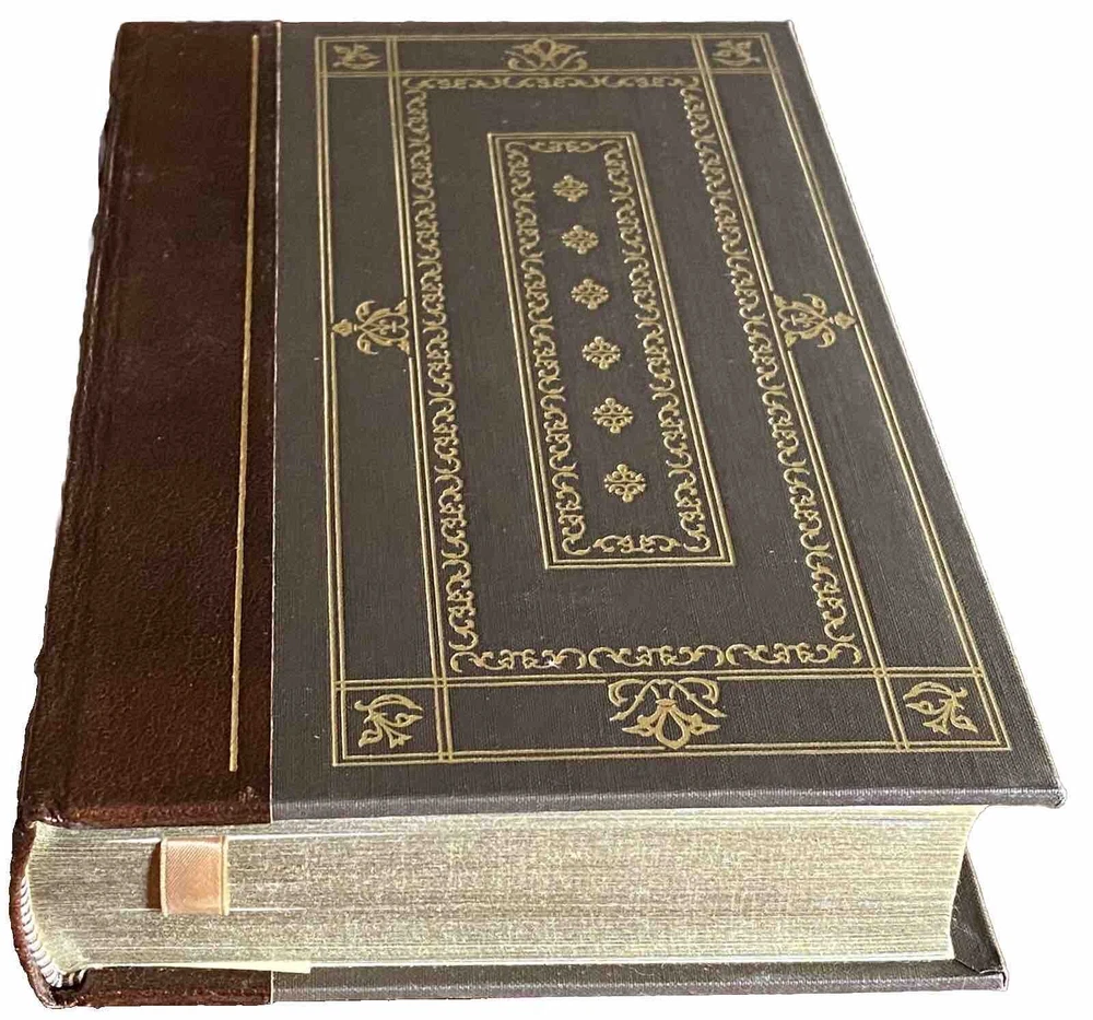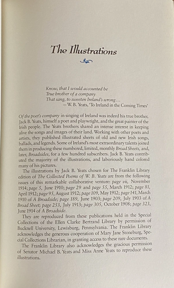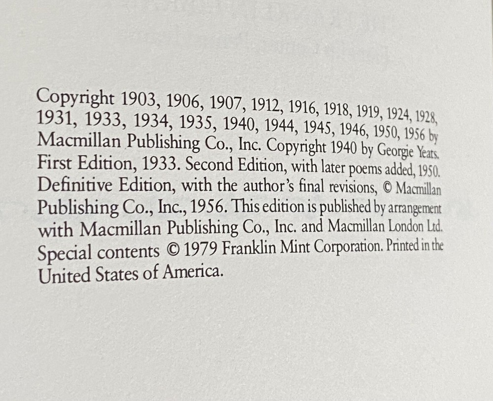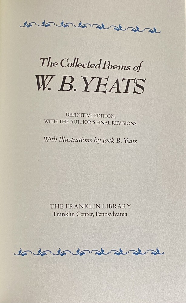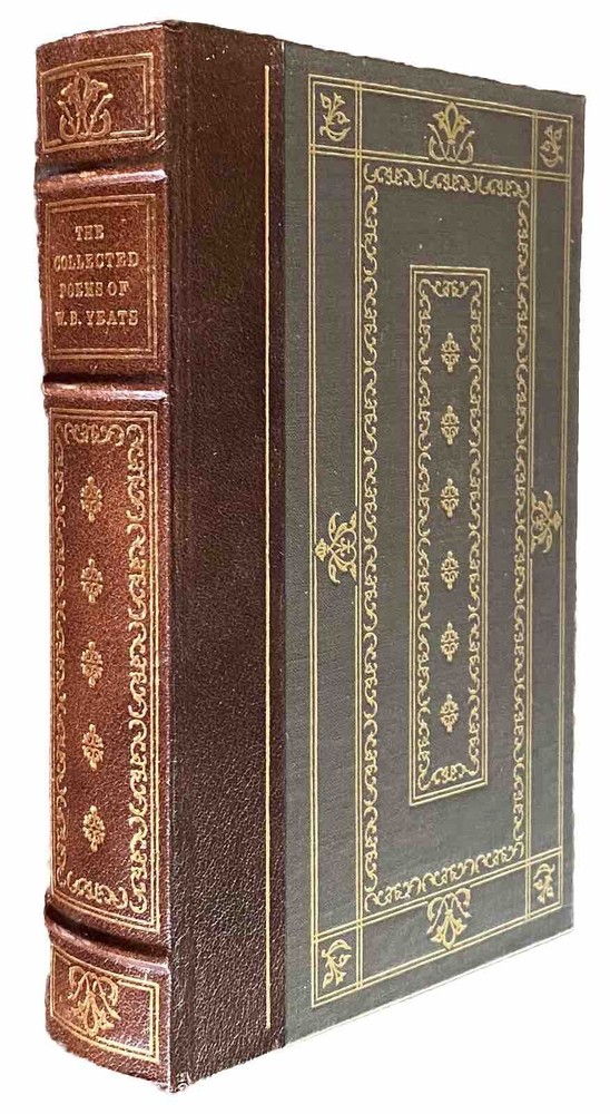 This leatherbound book is a collector's dream, featuring a limited edition first printing of The Collected Poems of W. B. Yeats, Definitive Edition. The book is beautifully illustrated and in excellent condition, making it an ideal addition to any poetry lover's collection. The publisher, Franklin Library, is known for producing high-quality books and this one is no exception. This edition of this timeless classic is written in English and is bound to impress. Partial brown leather binding with gilt decoration to covers and spine, ribbon page marker, gilt page edges, marbled endpapers. Multiple illustrations by Jack B. Yeats. Tight binding, no missing, loose or torn pages, no writing. 522 pages.