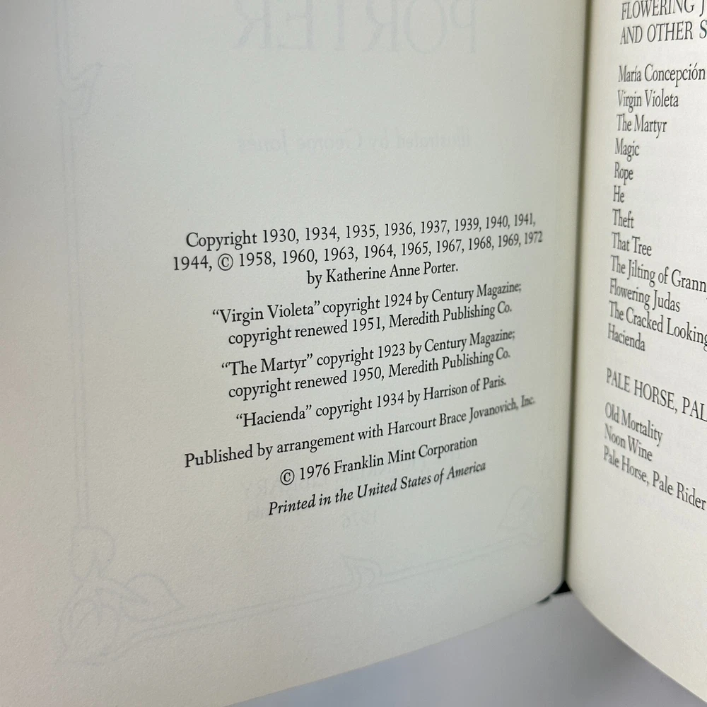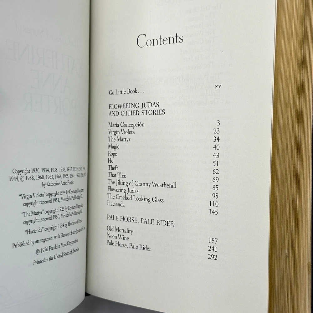 "The Collected Stories of Katherine Anne Porter" 1976 The Franklin Library Full Leather Size: 6" x 9" Pulitzer Prize for Fiction (1966) National Book Award (1966) Condition: Feels tight and unread. Faint wear to edge gilding as shown. Faded endpaper edges. Clean and sharp within. No markings. No scent. See pictures for condition references. Please ask any questions before purchasing. ----------- Orders are carefully packed and shipped in boxes. We combine shipping on orders with multiple items.
