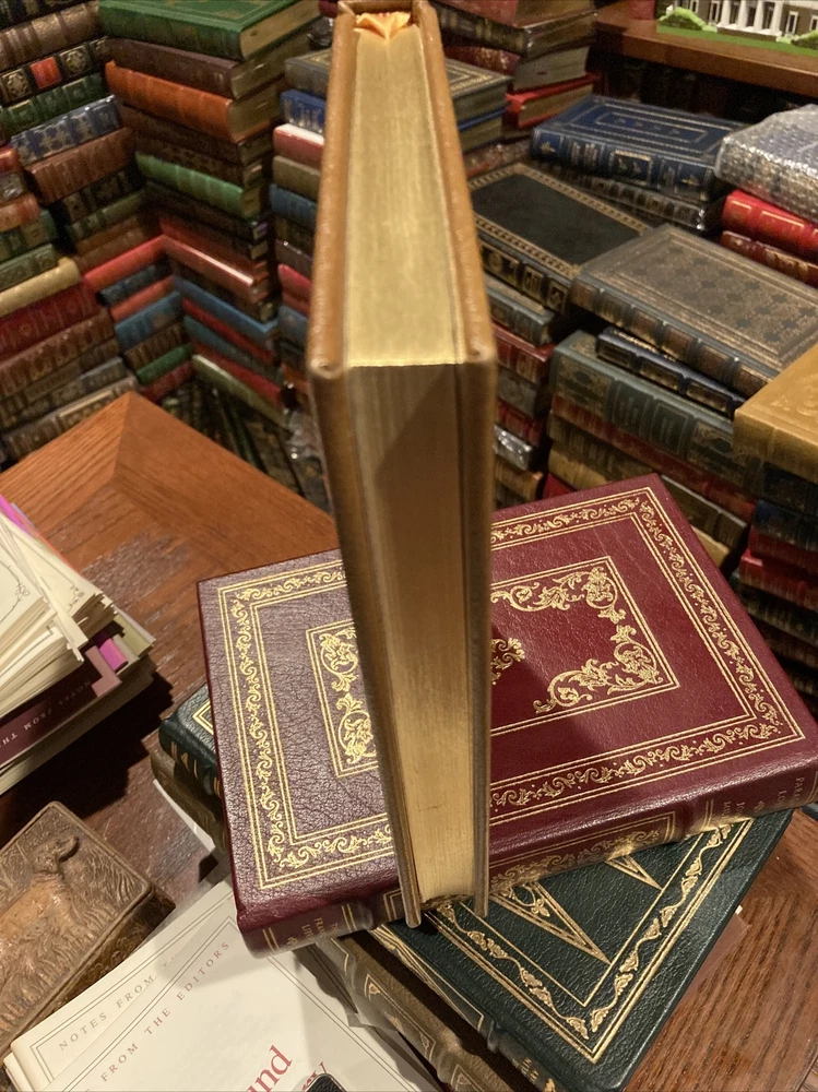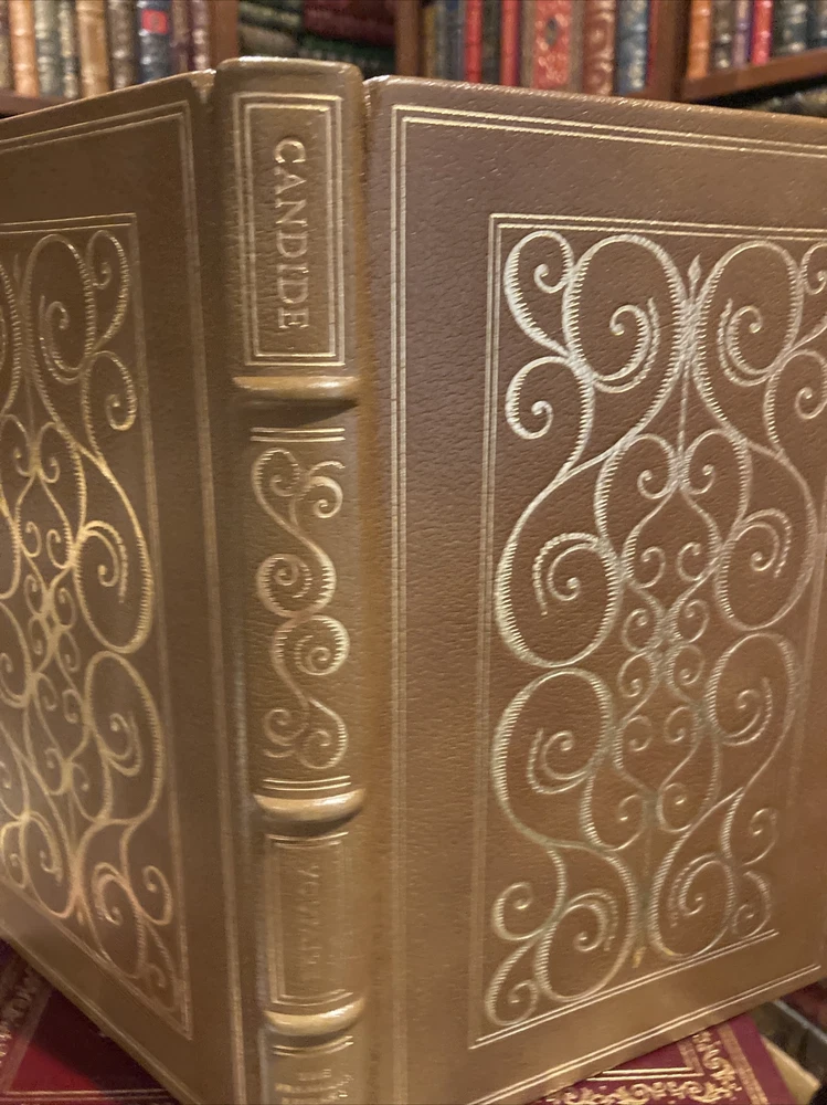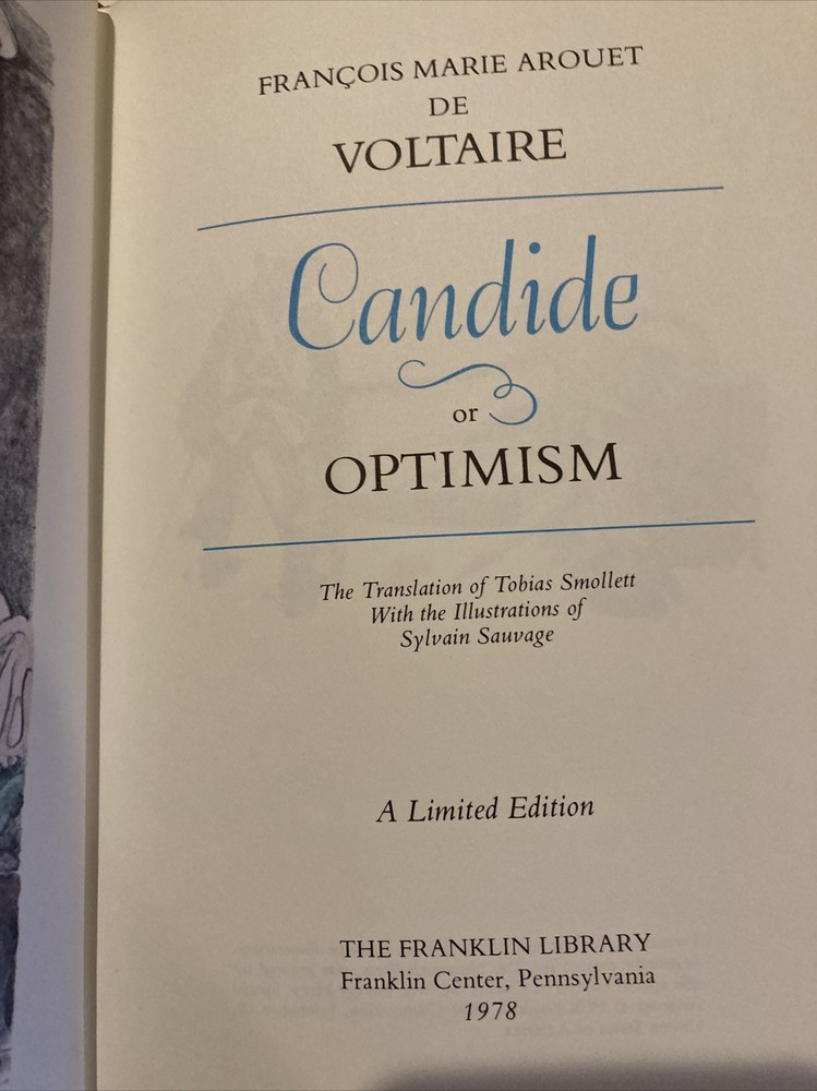 Franklin Library leather edition of Francois Marie Arouet de Voltaire's "Candide or Optimism," Translated by Tobias Smollett, Illustrated by Sylvain Savage, a Limited edition, one of the 100 GREATEST BOOKS OF ALL TIME series, published in 1978. Bound in camel tan leather, the book has gold moire silk end leaves, hubbed spine, a satin book marker, acid-free paper, Symth-sewn binding, gold gilding on three edges---in FINE condition. François-Marie Arouet, who lived from 1694 – 1778, known by his pen name, Voltaire, was a French Enlightenment writer whose attacks on the established Catholic Church, and his advocacy of freedom of religion and expression and separation of church and state made him controversial. "Candide: or, Optimism" begins with a young man, Candide, who is living a sheltered life in an Edenic paradise and being indoctrinated with "optimism" by his mentor, Professor Pangloss. Candide is kicked out of paradise for kissing the Baron's daughter and slowly and often painfully experiences disillusionment as he witnesses and experiences great hardships in the world, searching for a "perfect place," but everywhere he finds man's greed, lust, violence, and indifference, even among church officials. Only in EL DORADO, a never-never land, does Candide find happiness, wealth, contentment, but after a month he cannot stand "paradise" because he says he does not have "Miss Cunegund." Candide's three mentors: Dr. Pangloss, Cacambo, and Martin---three men, one an optimist, one a realist, and one a pessimist---cannot provide him the answers to life. The author does not attempt any historical accuracy, and some of the problems Candide faces are thinly disguised references to social and political problems of Voltaire's own day. 215 pages. I offer Combined shipping.
