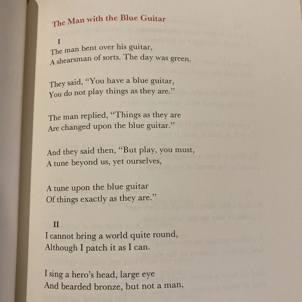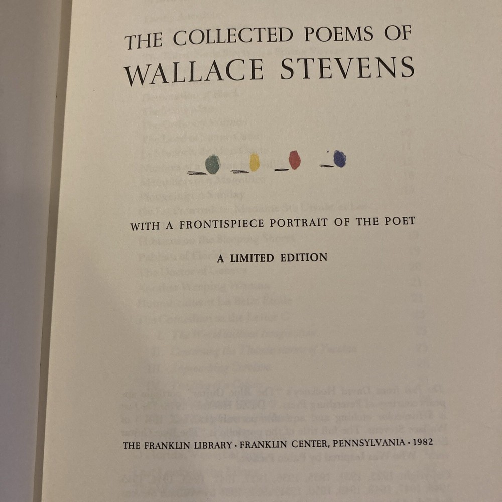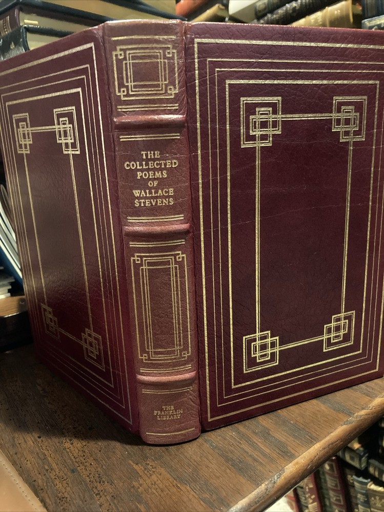 Franklin Library leather edition of "The Collected Poems of Wallace Stevens," a Limited edition, Frontispiece Portrait of the Poet by David Hockney from 'The Blue Guitar portfolio,' one of the 100 GREATEST MASTERPIECES OF AMERICAN LITERATURE series, published in 1982. Bound in burgundy leather, the book has ivory moire silk end leaves, acid-free paper, Symth-sewn binding, a satin book marker, gold gilding on three edges---in near FINE condition. Wallace Stevens, who lived from 1879-1955, was an American modernist poet. He was born in Pennsylvania and graduated from HARVARD and New York Law School. Stevens spent most of his life working as an insurance agent in Hartford, Connecticut. He was awarded the PULITZER PRIZE for Poetry in 1955. Some of his major poems included "Harmonium," "Transport to Summer," "The Cuban Doctor," "Bantams in Pine-Woods," "Sonatina to Hans Christian," "Of Hartford in a Purple Light," "Like Decorations in a Nigger Cemetery," "Nudity in the Colonies," "The Man with the Blue Guitar," "The Auroras of Autumn," "Disillusionment of Ten O' Clock," "The Idea of Order at Key West," "Sunday Morning," "The Irish Cliffs of Moher," "Anything is Beautiful If You Say It Is," "Sunday Morning," "The Virgin Carrying a Lantern," "The Emperor of Ice Cream," "Peter Quince at the Clavier," "The Snow Man," "The Doctor of Geneva," "Infanta Marina," "The Paltry Nude Starts on a Spring Voyage," "Ploughing on Sunday," "O Florida, Venereal Soil," "The Idea of Order at Key West," "Anecdote of the Jar," and my favorites: "Thirteen Ways of Looking at a Blackbird," and " A High-Toned Old Christian Woman." 468 pages, including an index of First Lines. I offer combined shipping.
