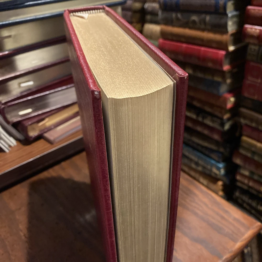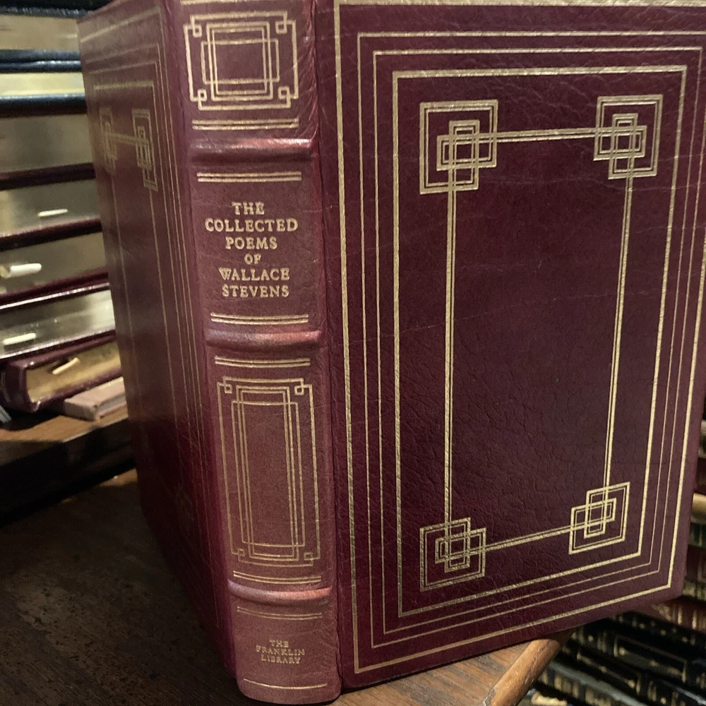 This stunning Franklin Library edition of Wallace Stevens' collected poems is a true collector's gem. The burgundy leather binding and gold accents give it a luxurious feel, while the David Hockney portrait adds artistic flair. The quality craftsmanship—from the Smyth-sewn binding to the silk end leaves—makes this limited edition a joy to hold. Stevens' brilliant modernist poetry shines even brighter in this elegant presentation, perfect for any literature lover's shelf. The near-fine condition preserves its timeless beauty.