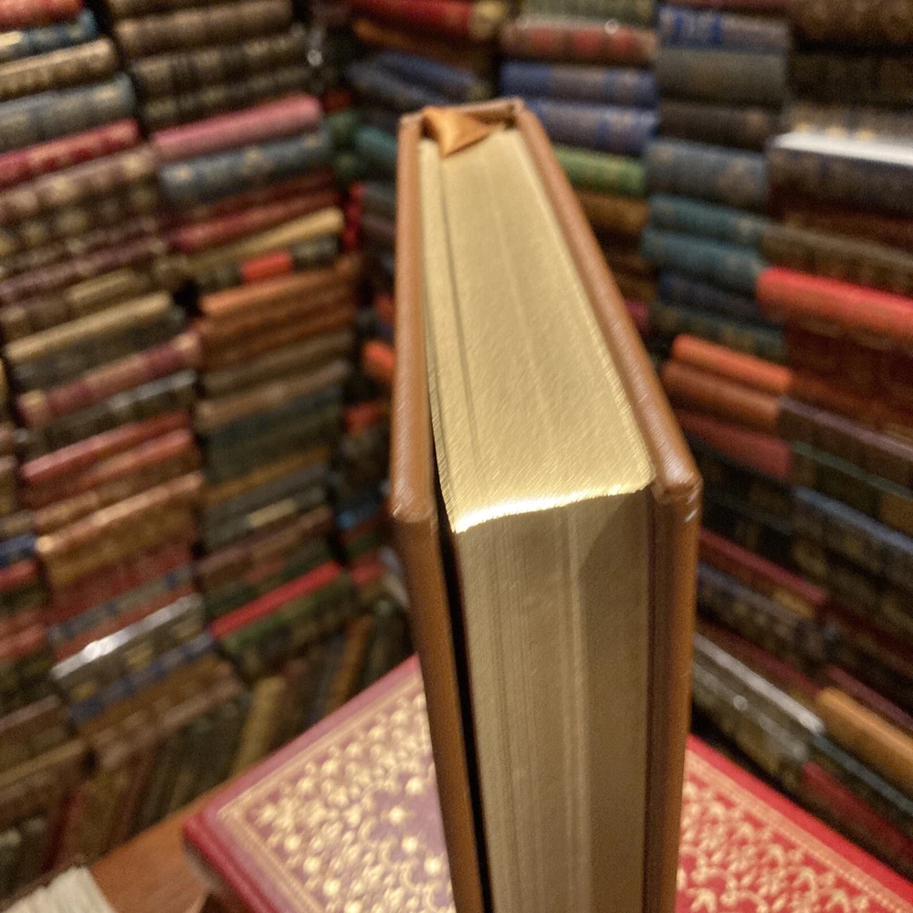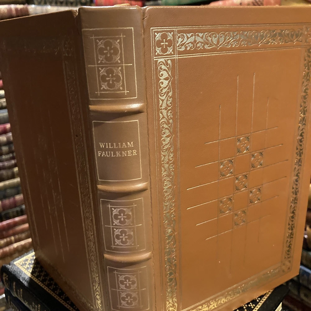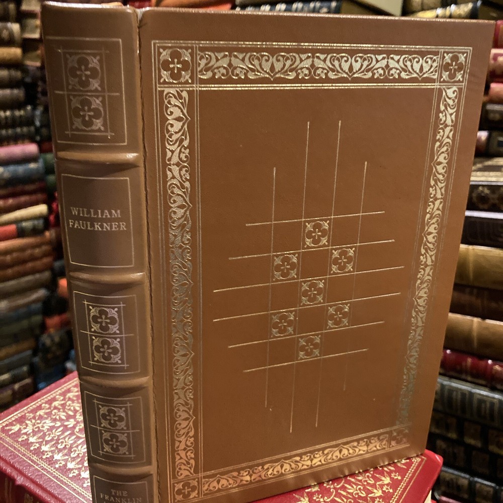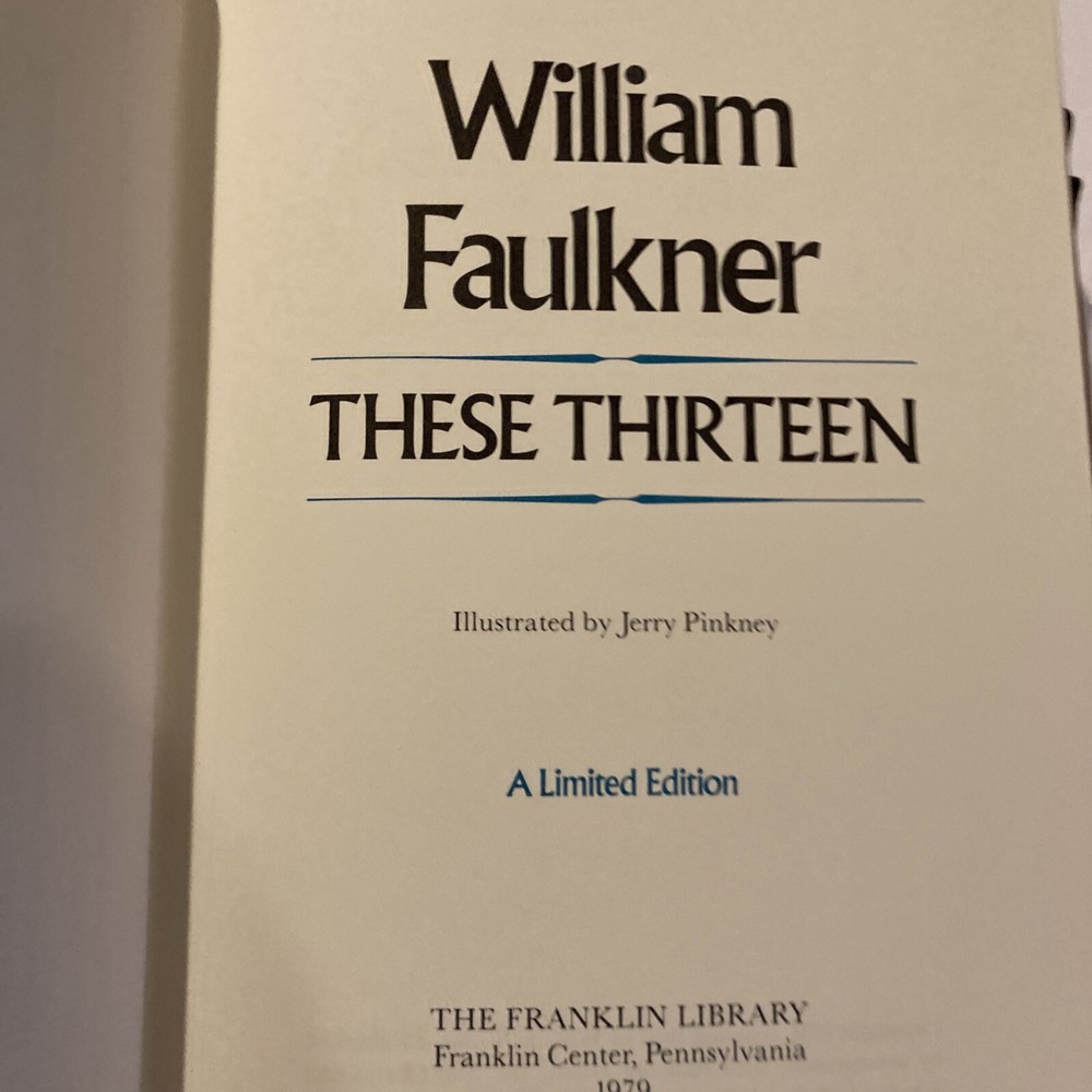 Franklin Library leather edition of William Faulkner's "These Thirteen, " a Limited edition, Illustrated by Jerry Pickney, one of the COLLECTED STORIES OF THE WORLD'S GREATEST WRITERS series, published in 1979. Bound in deep tan leather, the book has rust French moire silk end leaves, acid-free paper, Symth-sewn binding, a satin book marker, hubbed spine, gold gilding on three edges---in near FINE condition. William Cuthbert Faulkner, who lived from 1897 ā 1962, was an American writer and the 1949 NOBEL PRIZE laureate from OXFORD, MISSISSIPPI. Stories include: "Victory," "Ad Astra," "All the Dead Pilots," "Crevasse," "Red Leaves," "A Justice," "Hair," "That Evening Sun," "Dry September," "Mistral," "Divorce in Naples," "Carcassonne," and my favorite: "A Rose for Emily," the story of a woman who murdered Homer Barron, a Yankee she fell in love with and when he planned to leave "Miss Emily" she killed him and kept him upstairs----fooling the town's people into believing Homer had left. 296 pages, including a Chronology and Genealogy. I offer Combined shipping.