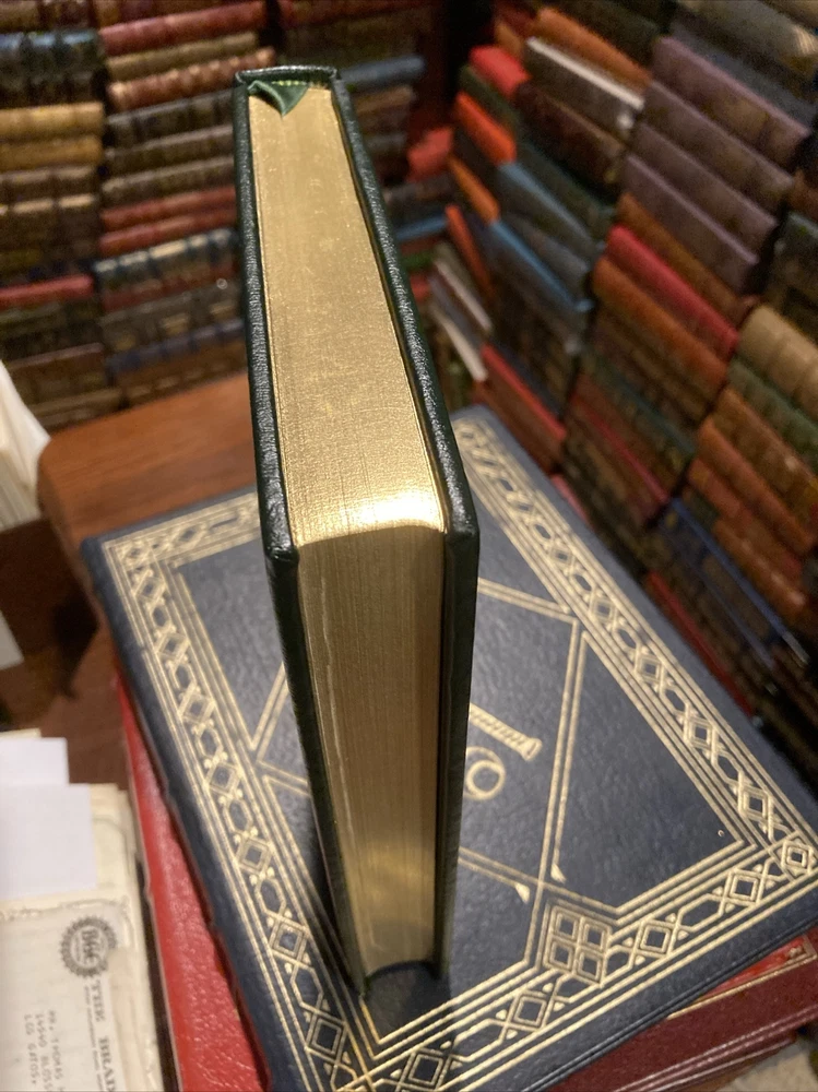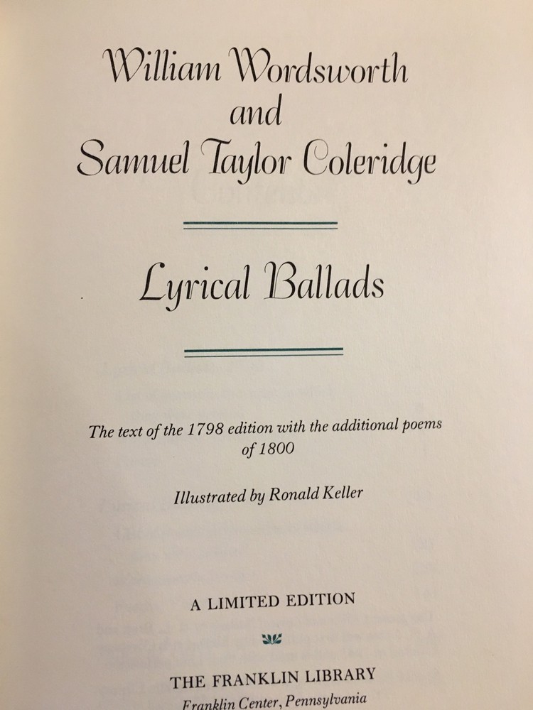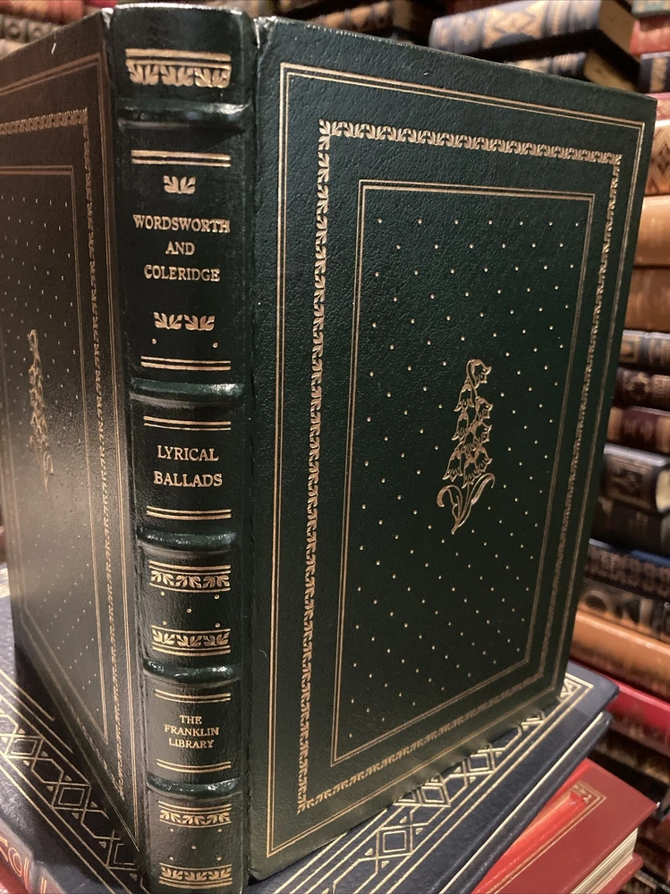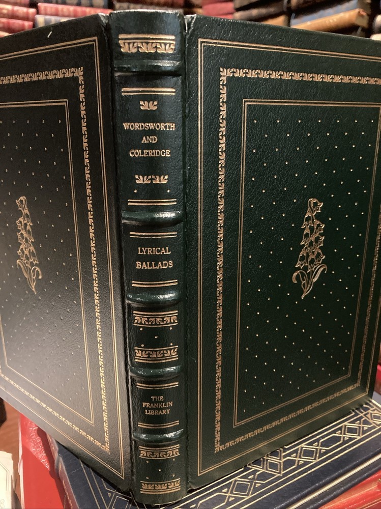 Franklin Library leather edition of William Wordsworth and Samuel Taylor Coleridge's "Lyrical Ballads," a Limited edition, Illustrated by Ronald Keller, the text of the 1798 edition with the additional poems of 1800, one of the 100 GREATEST BOOKS OF ALL TIME series, published in 1982. Bound in hunter green leather, the book has matching moire silk end leaves, a satin book marker, Symth-sewn binding, acid-free paper, hubbed spine, gold gilding on three edges---in near FINE condition. William Wordsworth, who lived from 1770 – 1850, was a major English Romantic poet who helped to launch the Romantic Age in English literature with the publication "Lyrical Ballads." This volume includes his most famous poems. Wordsworth was Britain's POET LAUREATE from 1843 until his death in 1850. Samuel Taylor Coleridge, who lived from 1772-1834, was educated at Jesus College, Cambridge. Wordsworth's poems: "I Wandered Lonely As a Cloud," "Lines Written a Few Miles Above Tintern Abbey," "The Mad Mother," "We Are Seven," "Poor Susan," "A Poet's Epitaph," "Rural Architecture," "The Childless Father," "Ruth," and Others. This volume also includes Coleridge's "Goody Blake and Harry Gill," "Lines Written in Early Spring," "The Thorn," "The Last of the Flock," and "The Rime of the Ancient Mariner." 274 pages. I offer Combined shipping.