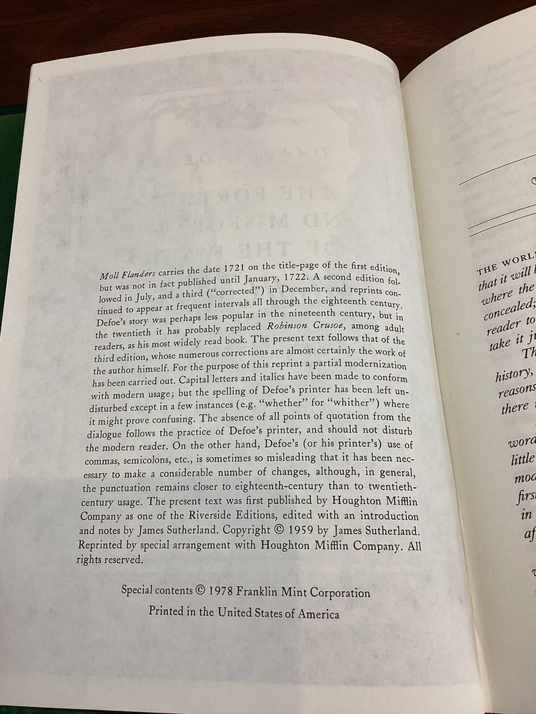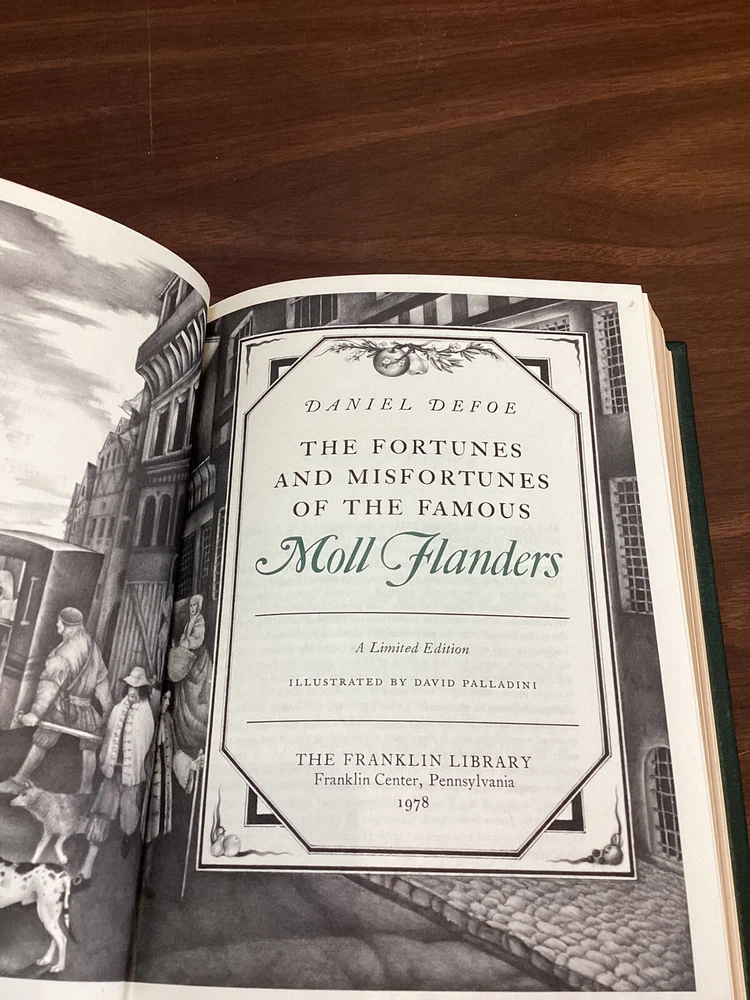 This limited edition book published by Franklin Library in 1978, the classic work of Daniel Defoe, "Moll Flanders". The beautiful leather binding and original copy make it a must-have for any collector of literature and fiction. The publisher, Franklin Library, is known for its high-quality publications and this book is no exception. It is a great addition to any collection. Book is very nice, sharp corners, tight spine with white pages. Appears to be unread, small smudge on the back cover.