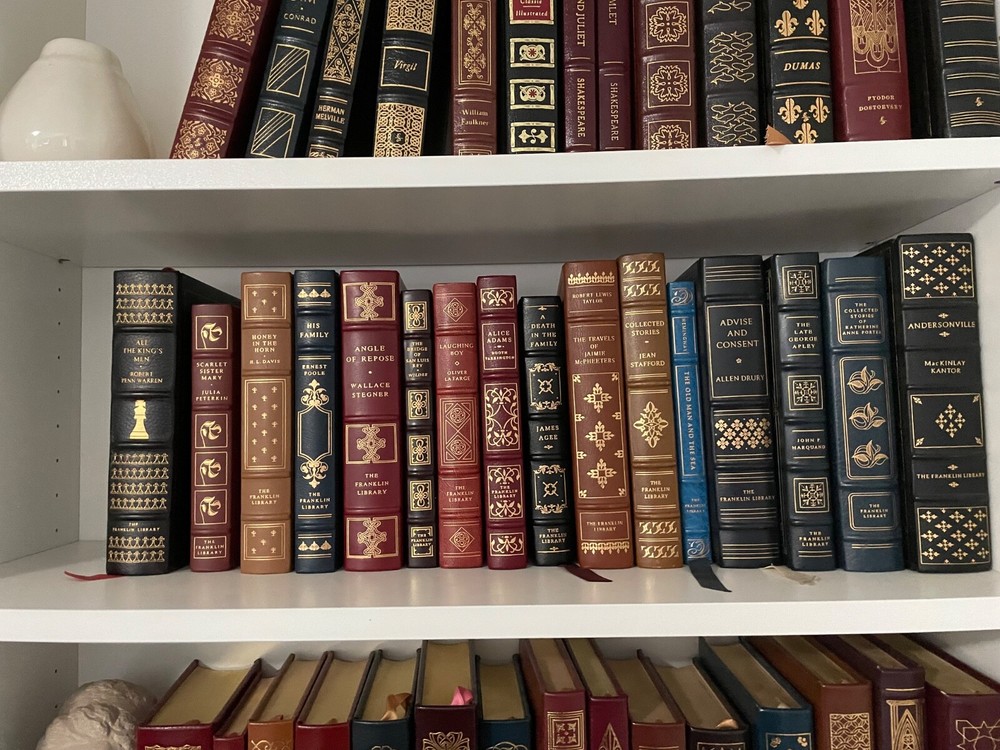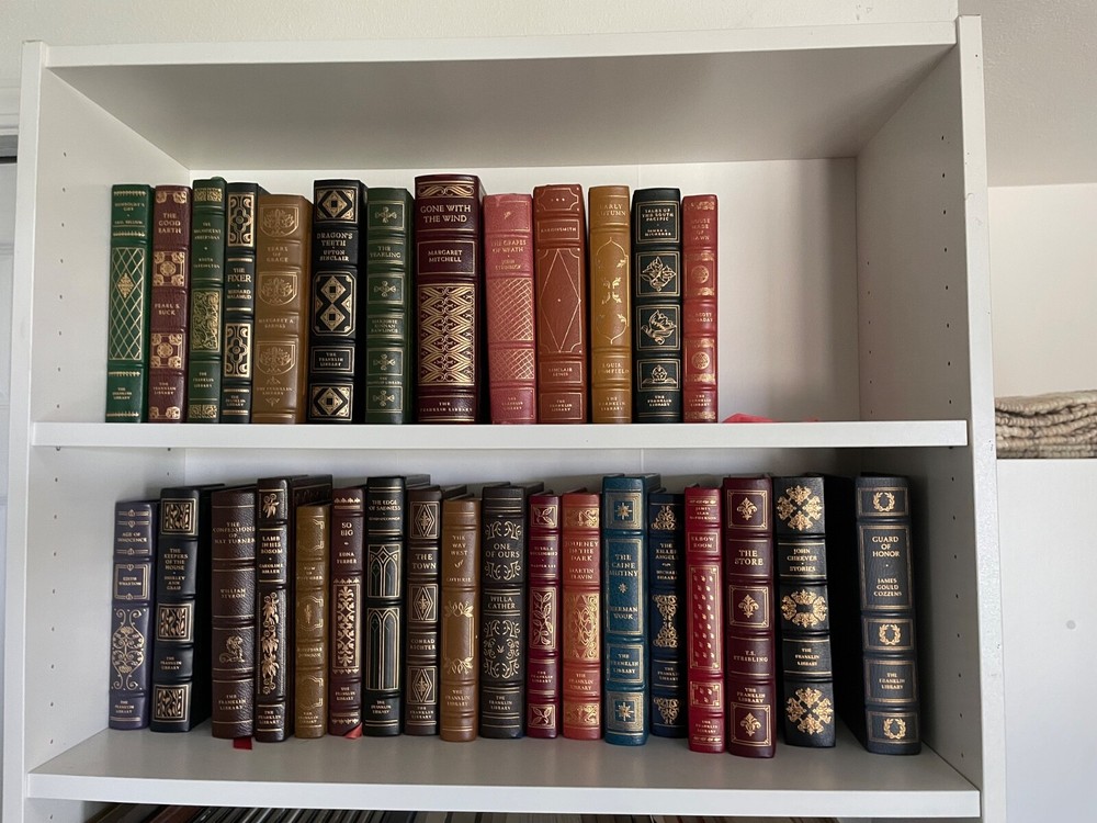 This collection of books from Franklin Library features beautiful leather bindings and a variety of classic and contemporary authors. The books are in their original state and language is English. The collection is perfect for lovers of literature and fiction, and the books are sure to be a great addition to any bookshelf. Perfect Condition. Most all of them have never beed opened and read.