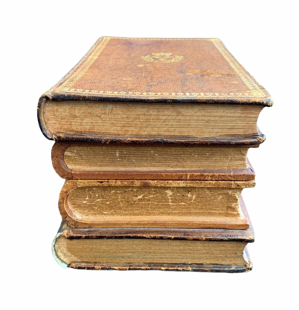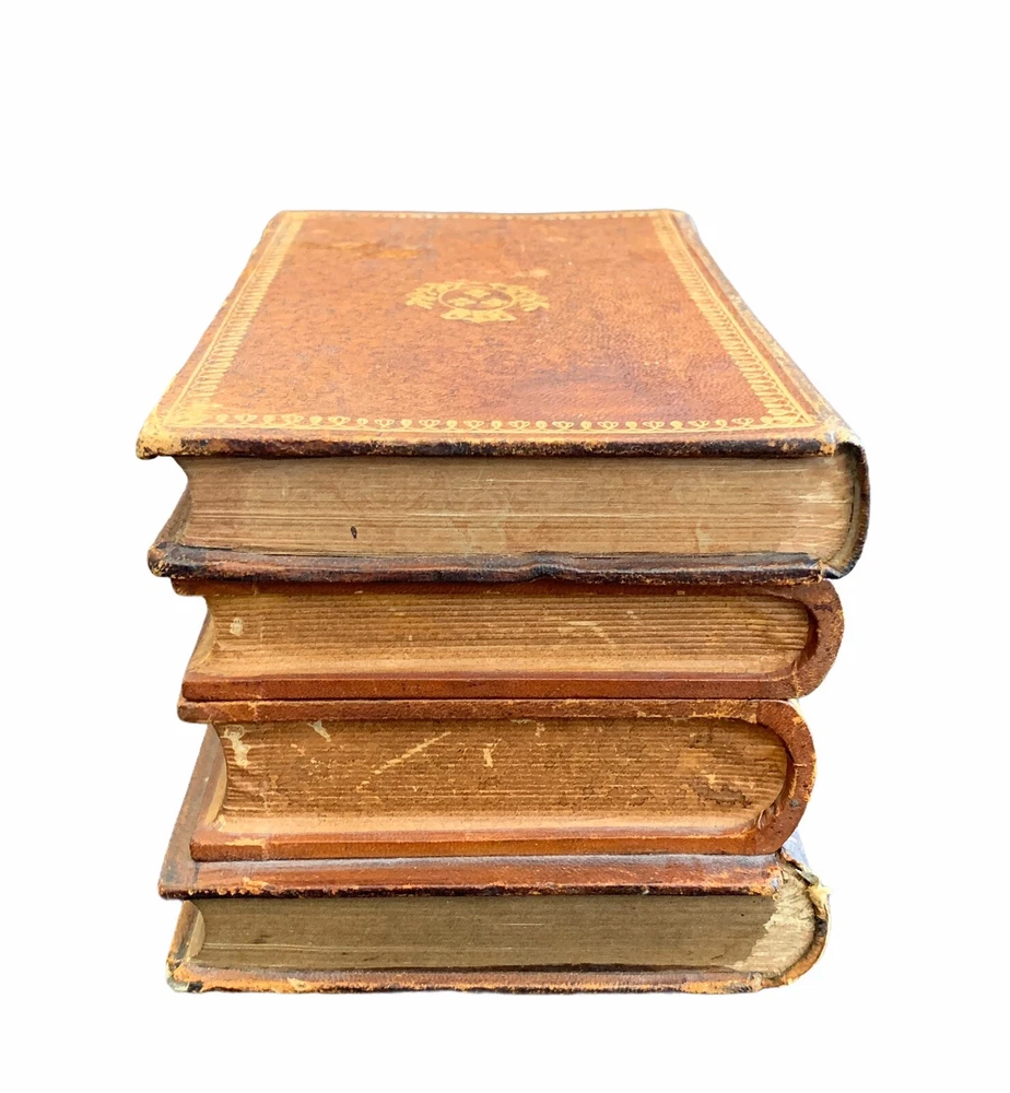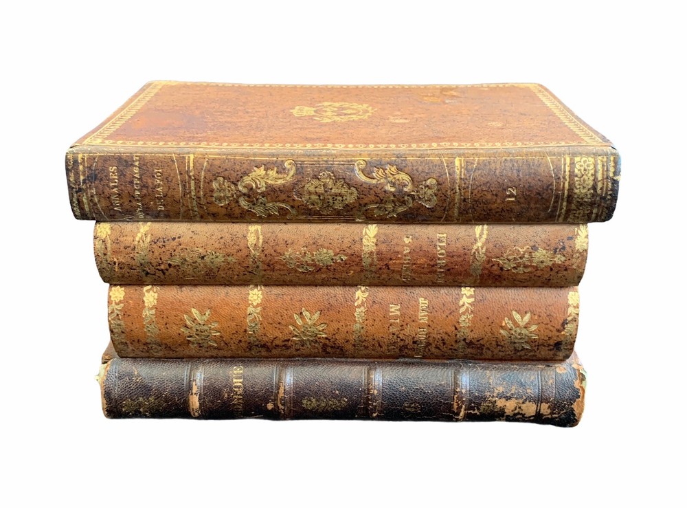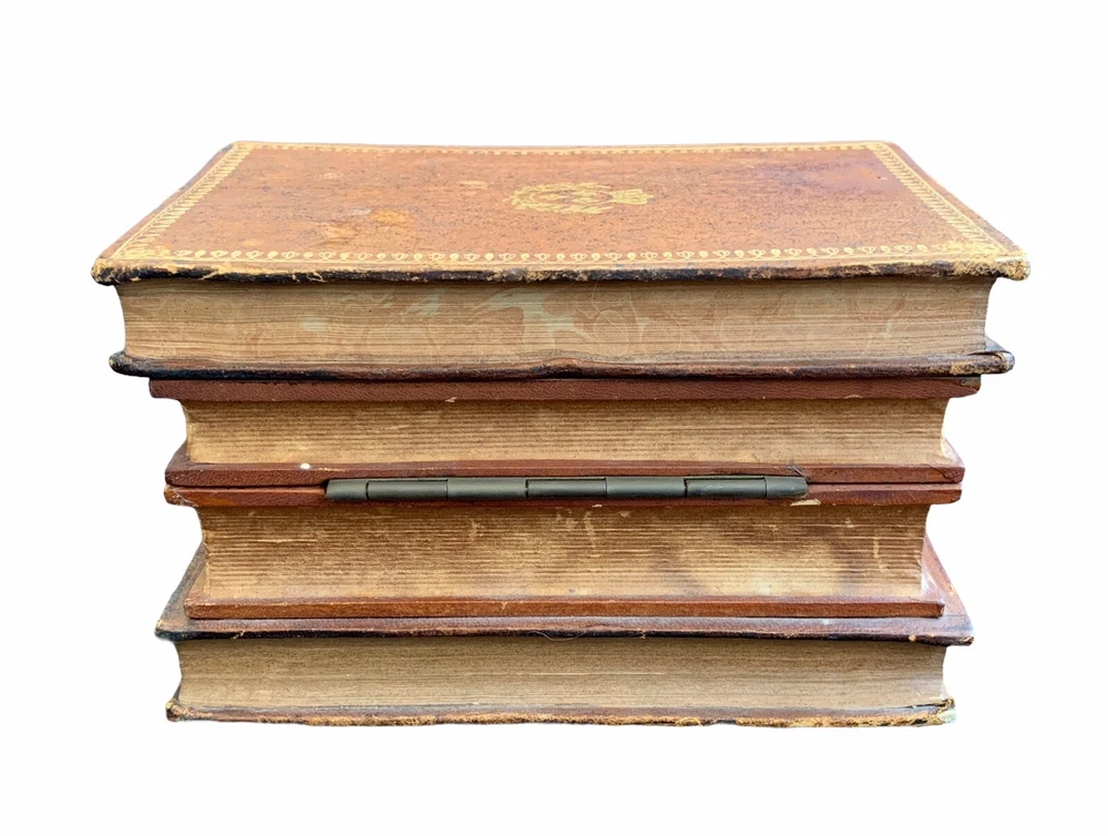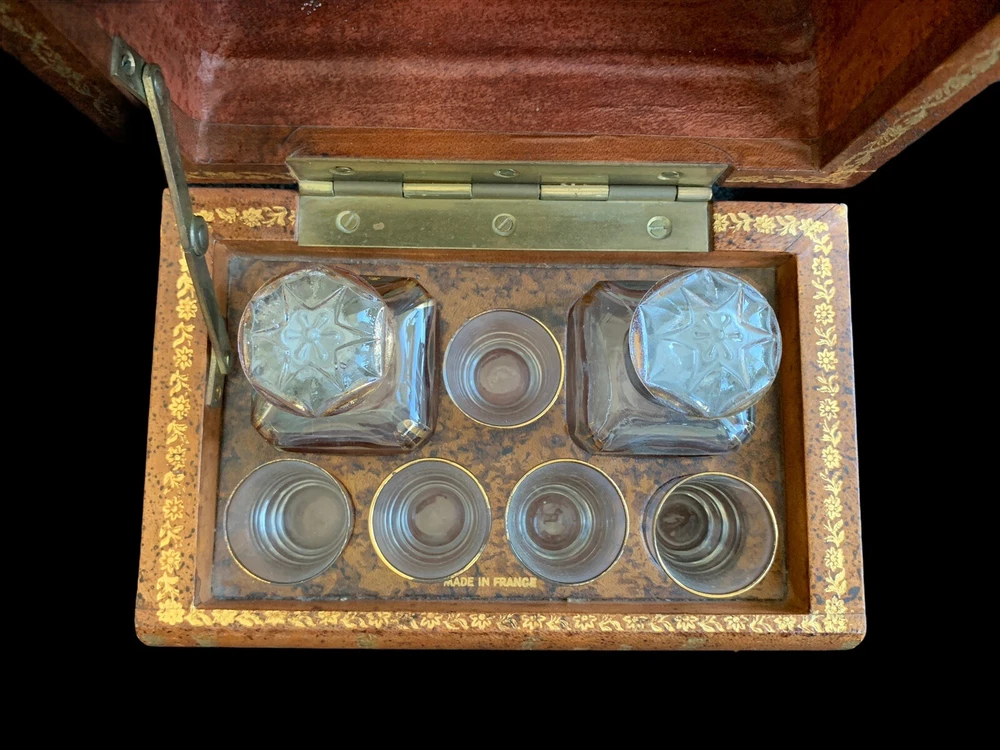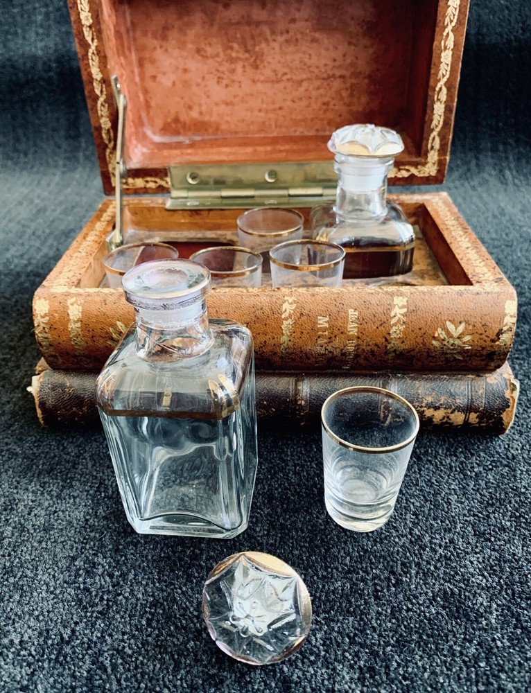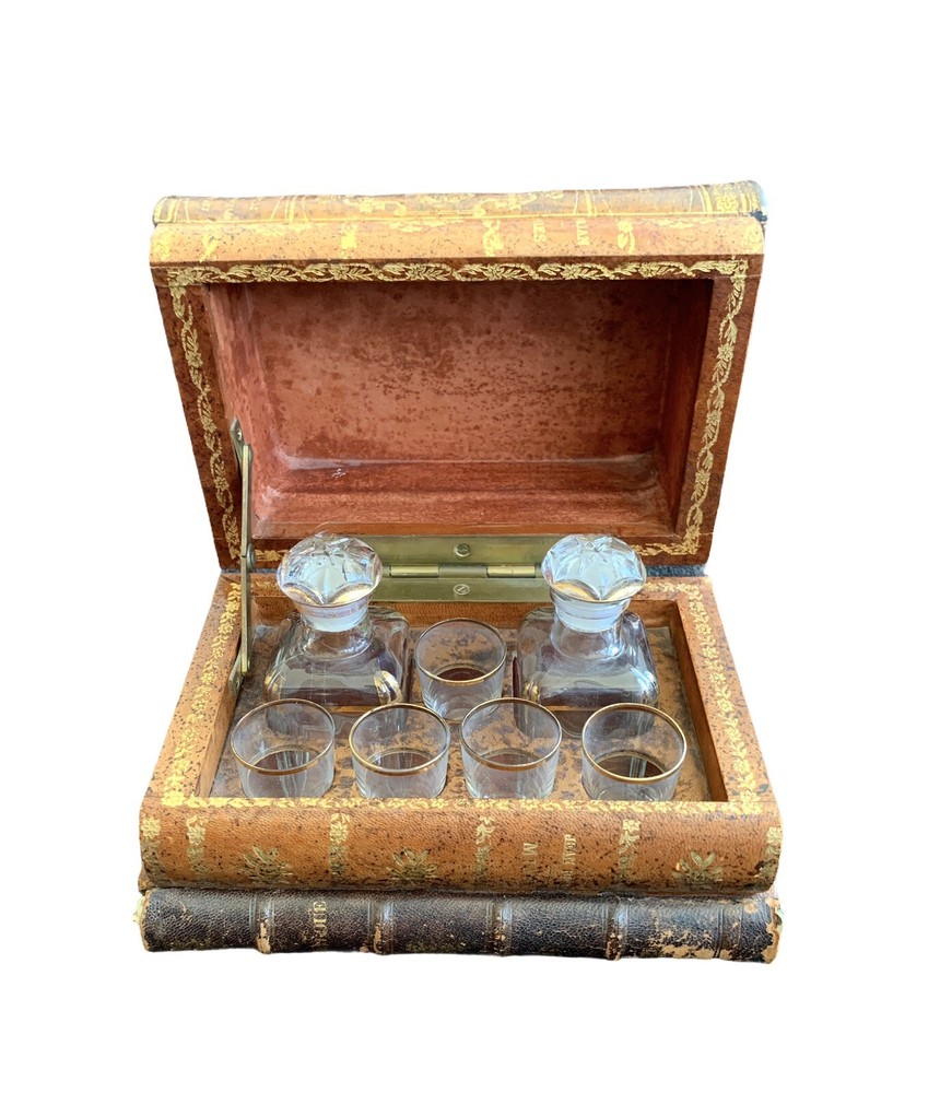 Vintage French Tantalus Leather Bound Books, 7 glass pieces 2 decanters, 5 glasses box measures approximately: 8 1/2" W x 5 5/8" D x 5 1/8" H each decanter measures approximately: 4 1/4" H x 1 7/8" square each glass measures approximately: 1 7/8" H x 1 1/4" rim diameter