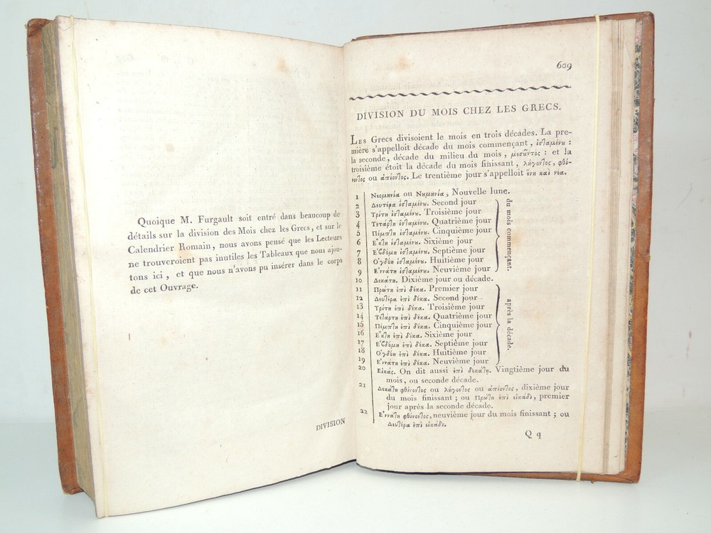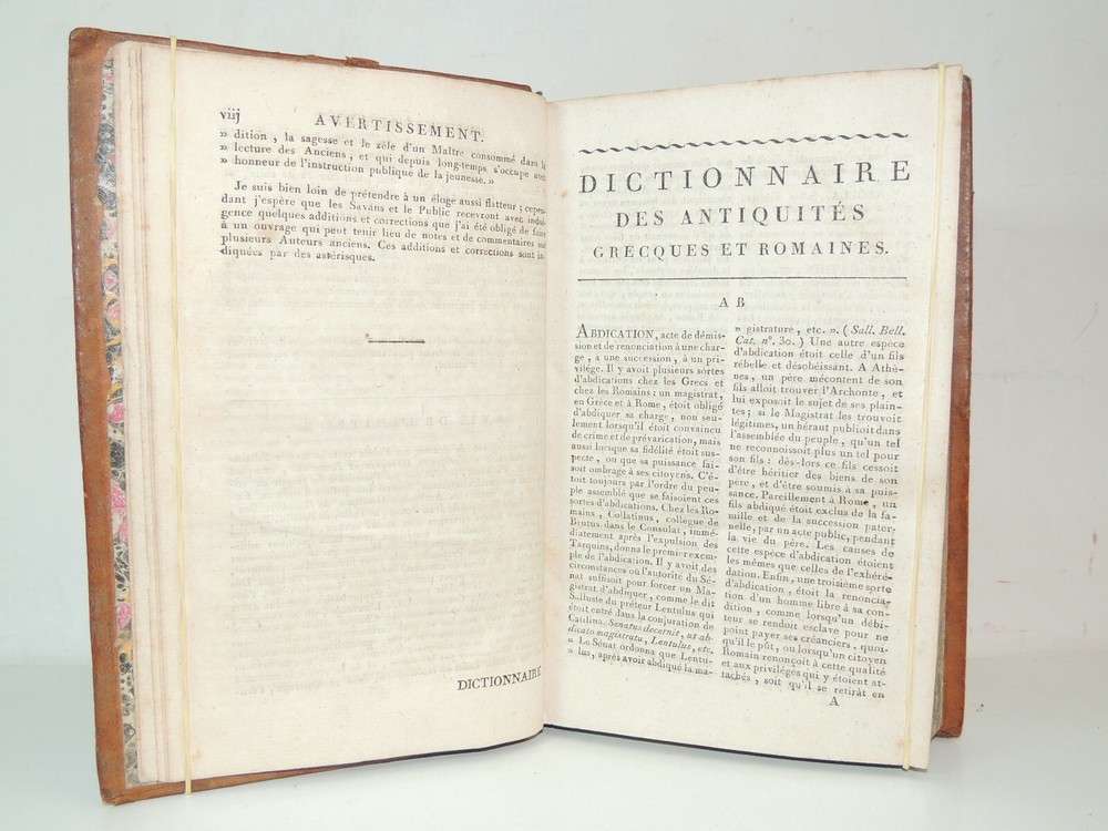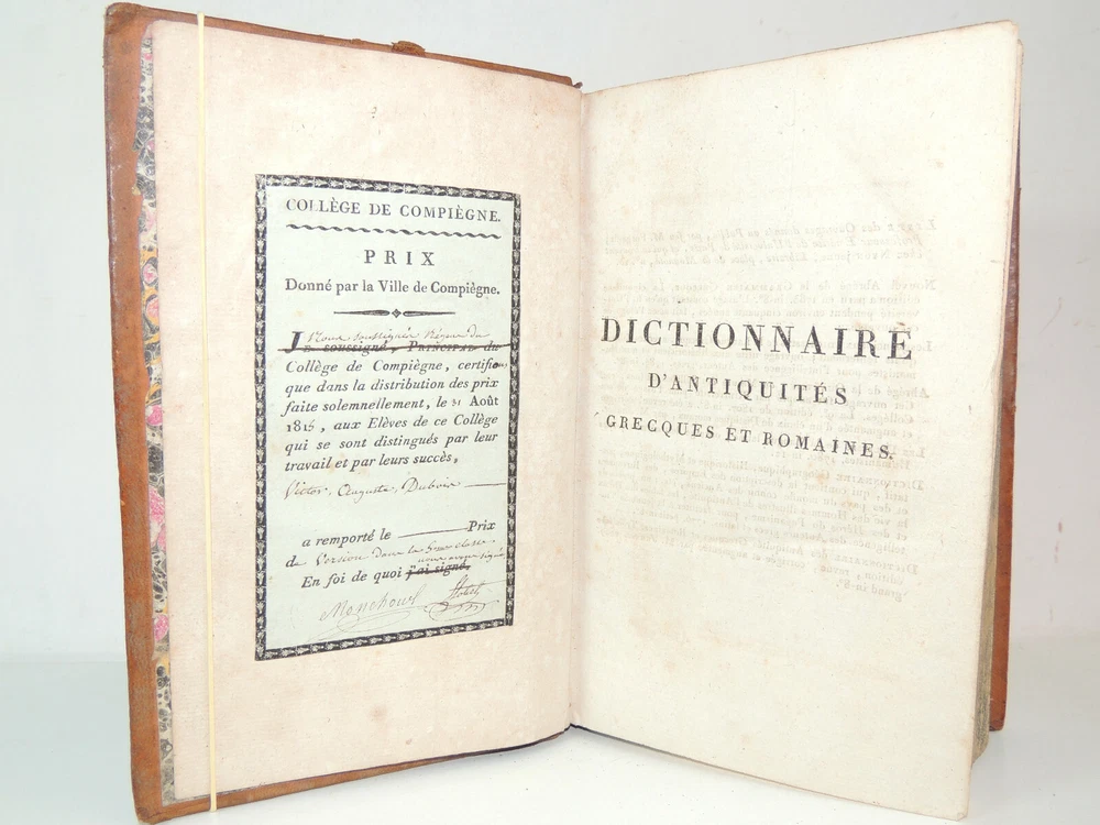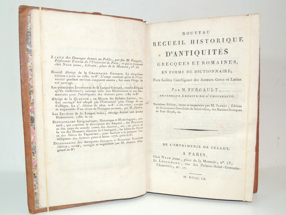 Furgault. New Historical Collection of Greek & Roman Antiquities The description of this item has been automatically translated. If you have any questions, please feel free to contact us. New historical collection of Greek & Roman Antiquities in the form of a dictionary to facilitate the understanding of Greek & Latin authors By Mr. Furgault Third edition, revised and expanded by M. Jannet Complete in a large volume in8, 21x14, bound in full period sheepskin, solid, good interior condition, mottled edges, 623 pp. Laminated, mentions of the Collège de Compiègne awards ceremony. Paris, at Nyon, 1809 ref/240 New historical collection of Greek & Roman Antiquities in the form of a dictionary to facilitate the understanding of Greek & Latin authors By Mr. Furgault Third edition, revised and expanded by M. Jannet Complete in a large volume in8, 21x14, bound in full period sheepskin, solid, good interior condition, mottled edges, 623pp. Laminated, mentions of the Collège de Compiègne awards ceremony. Paris, at Nyon, 1809 ref/240 Reliure Cuir Caractéristiques spéciales Édition originale Langue Français Sujet Histoire Époque XVIIIème
