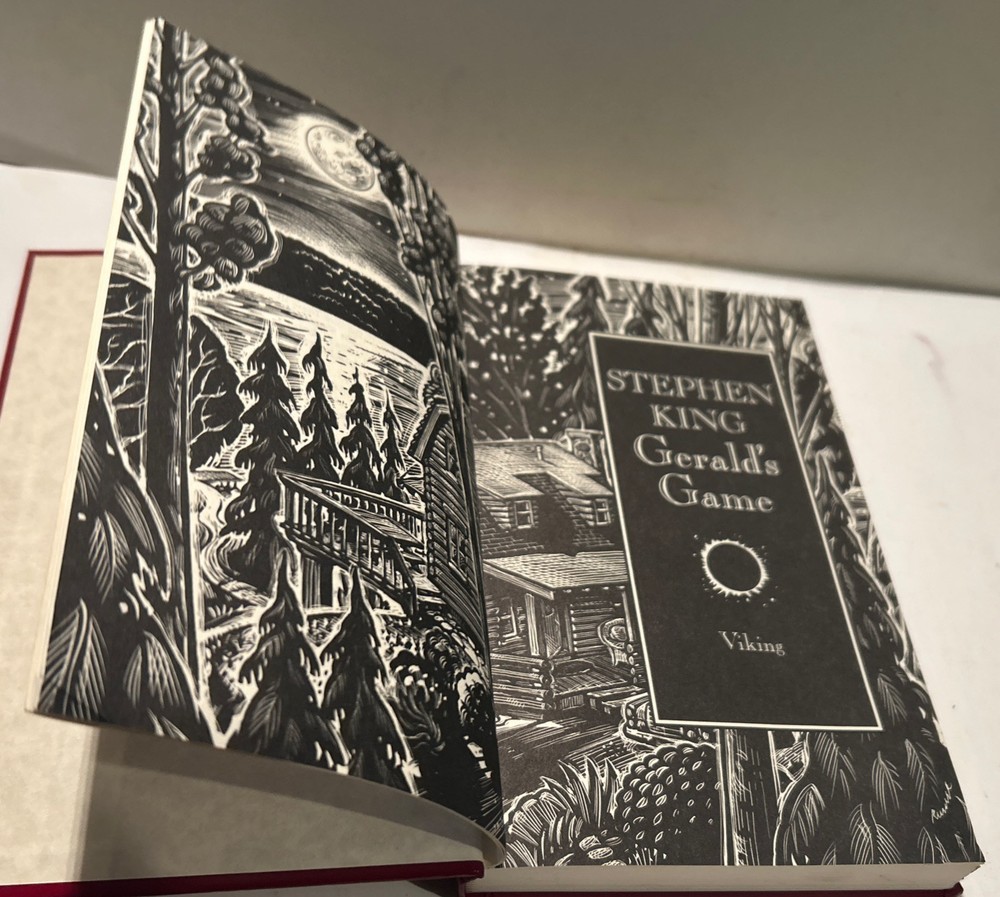 For your careful consideration here is a very nice copy of GERALD'S GAME - by STEPHEN KING. It is the Stephen King Library Book Club Edition bound in Red Faux Leather, now out-of-print. ITEM CONDITION NOTES: Excellent/Fine copy. Clean and unmarked with tight/square binding and very mininal cover wear (if any). PLEASE SEE ALL PHOTOS BEFORE BUYING. Calculated Shipping via USPS Media Mail or Carrier of Buyer's Choice (UPS Ground, FEDEX Ground or Home Delivery, USPS Priority Mail).