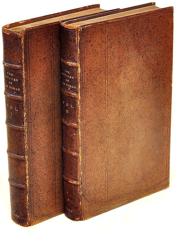 [GOLDSMITH, Oliver]. The Citizen of the World on Letters from a Chinese Philosopher residing in London to his friends in the East. London: by J. Newberry, 1762. FIRST COLLECTED EDITION. 2 volumes, our copy with the following issue points, "Printed for the Author" on titlepage, page "vii" misnumbered "v" in volume 1 and the "i" in the catchword "mazing" on page 11 in volume 2 is out of alignment. Bound in early full speckled calf, raised bands, gilt lettered spines, head and foot of spine of volume 1 rubbed with some slight loss, hinges rubbed but covers firmly attached, text clean and bright throughout. Who we are - D&D Galleries was founded in 1985. We are members of the Antiquarian Booksellers Association of America (ABAA), the International League of Antiquarian Booksellers (ILAB), and the Provincial Bookfair Association of Great Britain (PBFA). So bid and buy with confidence. Our inventory (largely English language only) is slightly eclectic and ranges from the 16th through the 20th centuries with sub-specialties in S.T.C. and Wing books, Lewis Carroll, Charles Dickens, presentation and association material as well as 17th and 18th C. British history, sets and bindings. Terms - Any item(s) may be returned with 7 days for a full refund if found to be not authentic or substantially at odds with our description or pictures. Items returned must be received in the same condition and completeness as sent.